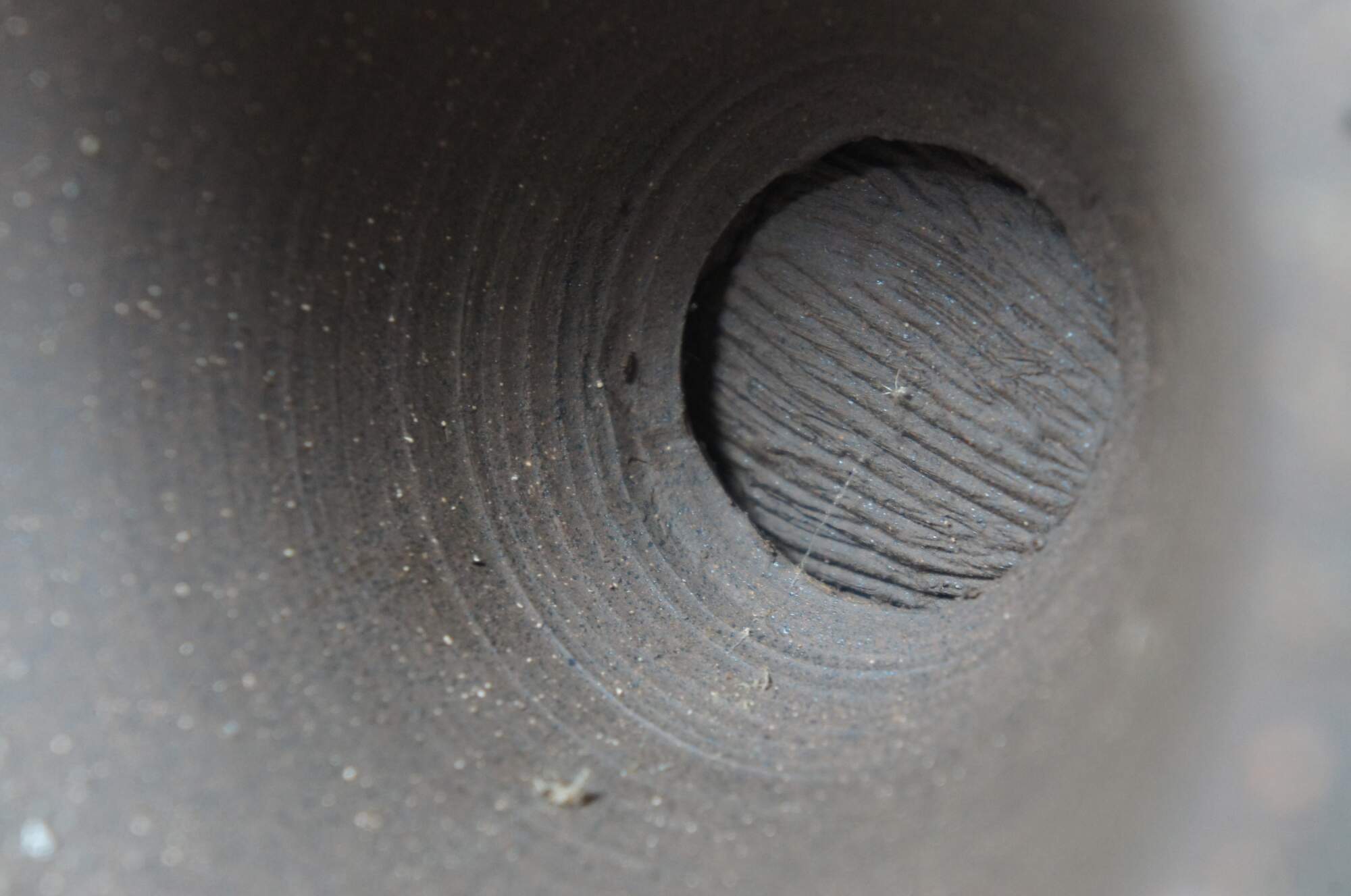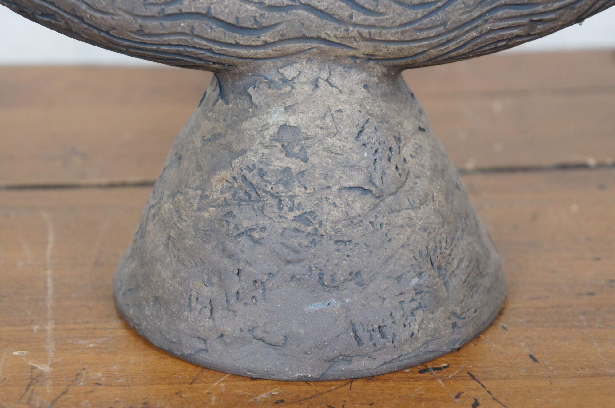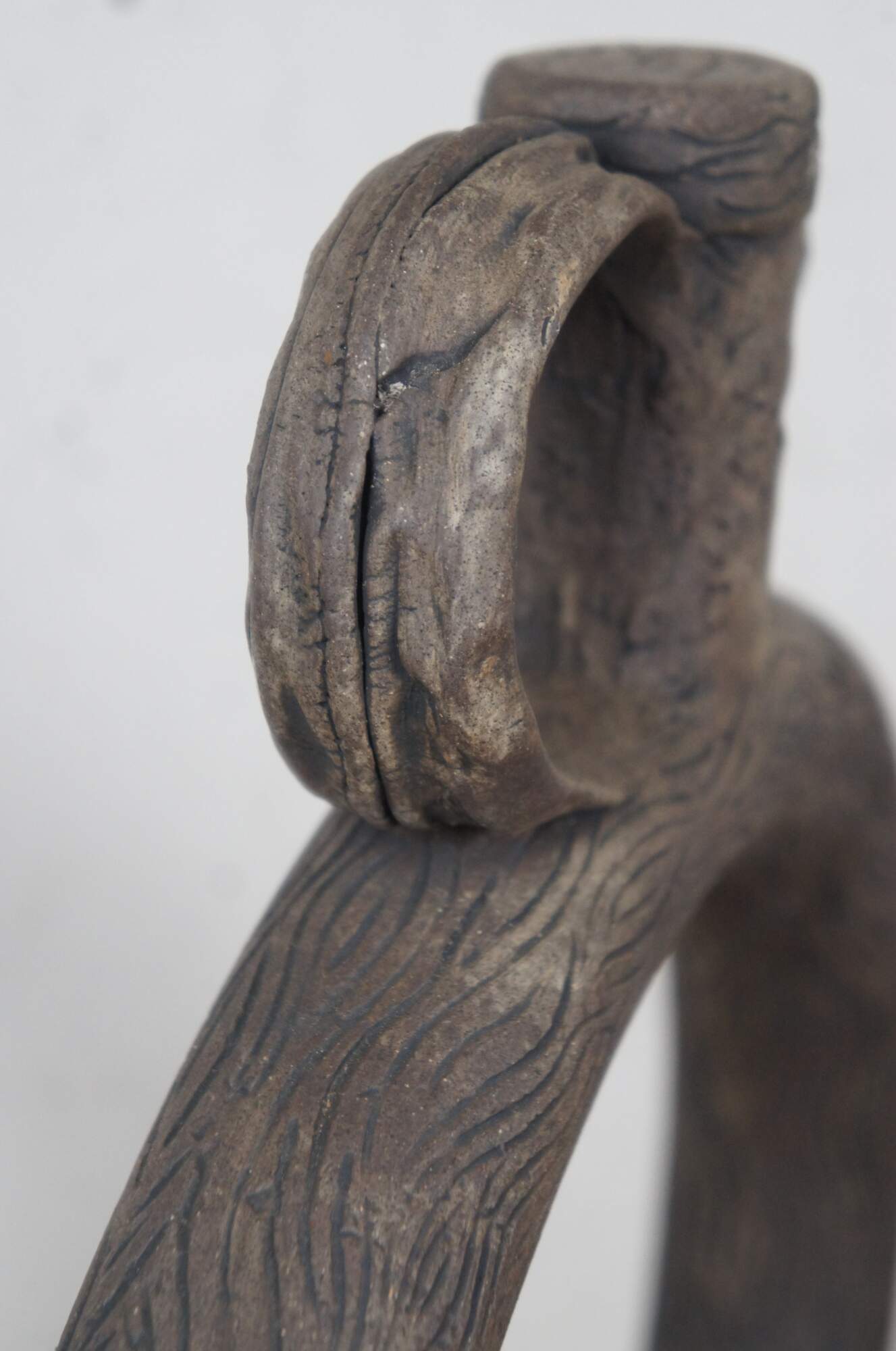 20th century unglazed brown art pottery decanter jug / bottle / pitcher with conical base, faux stopper, and handcrafted wood grain / tree bark texture.