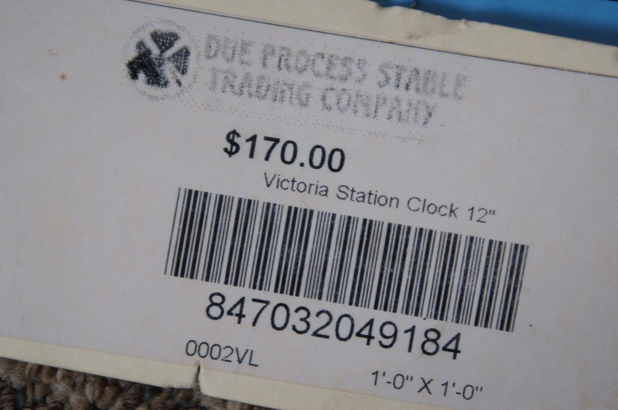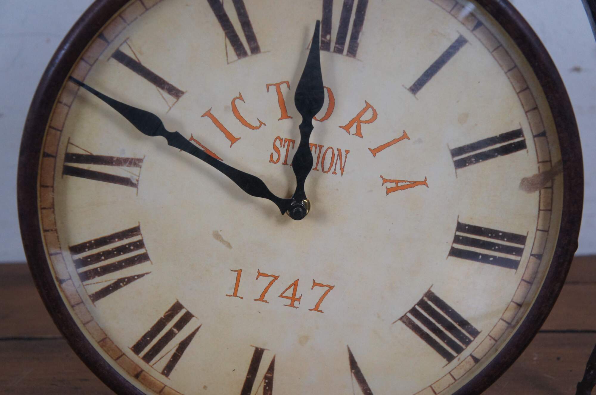 Late 20th century double sided railway clock styled after the famous clock at Victoria Station, London. Wrought metal wall mounted support and case in a dark bronze finish. 12 inch diameter printed face with faux distressing, Roman numerals, and the words Victoria Station 1747 in orange. Black metal hands. Young Town Quartz, battery operated movement.