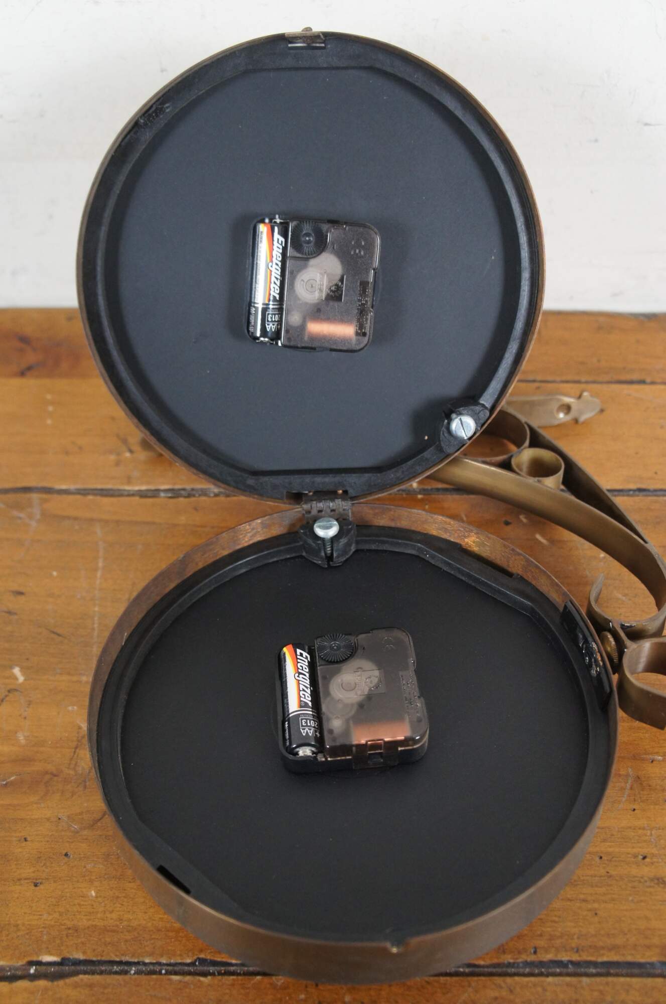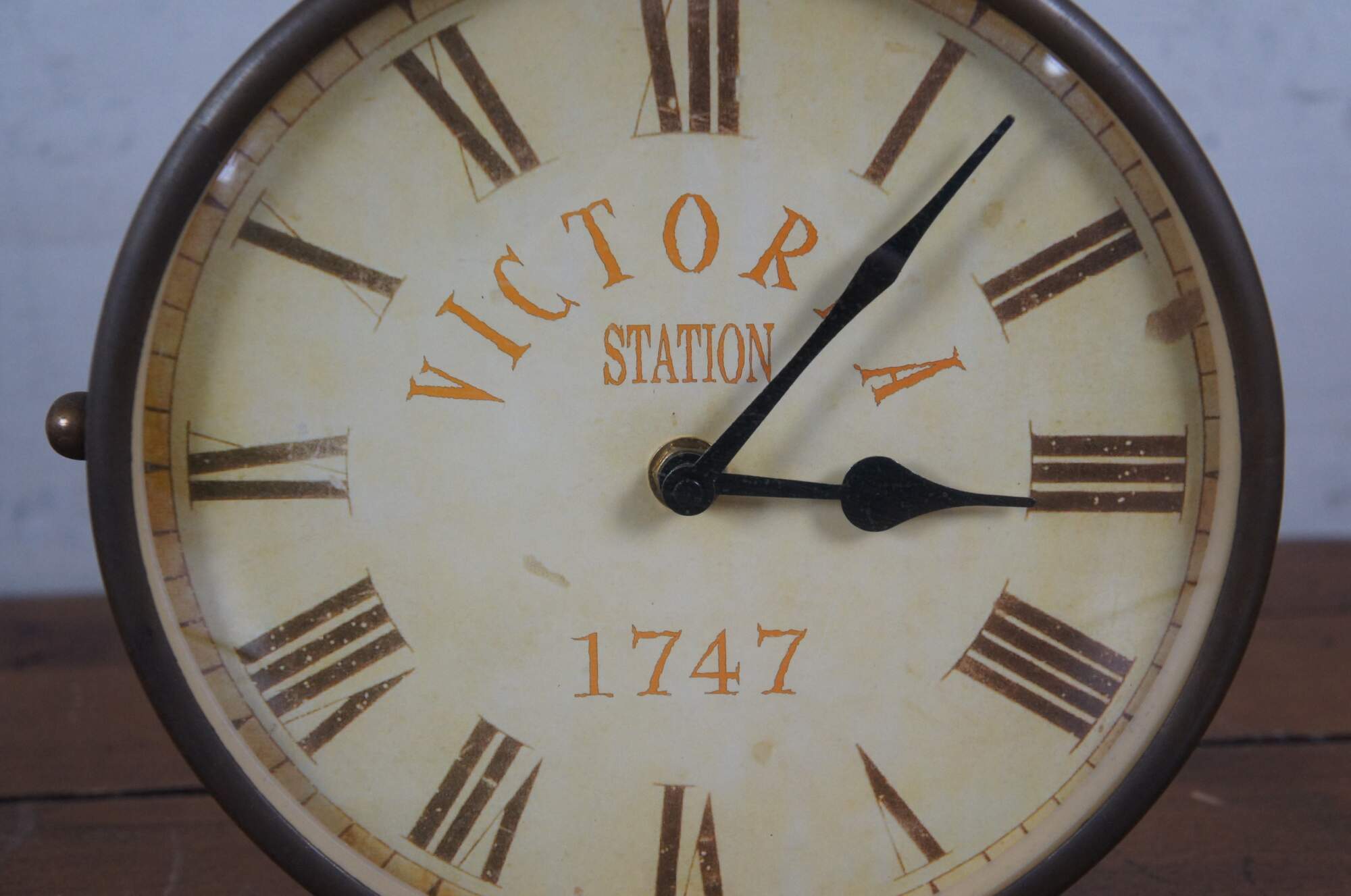 3 Available - Late 20th century double sided railway clock styled after the famous clock at Victoria Station, London. Wrought metal wall mounted support and case in a dark brass finish. 8 inch diameter printed face with faux distressing, Roman numerals, and the words Victoria Station 1747 in orange. Black metal hands. Young Town Quartz, battery operated movement.