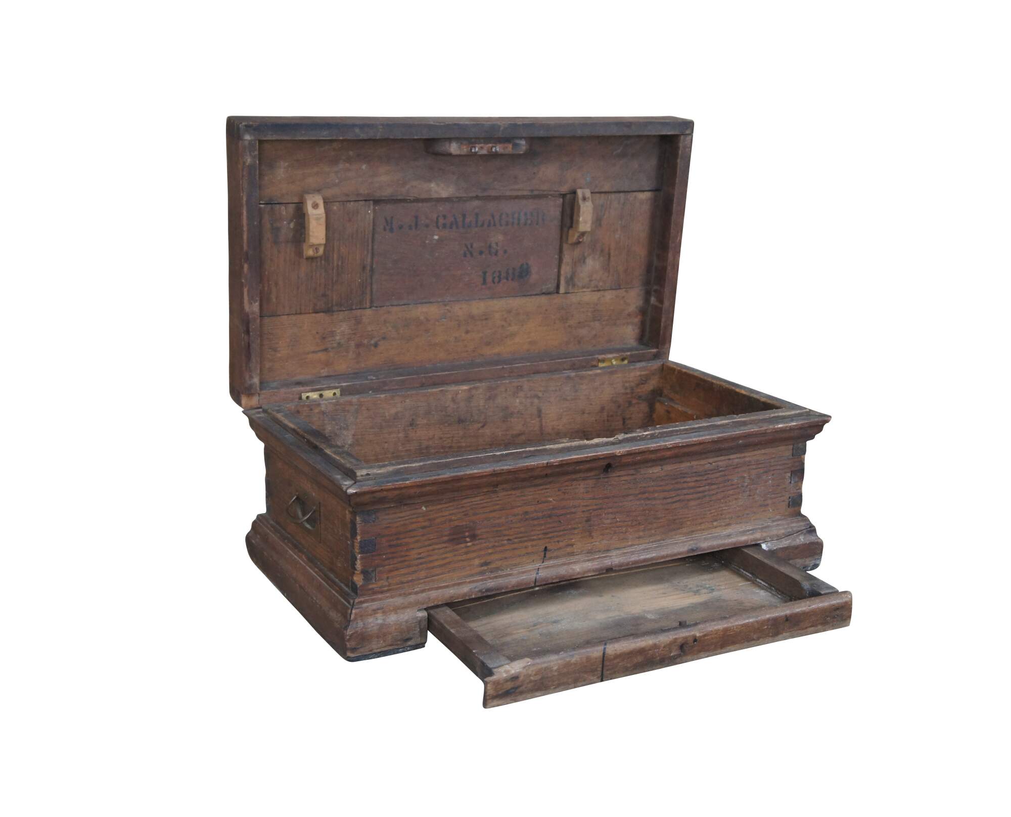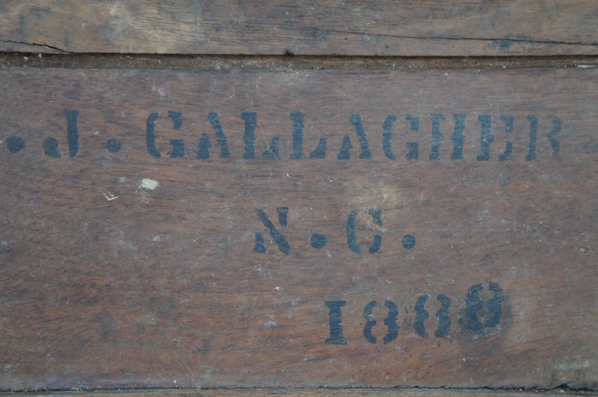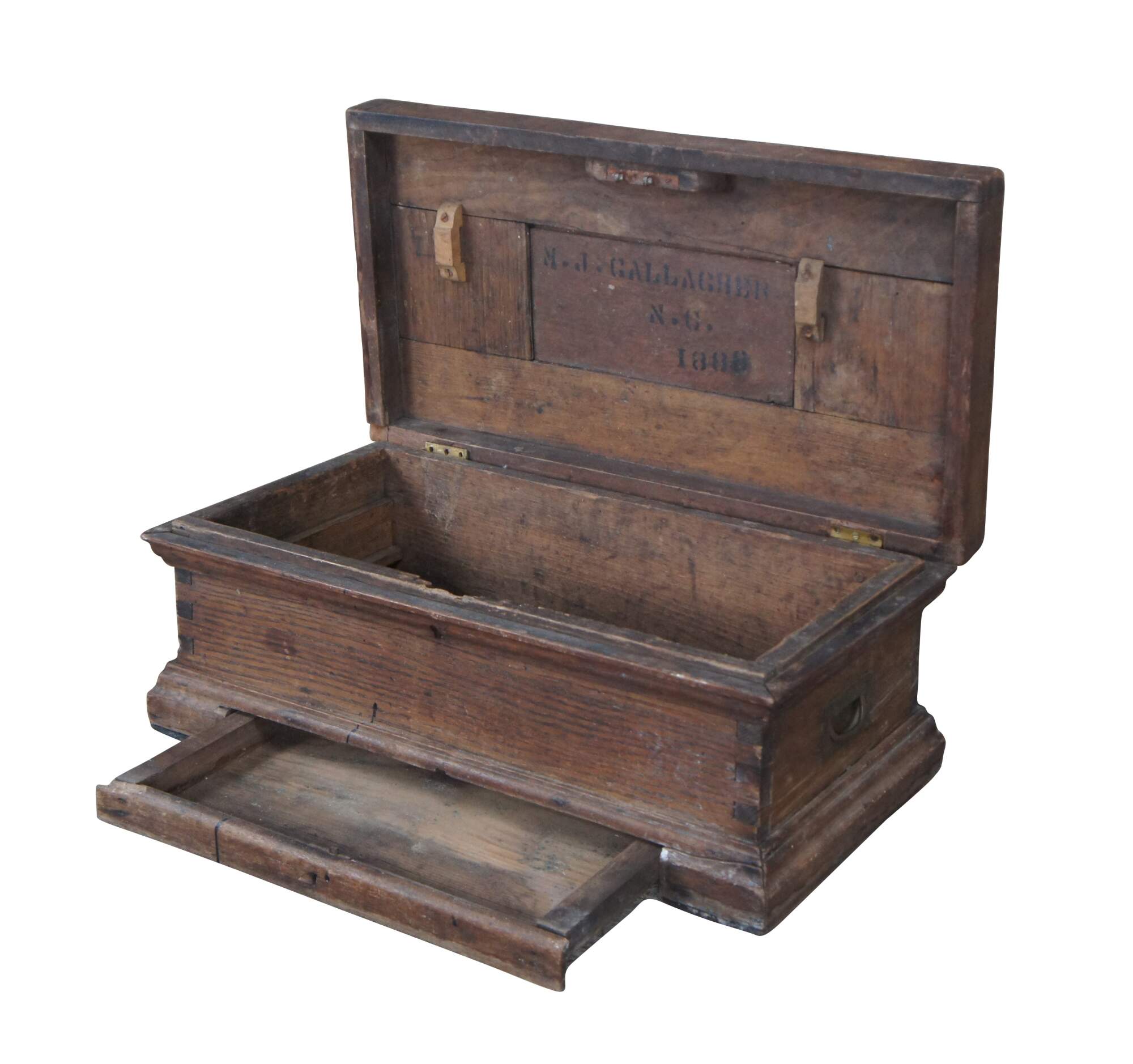 A charming late 19th century tool chest from M.J. Gallagher of North Carolina, Dated 1888. The trunk appears to be a carpenter or machinists trunk but could have also been used in military setting. Made from oak with finger-tailed construction. Features brass handles along the sides.