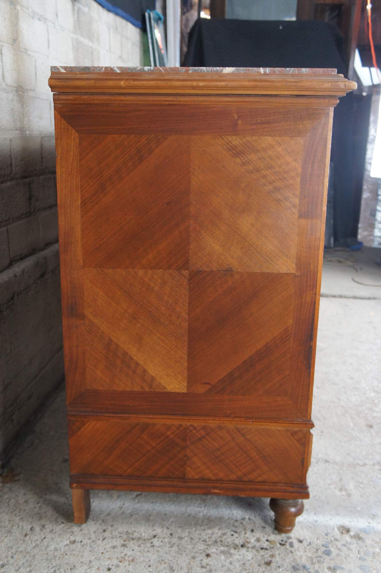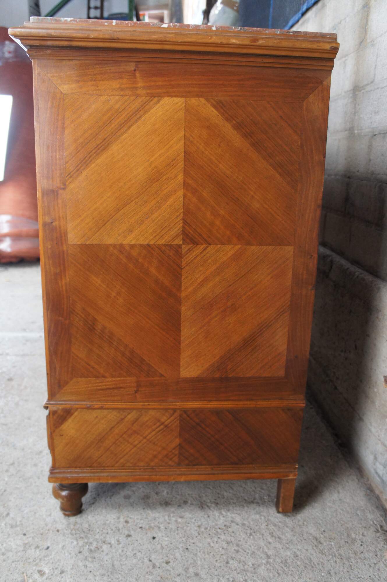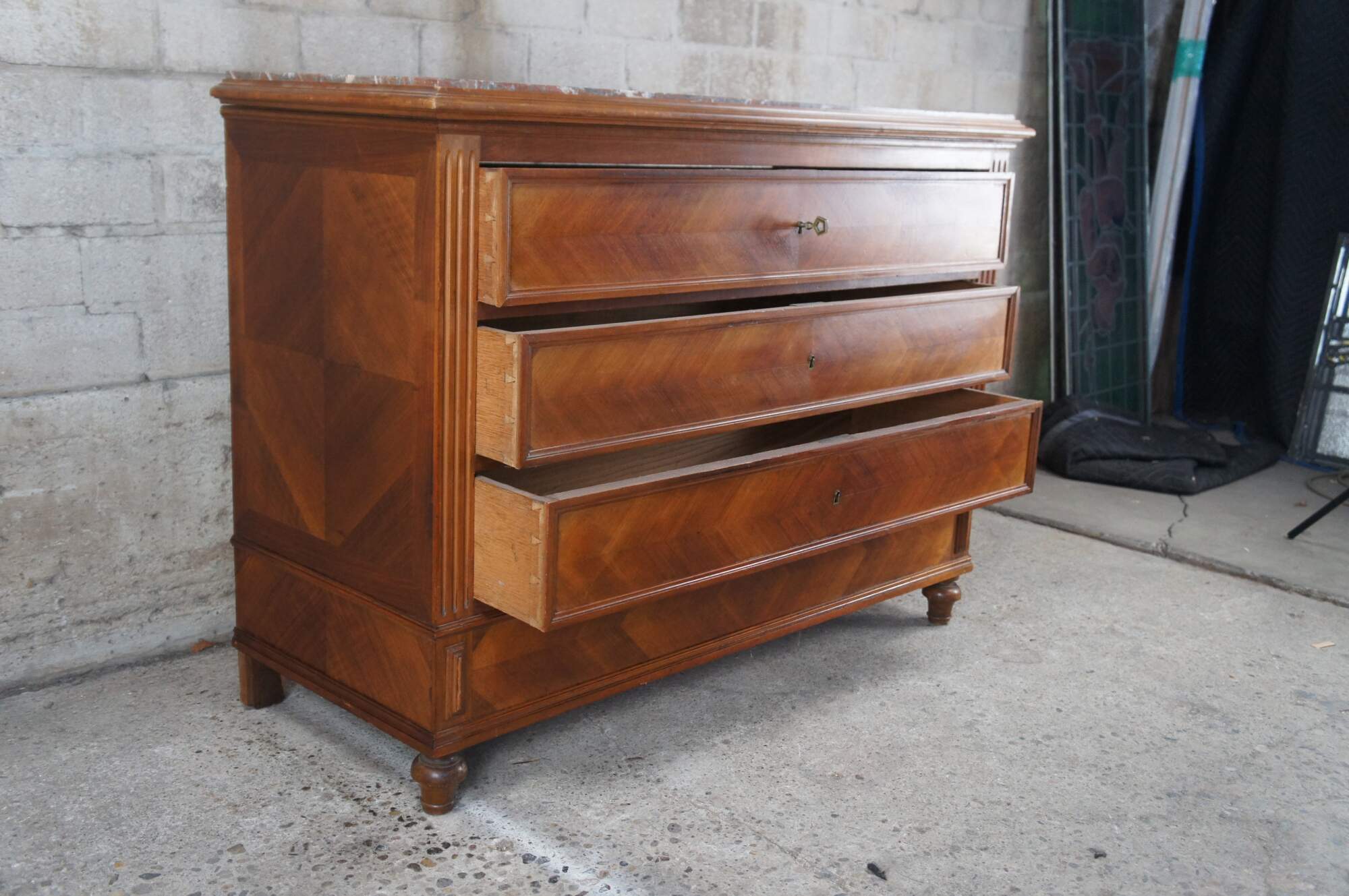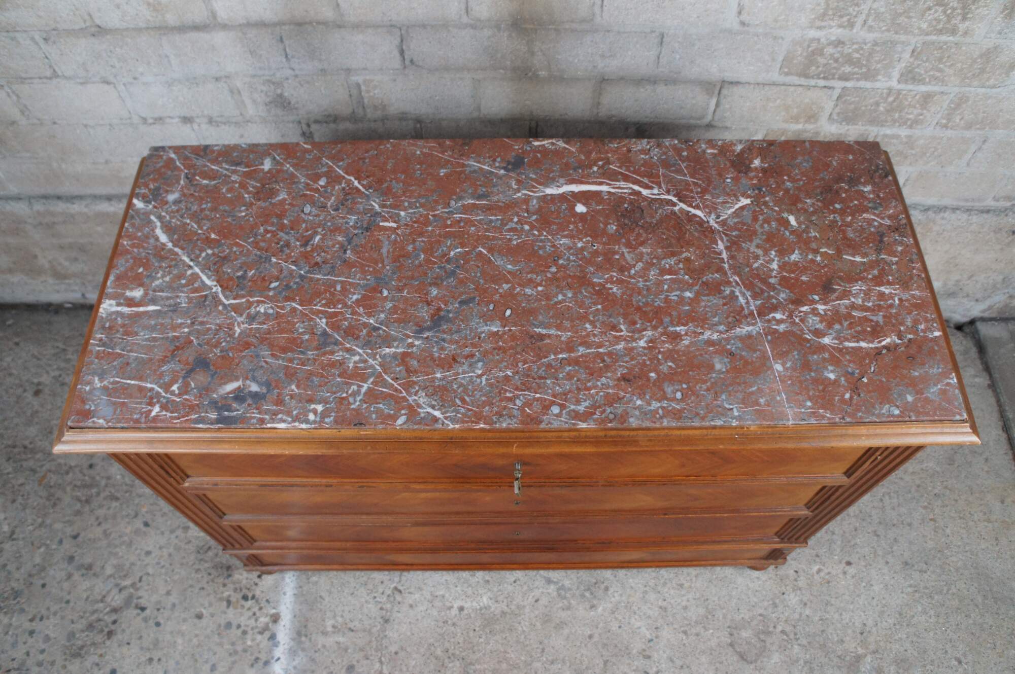 An exceptional 19th Century Louis Philippe Commode. Made from walnut with three hand dovetailed oak drawers. Features a recessed drawer configuration with fluted stiles, inset royal rouge marble top and bun feet. The chest has matchbook walnut front and sides showcasing a beautiful parquetry design. Drawers open via pentagon shaped key.