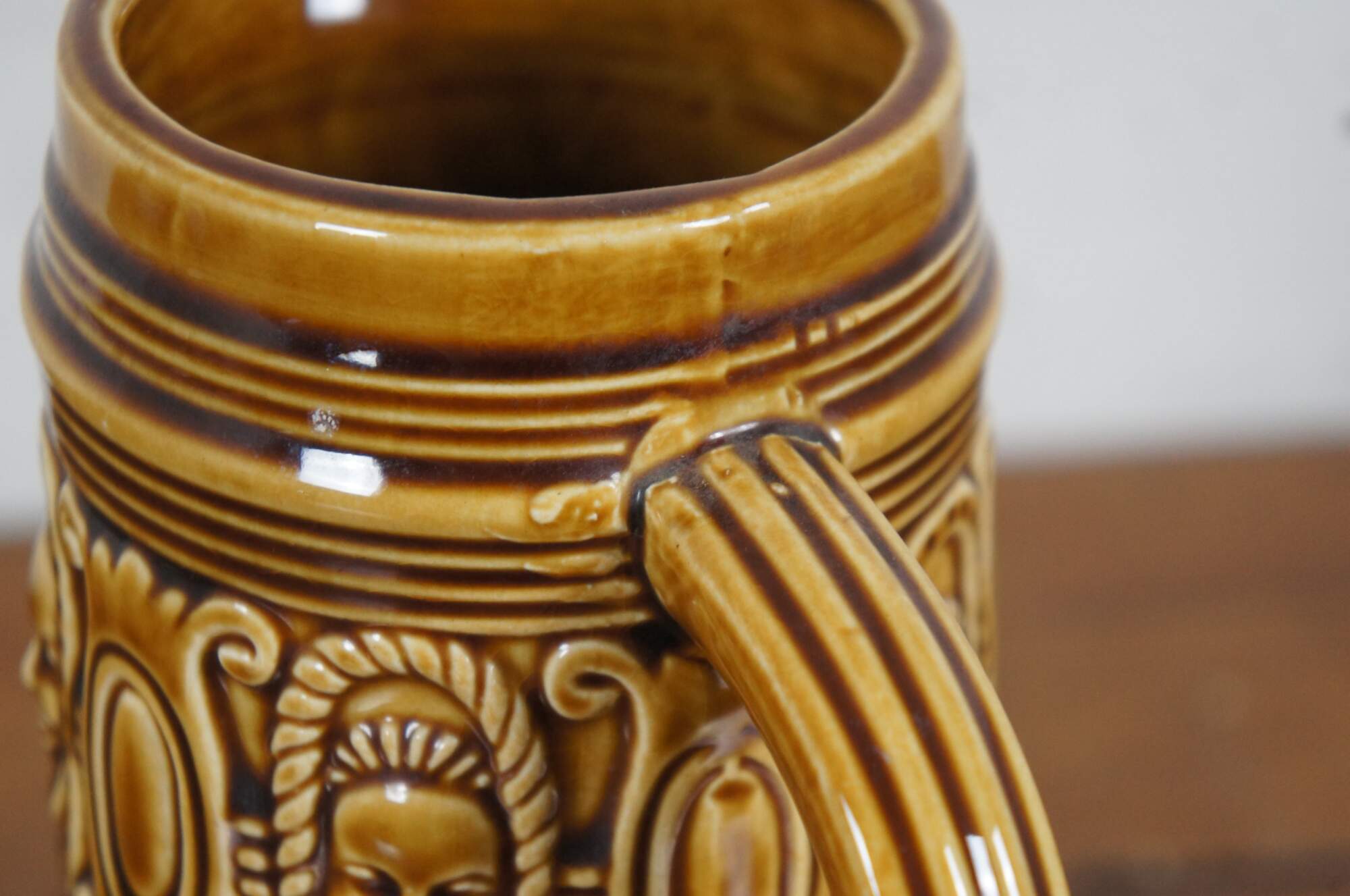 Mid century yellow porcelain / ceramic pitcher / jug featuring a German Black Forest inspired motif of busts, dancing figures, and elfin / grotesque faces. Made in Japan.