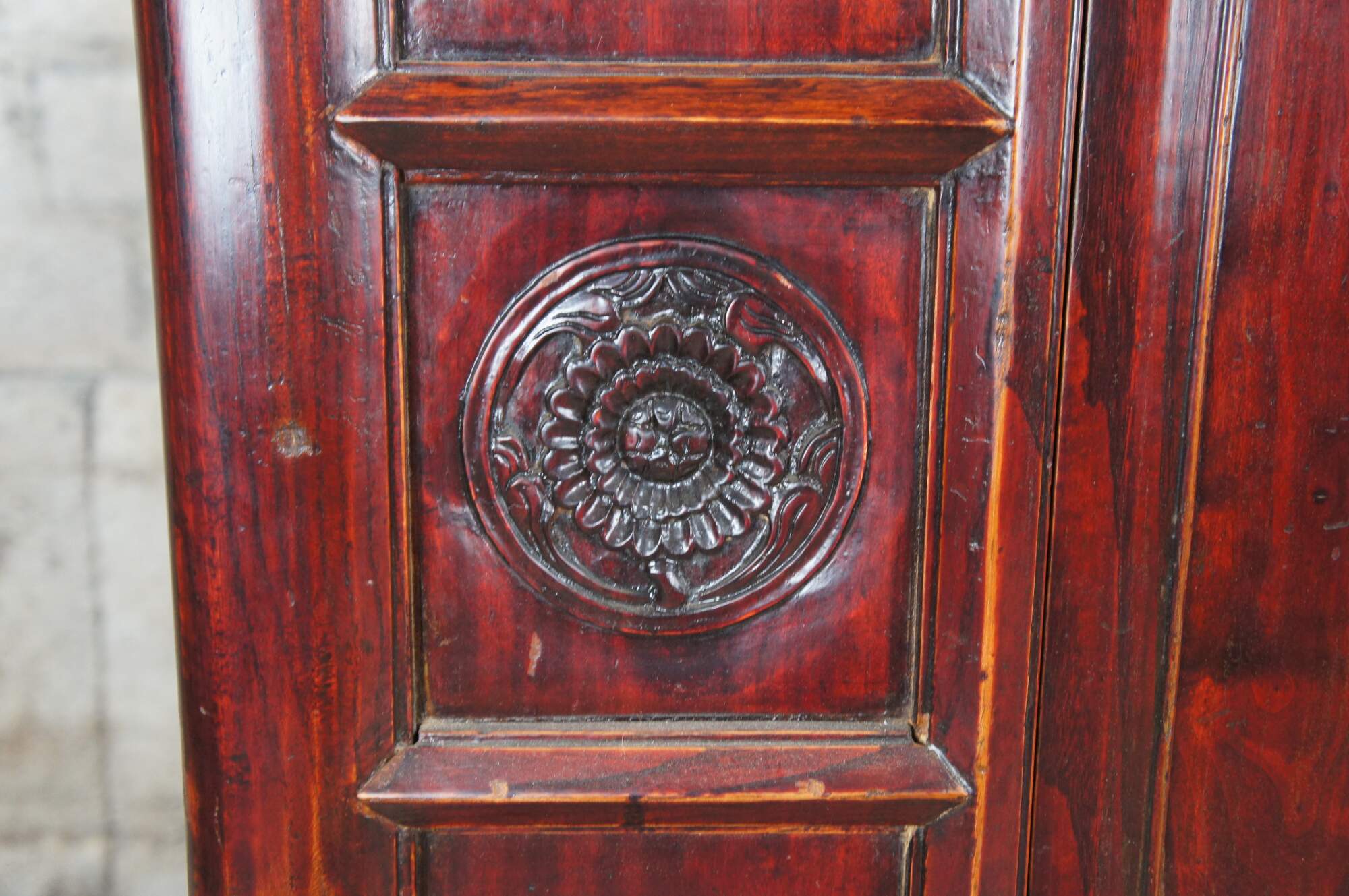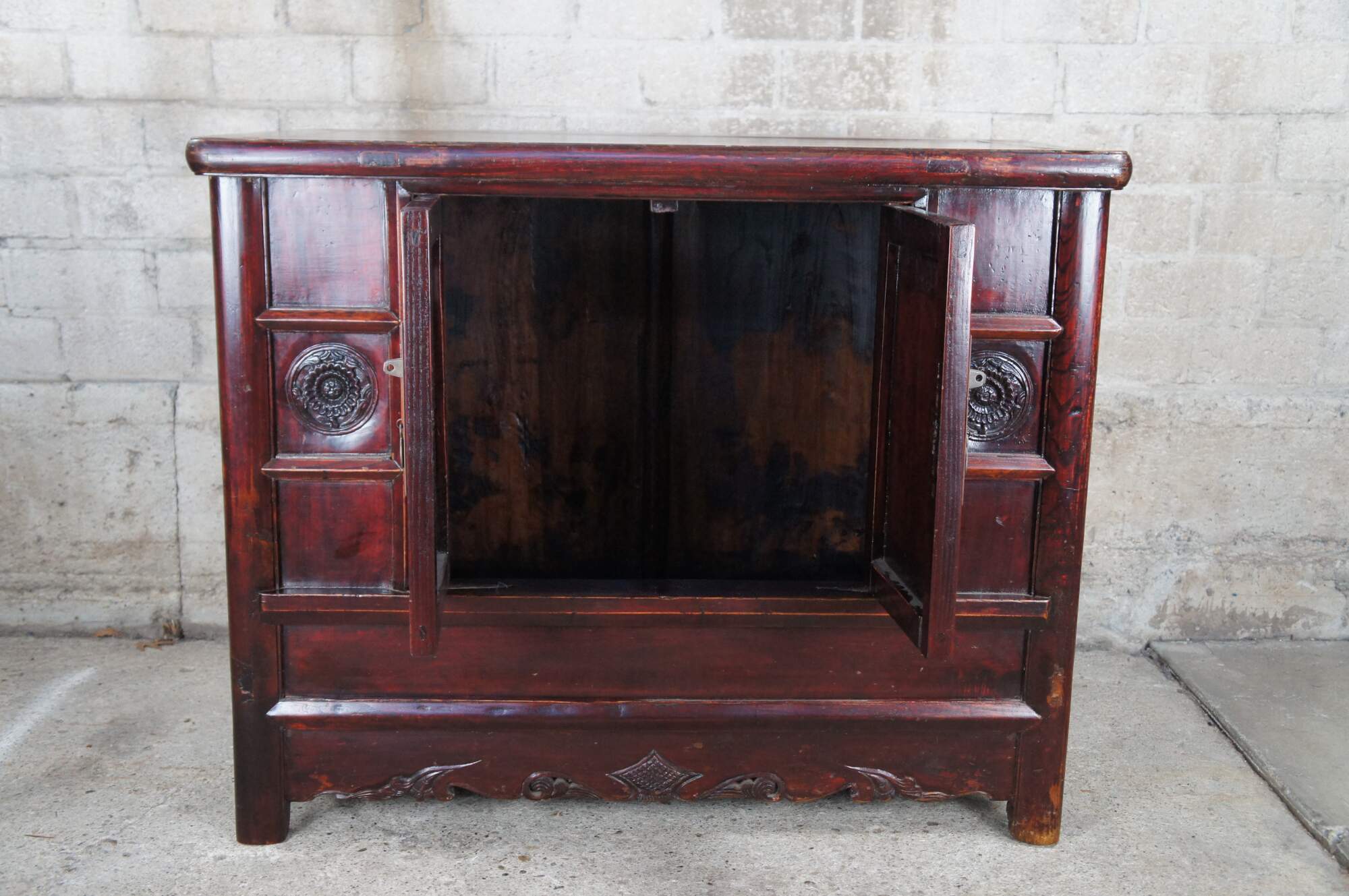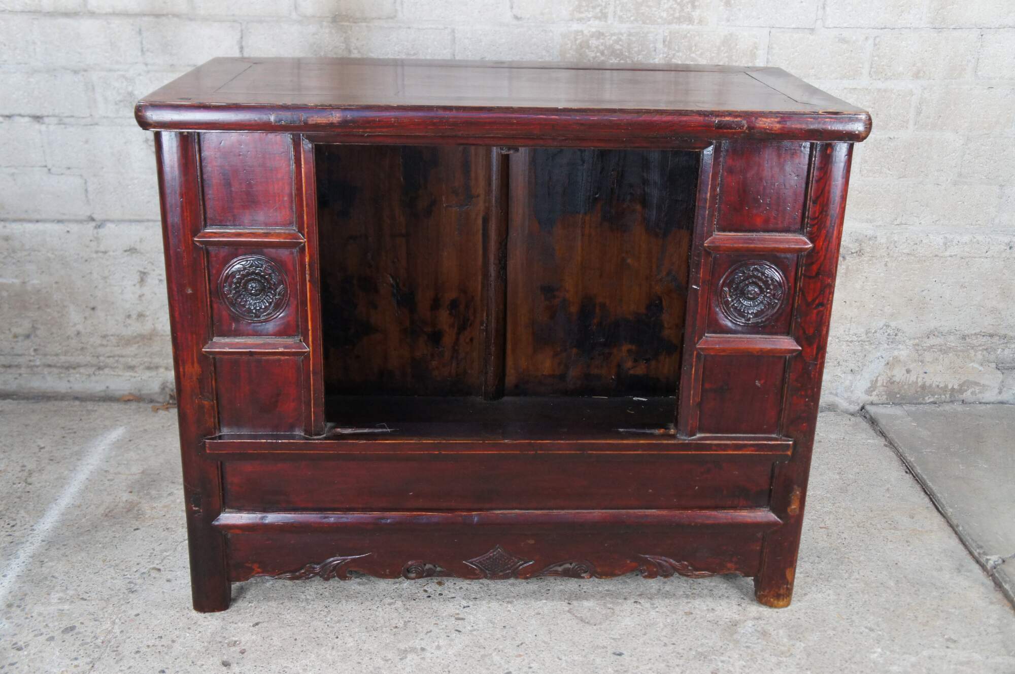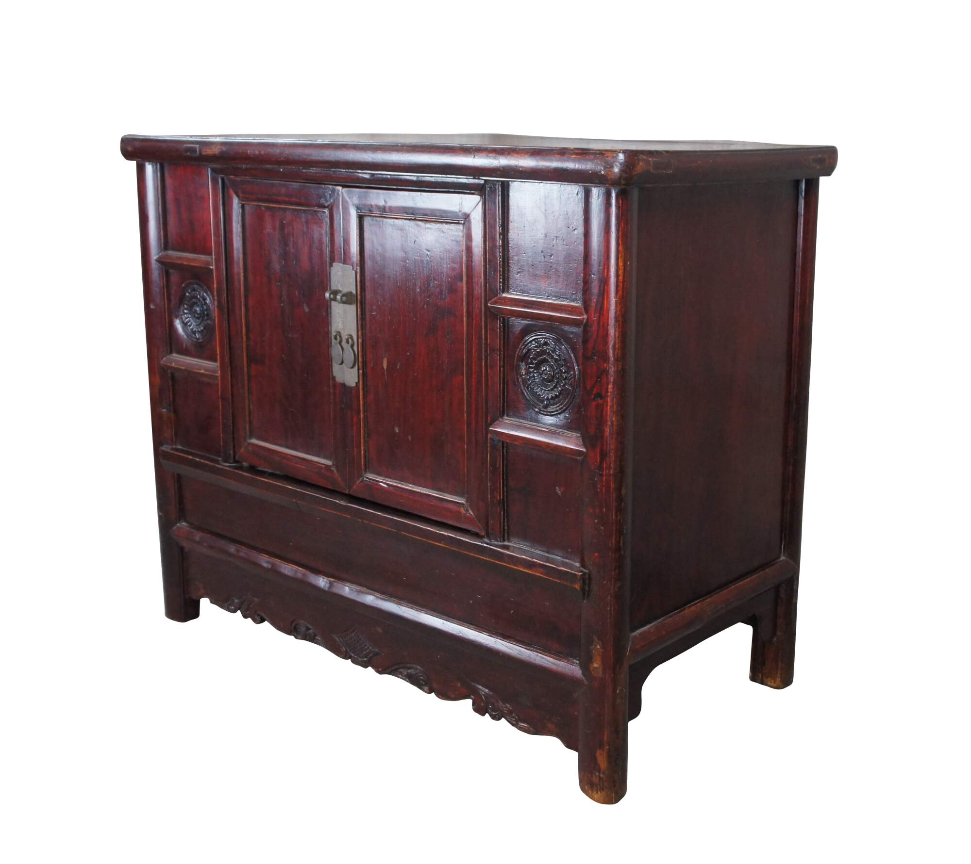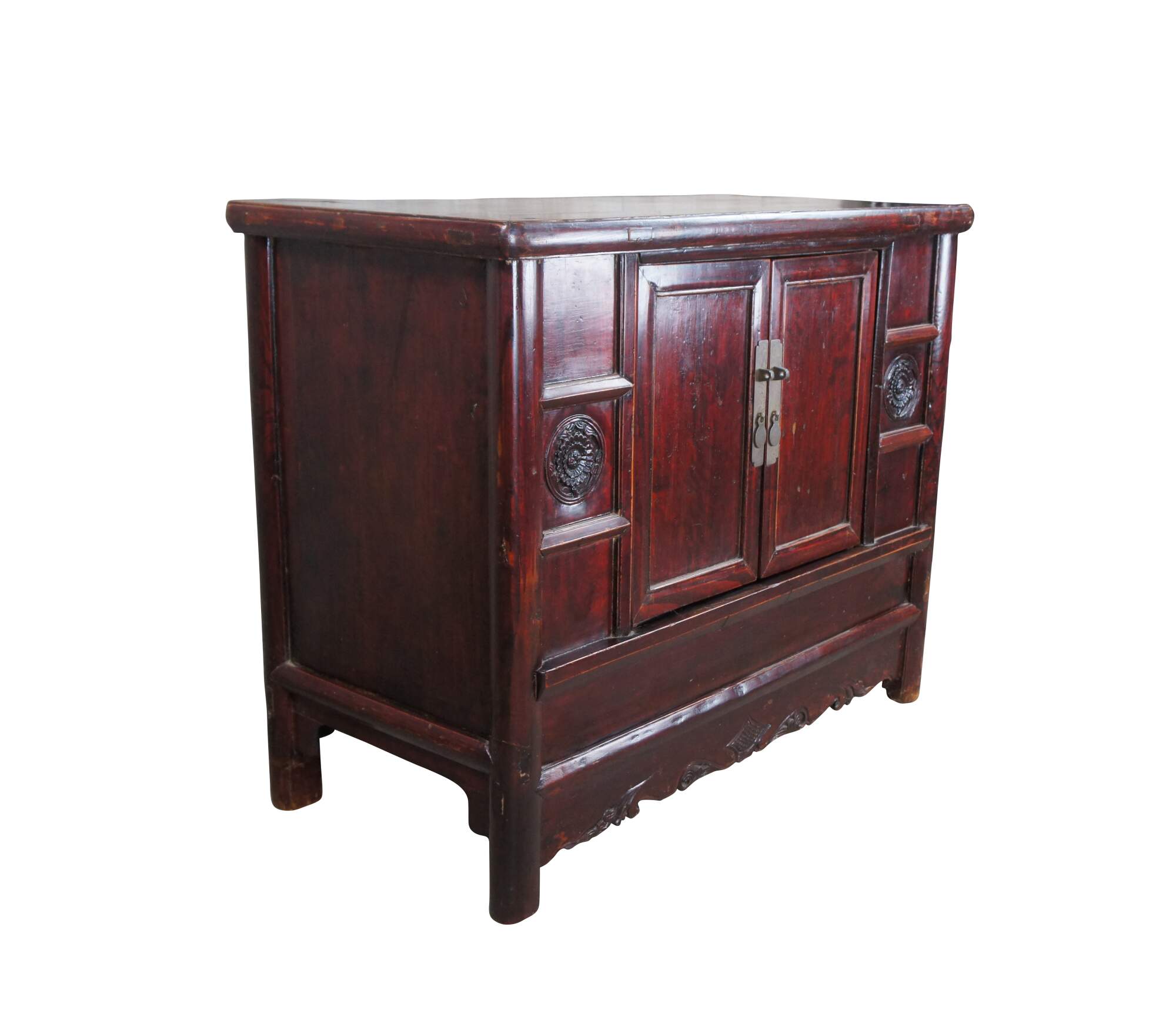 Late Qing Dynasty red lacquer Storage Chest or sideboard. Made in Shanxi North Eastern China, circa 1880s. Features a simple rectangular frame with two doors at the center flanked by round carved medallions and panels. Lower apron has carved motifs. Made using mortise and tenon construction. A stately piece for any space.