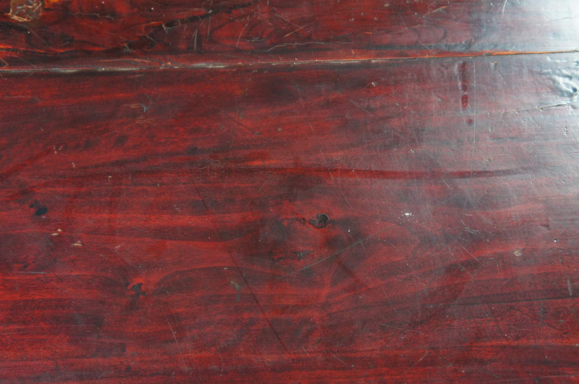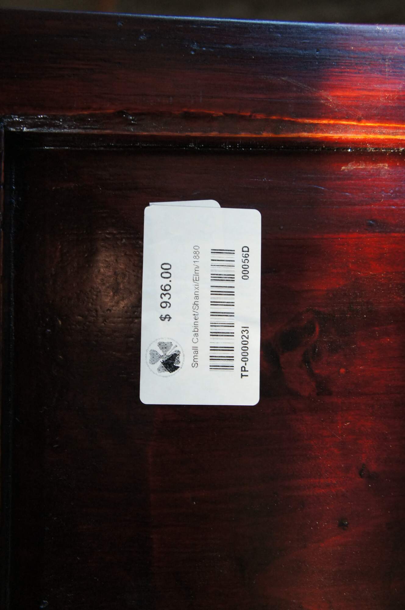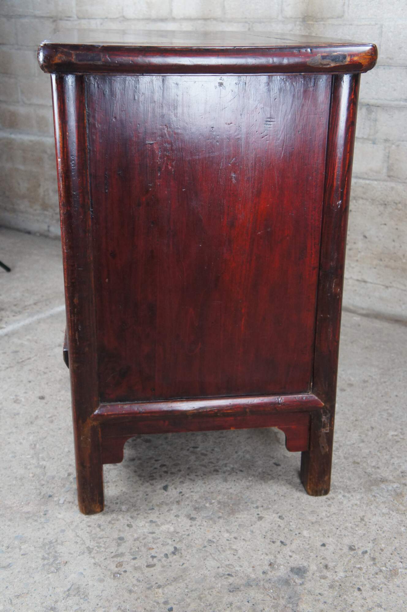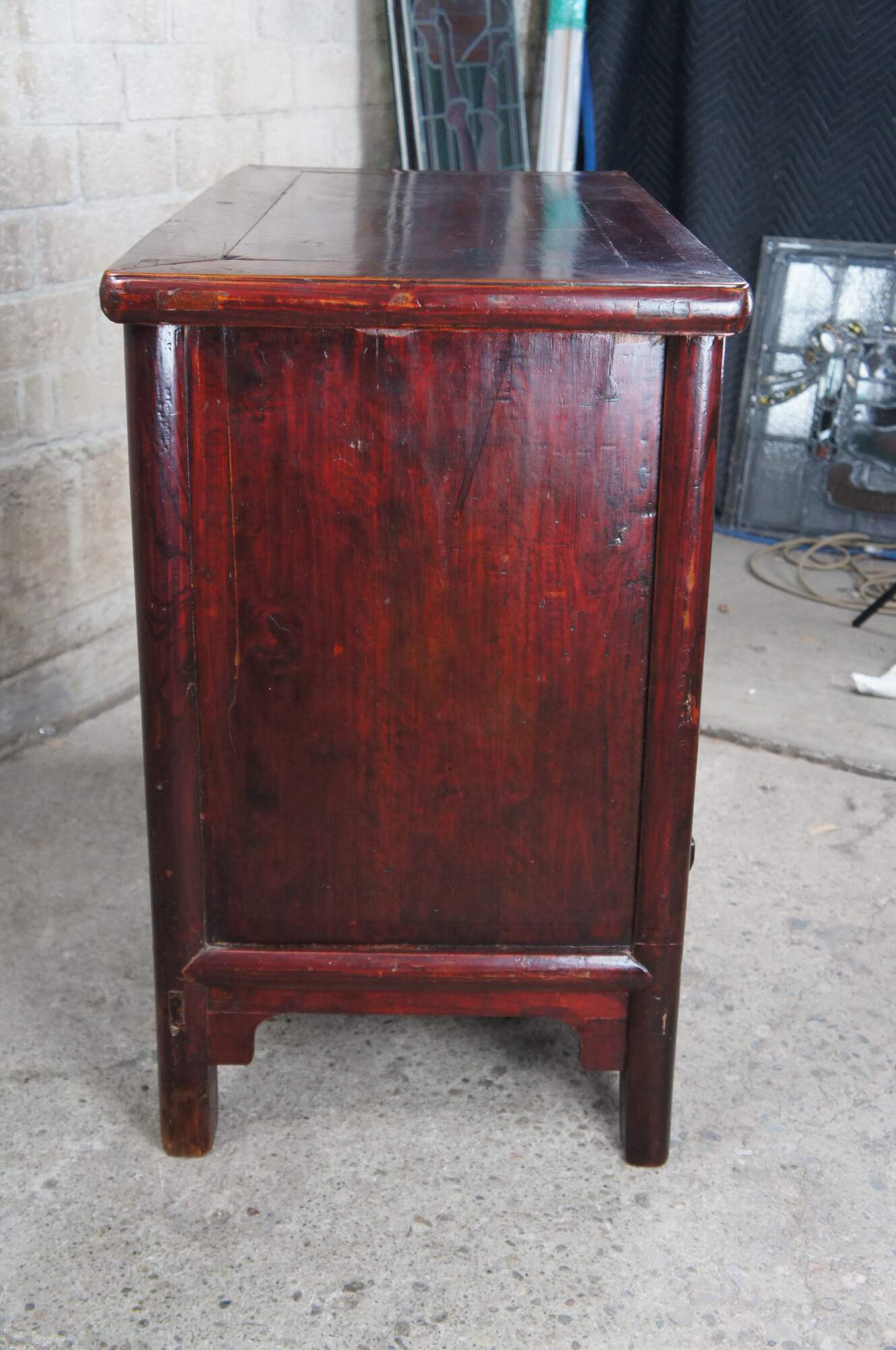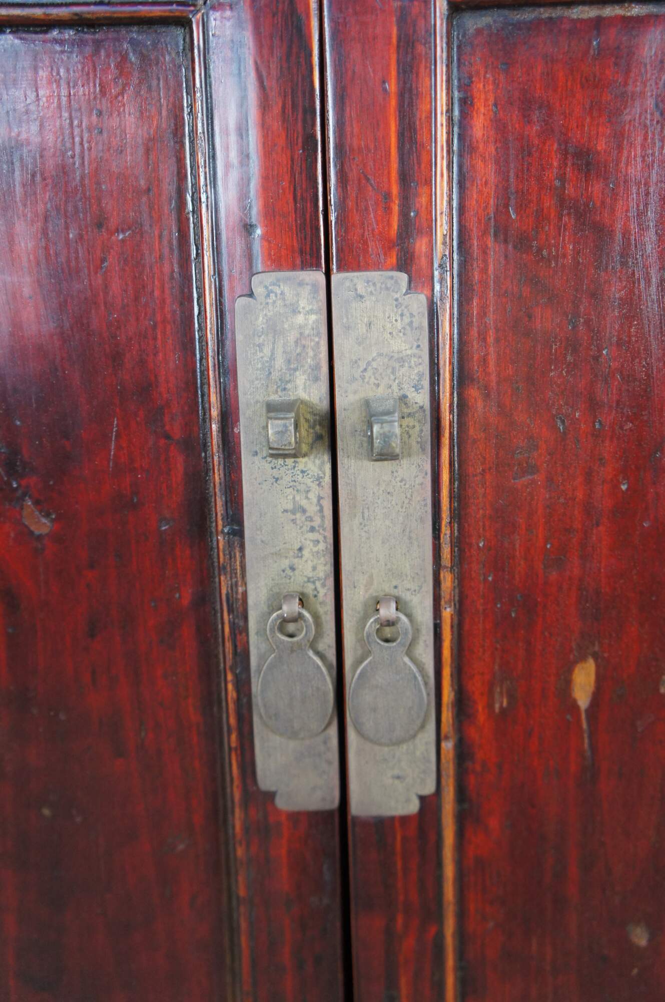 Late Qing Dynasty red lacquer Storage Chest or sideboard. Made in Shanxi North Eastern China, circa 1880s. Features a simple rectangular frame with two doors at the center flanked by round carved medallions and panels. Lower apron has carved motifs. Made using mortise and tenon construction. A stately piece for any space.