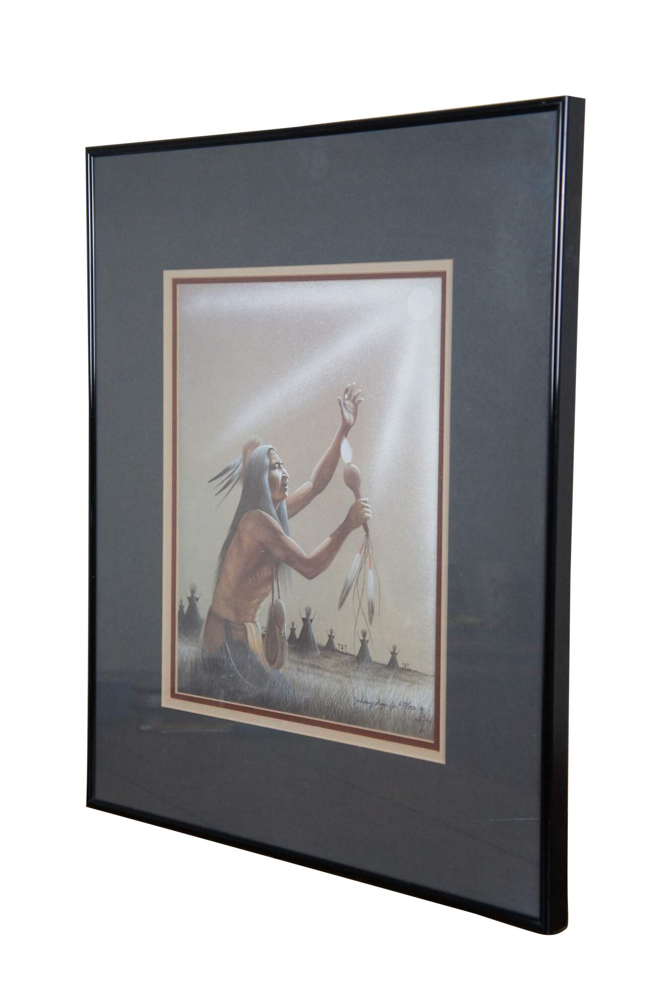 Vintage 1980's lithograph print titled "Medicine Culture" by Johnny Tiger, Jr. Shows a Native american medicine man kneeling to perform a ceremony in the grass near an array of teepees, under a bright full moon or sun. Pencil signed and numbered 637/750. Titled, signed, and date of purchase by artist on reverse. Purchased at the Second Annual Indian Market, Inter-Tribal Arts Experience 1991 - Dayton, OH. Plain black metal frame, gray and brown layered mat.