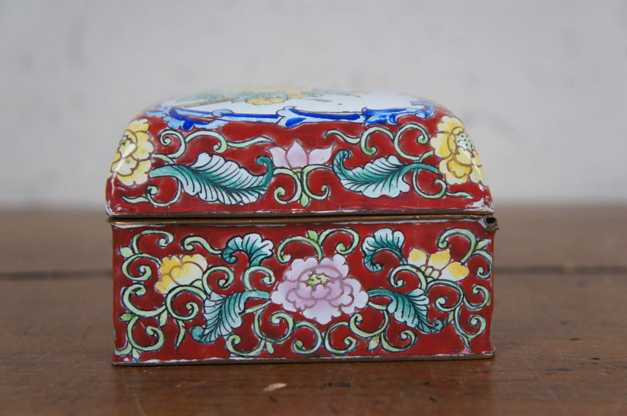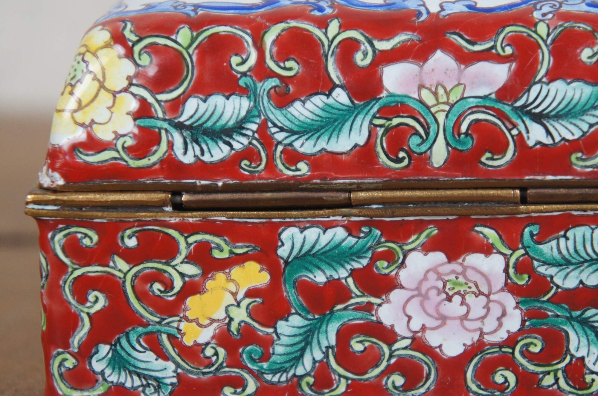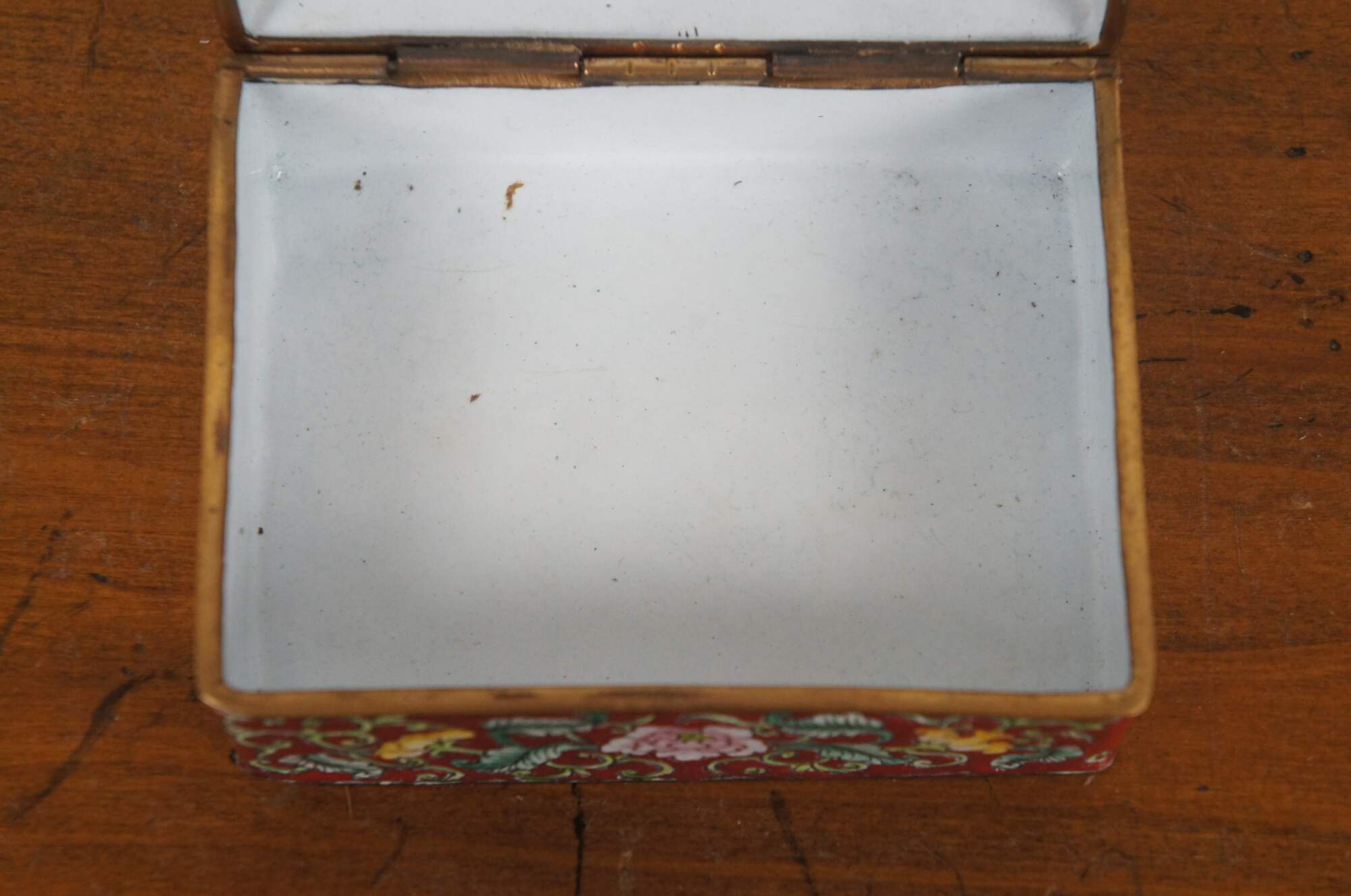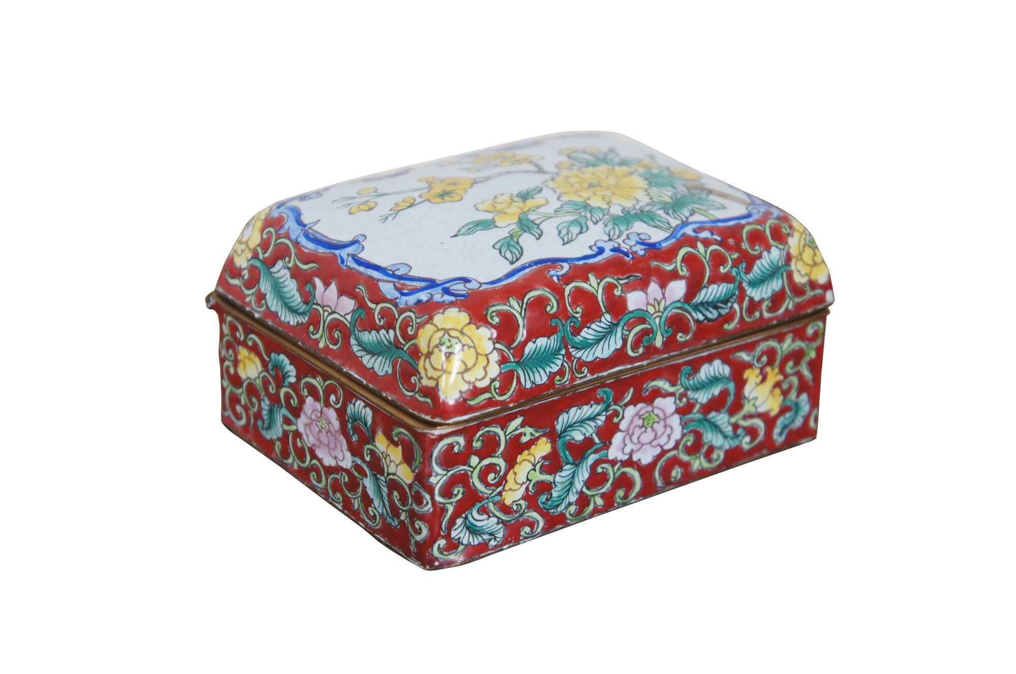 Vintage cloisonne enamel on metal Chinoiserie trinket box. Rectangular form with hinged lid, decorated in red, blue, and white with pink and yellow flowers and swirling leaves.