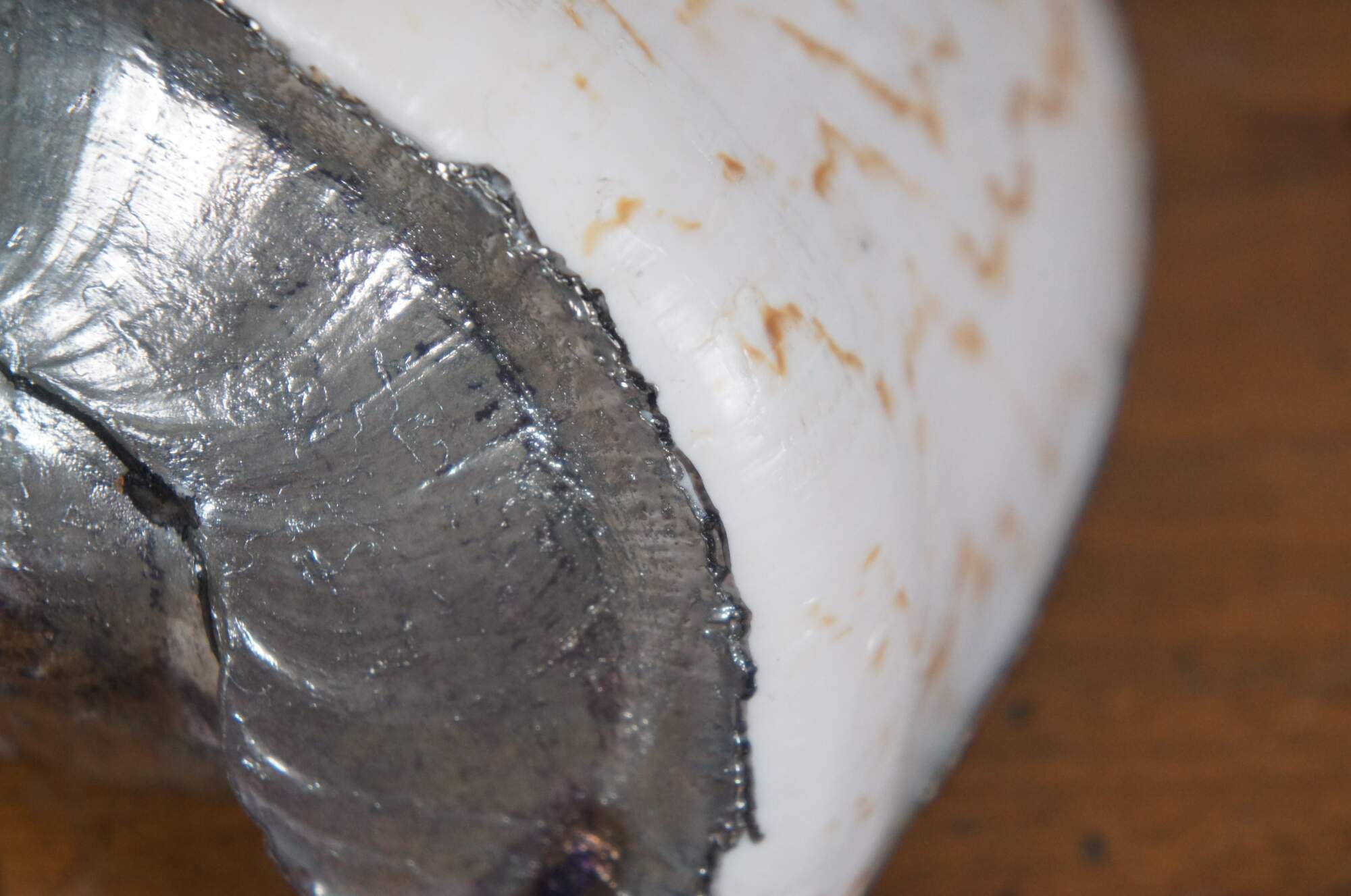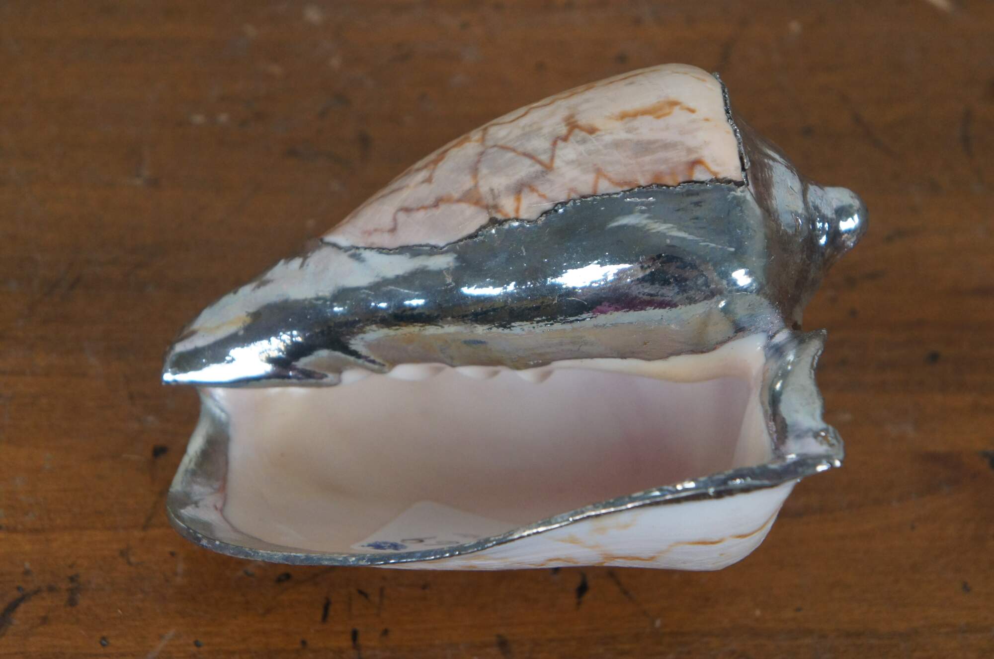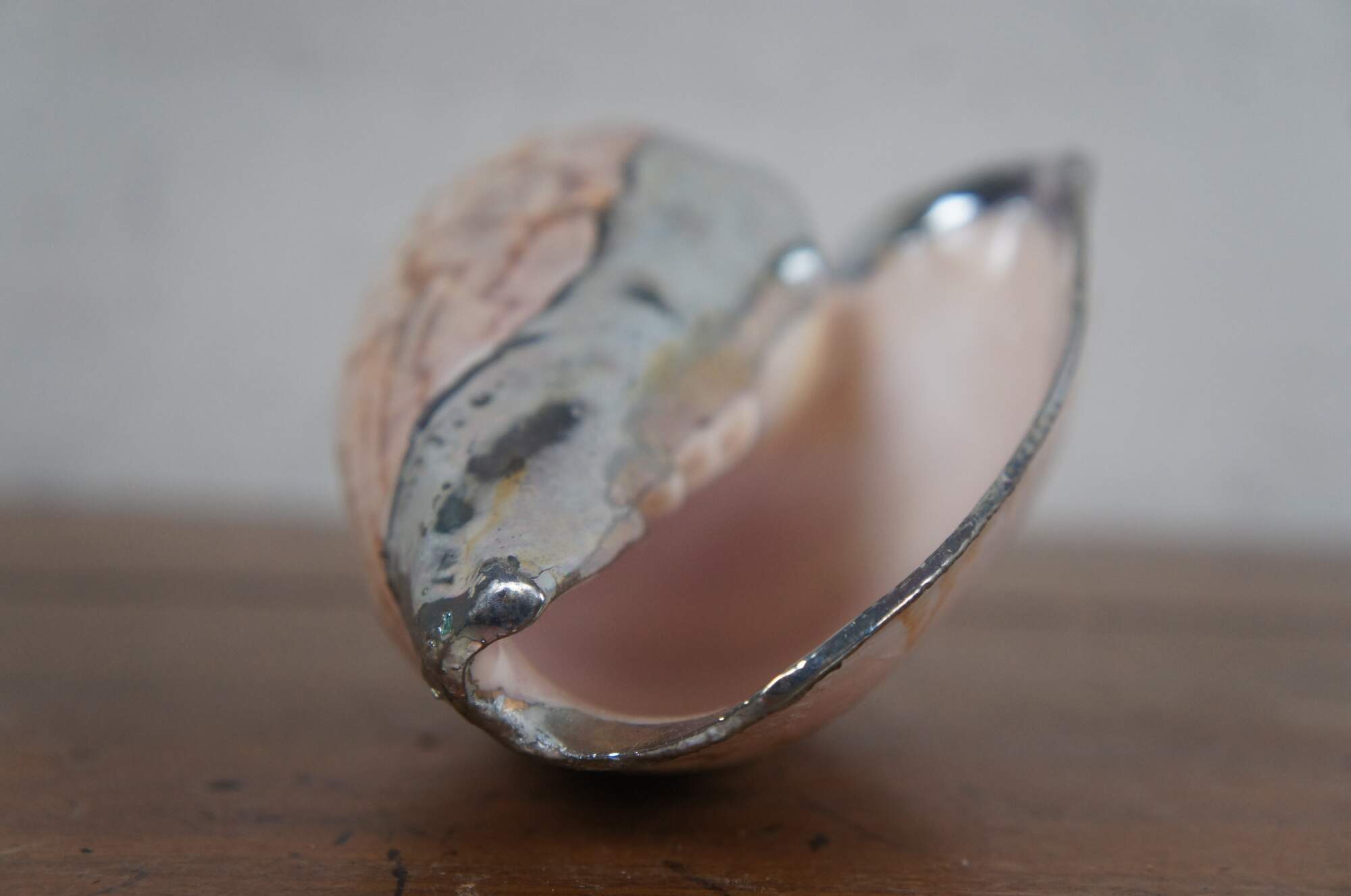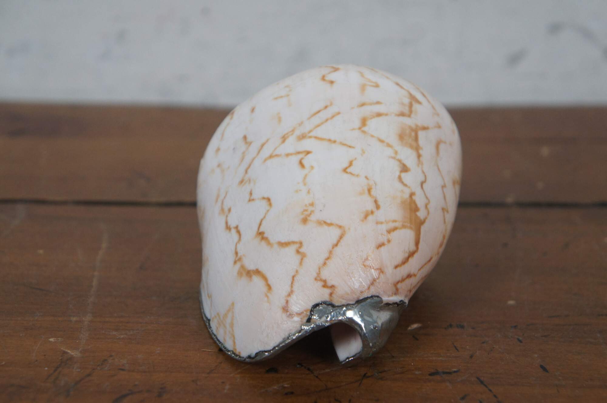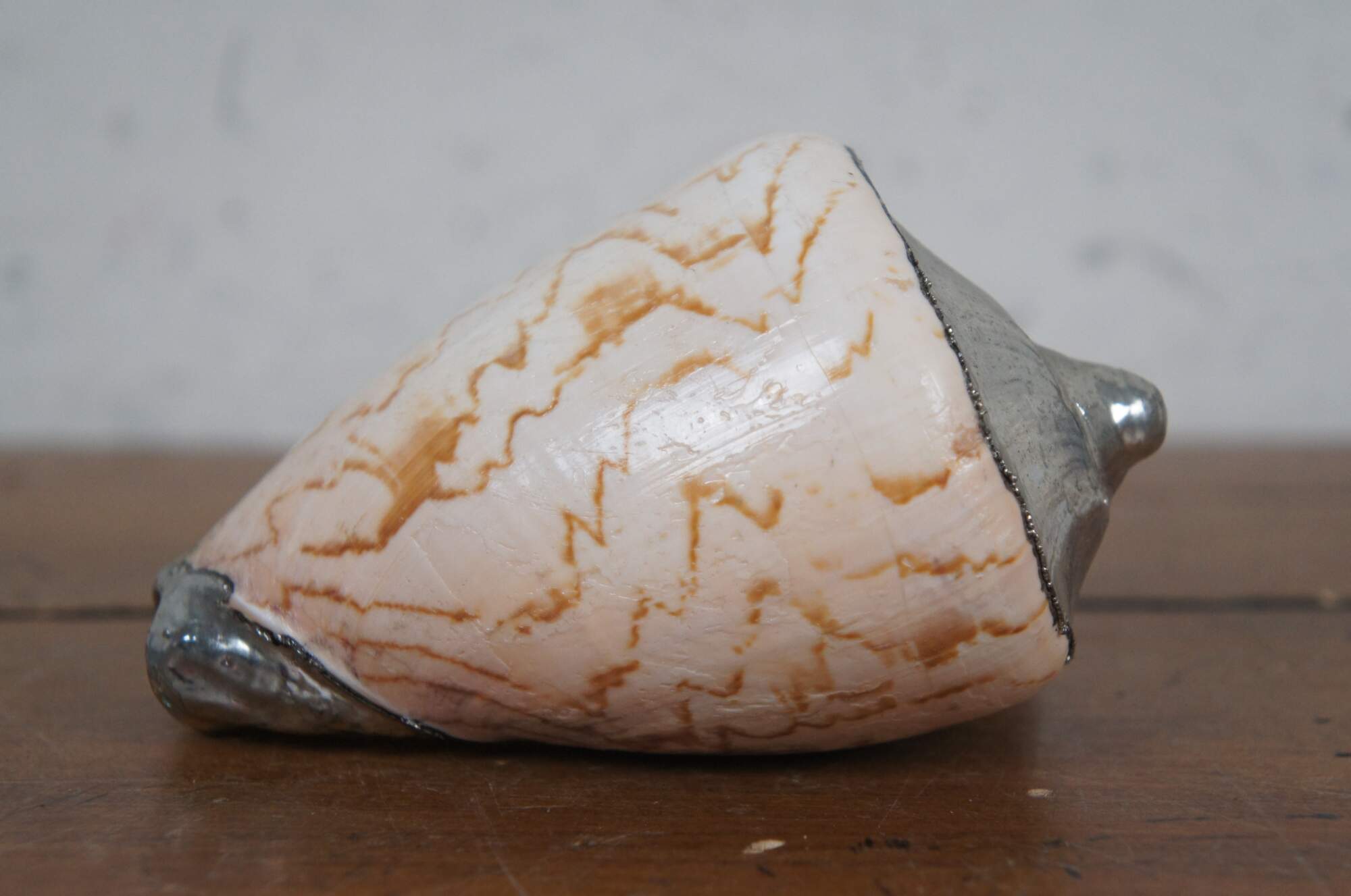 Late 20th century natural souvenir sea shell - Cymbiola Nobilis aka Noble Volute - decoratively clad with silver trim. Originally purchased at the Boca Raton Resort and Club.