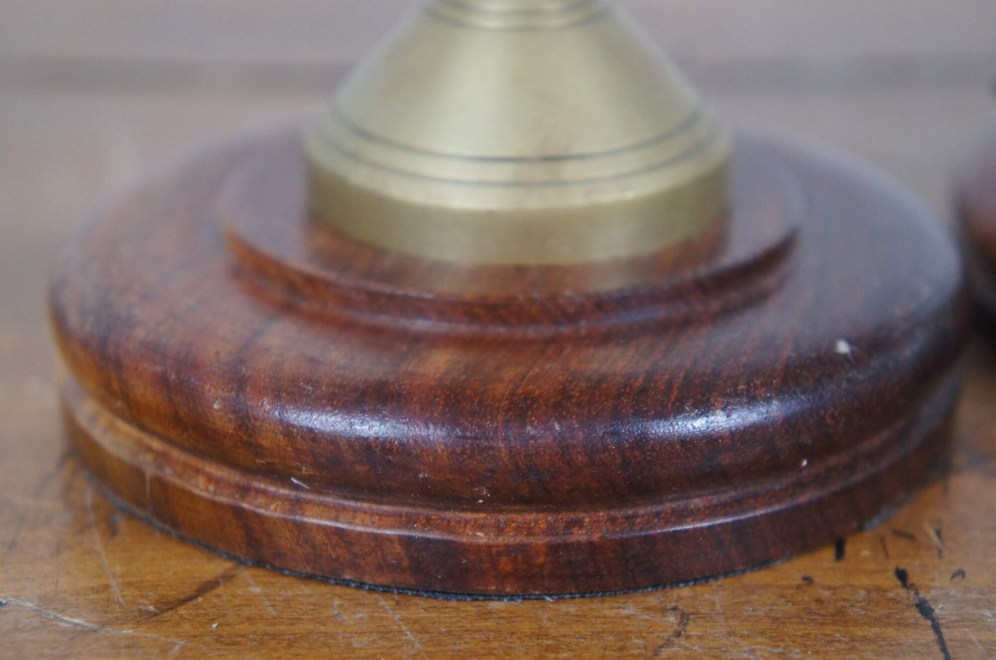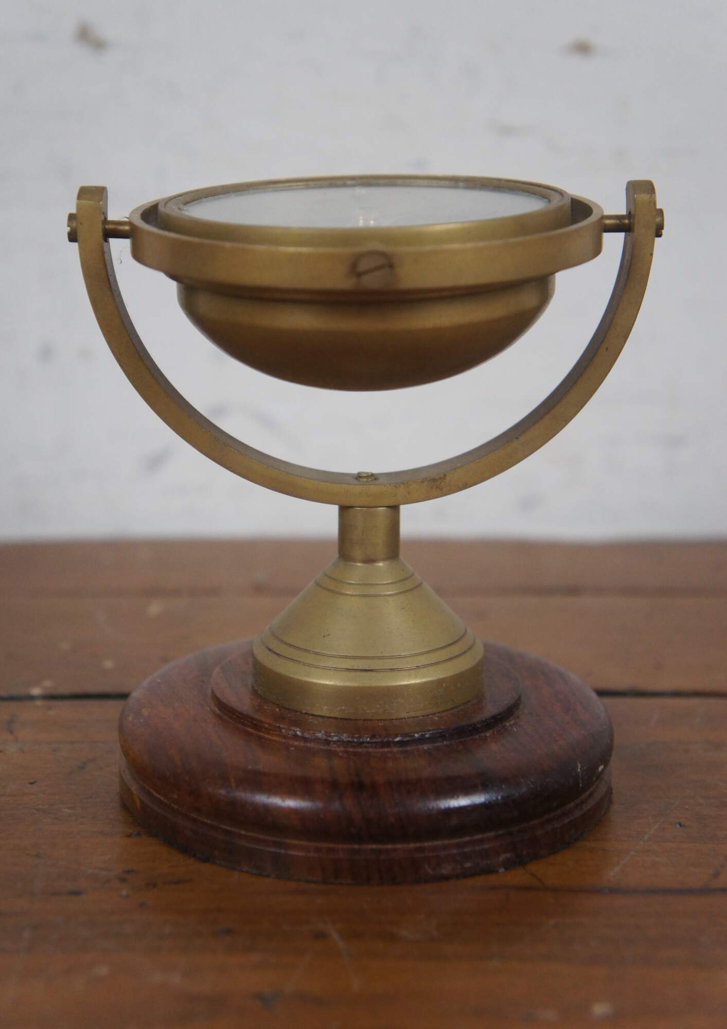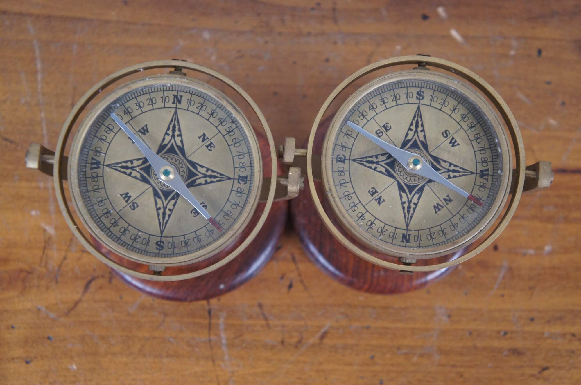 Pair of late 20th century free standing brass swiveling / gimbal nautical compasses on wood pedestal stands.
