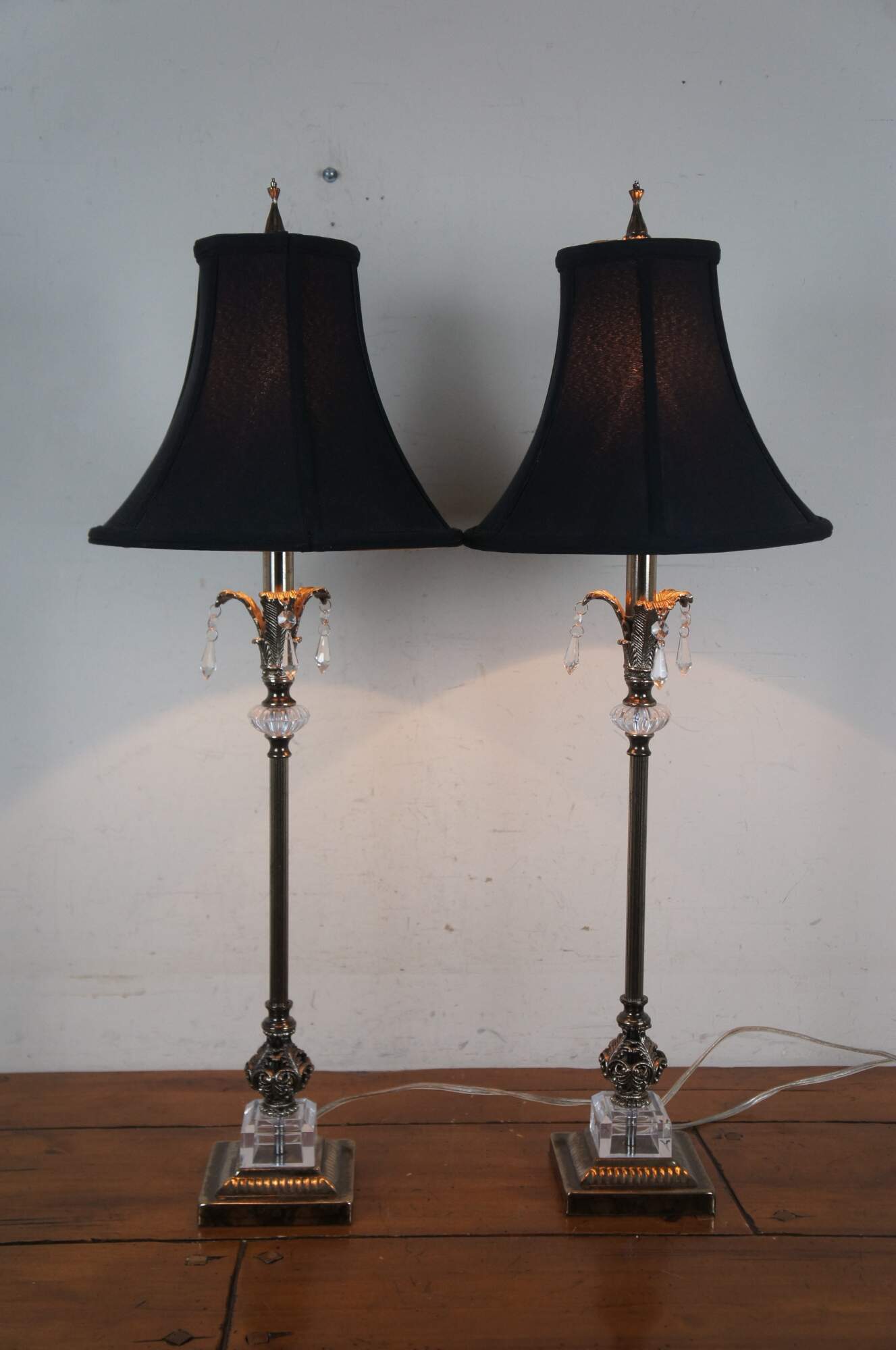 Pair of late 20th century buffet / table lamps by the Bombay Company. Neoclassical fluted column with square base, accented with glass segments, acanthus leaf orb, topped with feather plumes and drop crystals. Antique silver finish. Include harps, finials and black cloth shades lined in light brown satin.