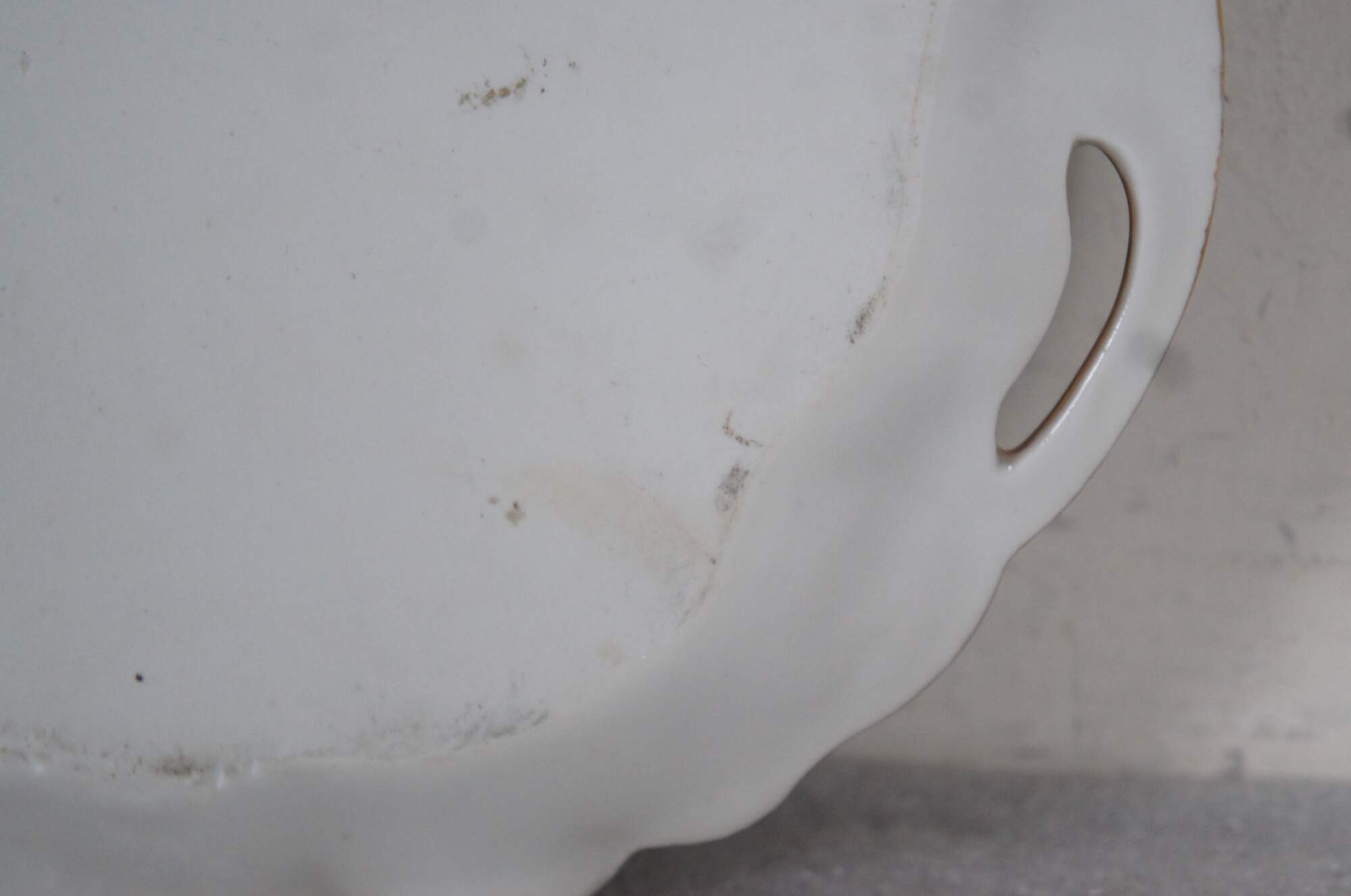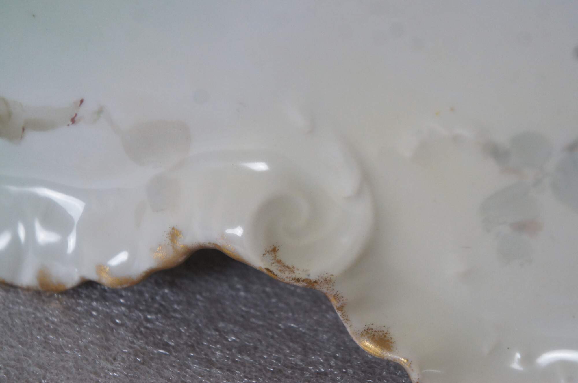 Late 19th - early 20th century Limoges porcelain vanity tray by William Guerin and Company. Kidney bean / artist palette shape with gilded, scalloped edge and pierced handle. Hand painted with green and mauve ombre and stems of yellow roses. Signed B. Eschmann.