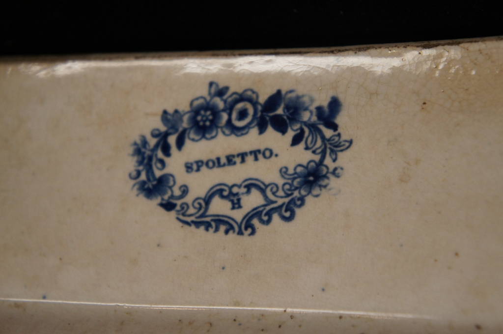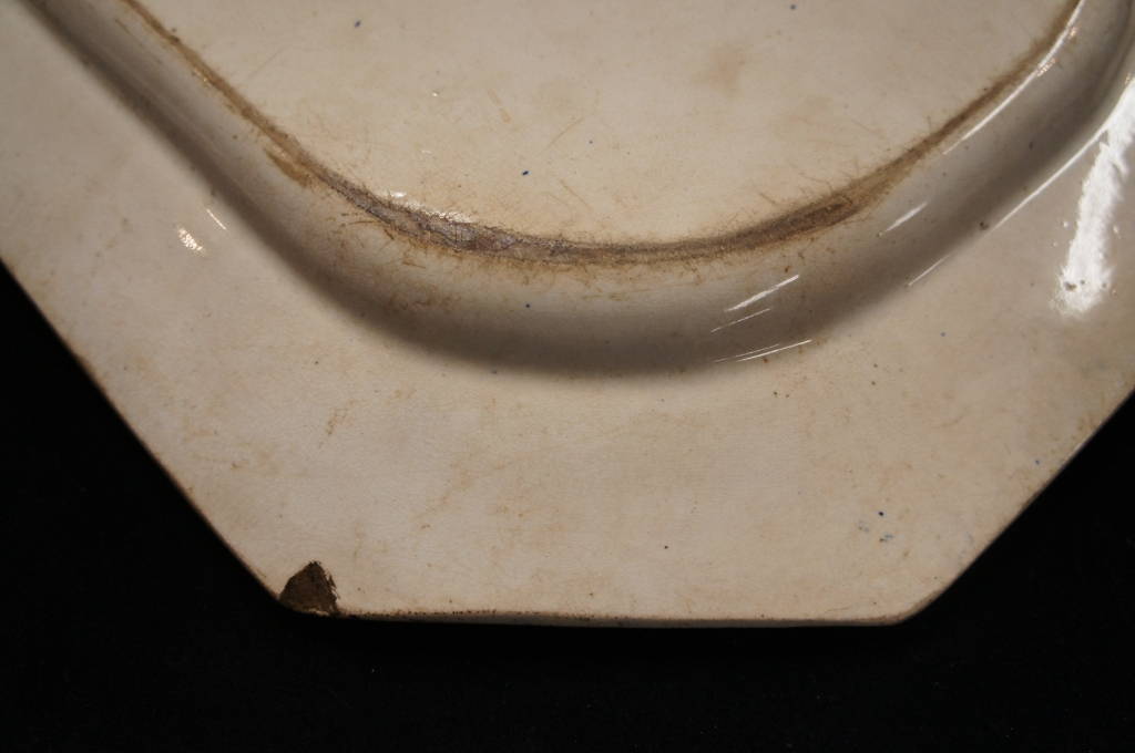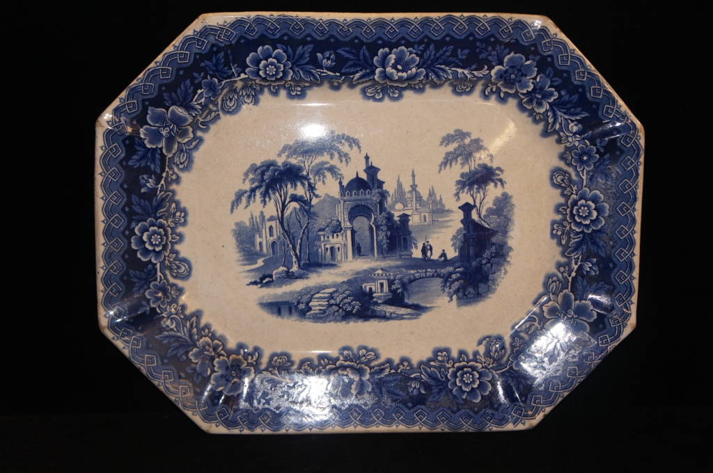 Blue TransferwarePlatter with floral boarder and scene in the center.