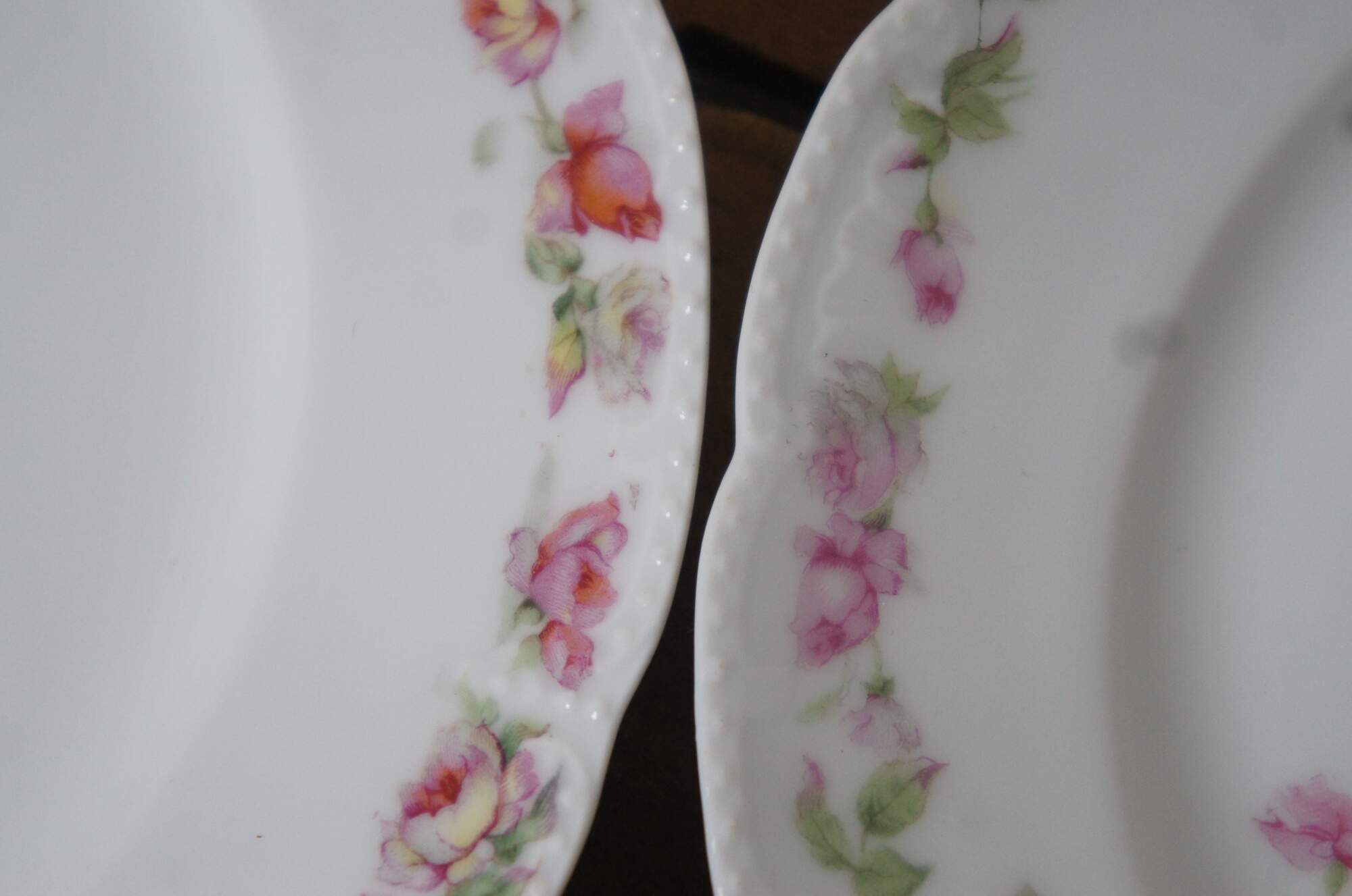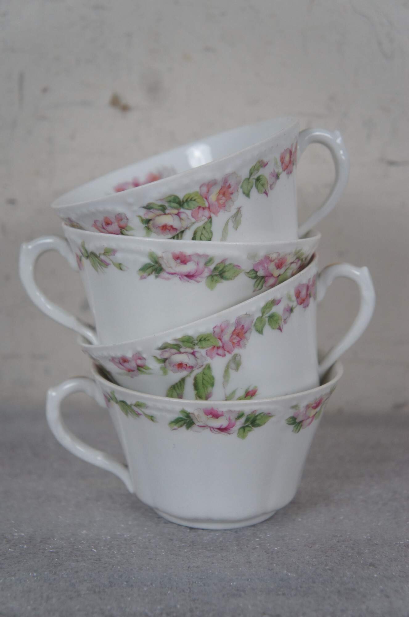 Early 20th century tea / dessert set by George f. Bassett and Company. Pattern features a garland of pink roses and green leaves. Set includes 11 Dessert Plates, 4 Saucers, 4 Tea Cups.
