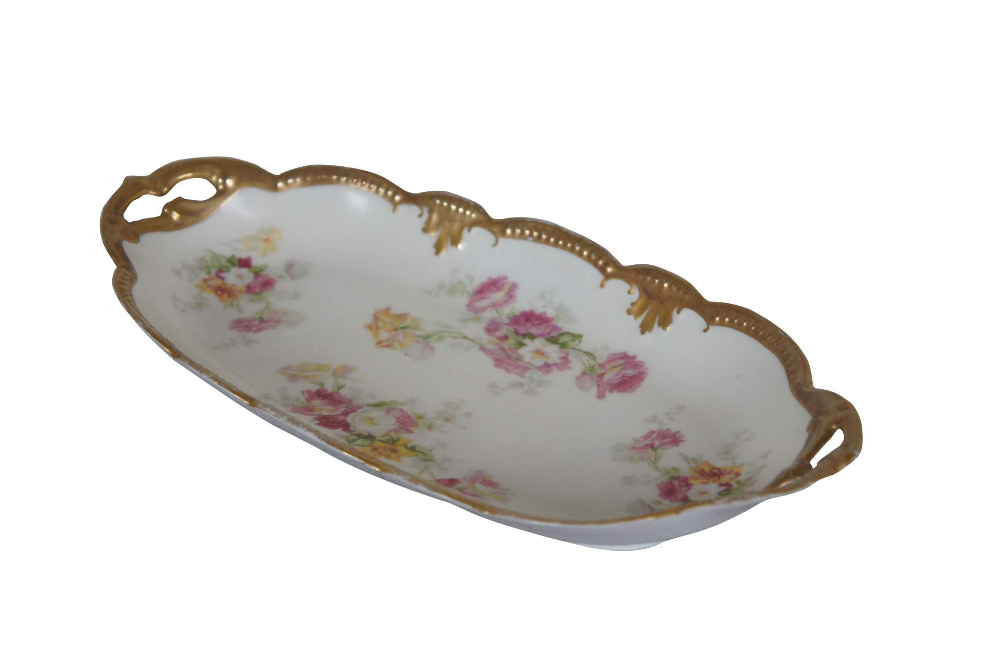 Early 20th century Limoges porcelain serving dish / vanity tray by Alfred Klingenberg and Charles Dwenger. Long oval shape with scalloped edges and pierced handles. Gilded border. Sprays of pink, yellow, and green flowers. Mark used circa 1900-1910.