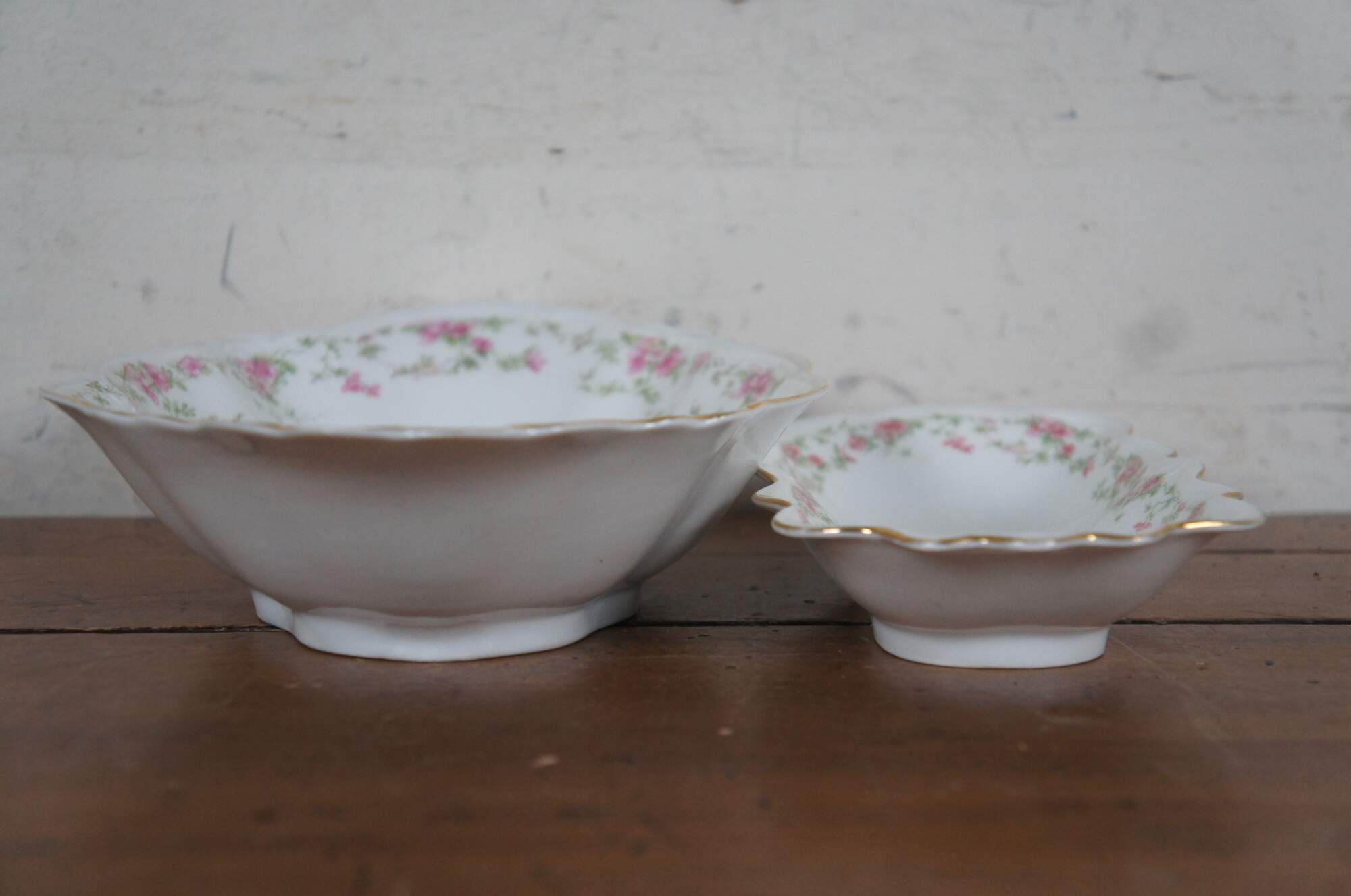Pair of turn of the century porcelain serving dishes by MZ Austria. One oval bowl and one rectangular serving dish, scalloped edges with gold trim, pink rose and green leaf garland pattern. Mark used circa 1884-1909.