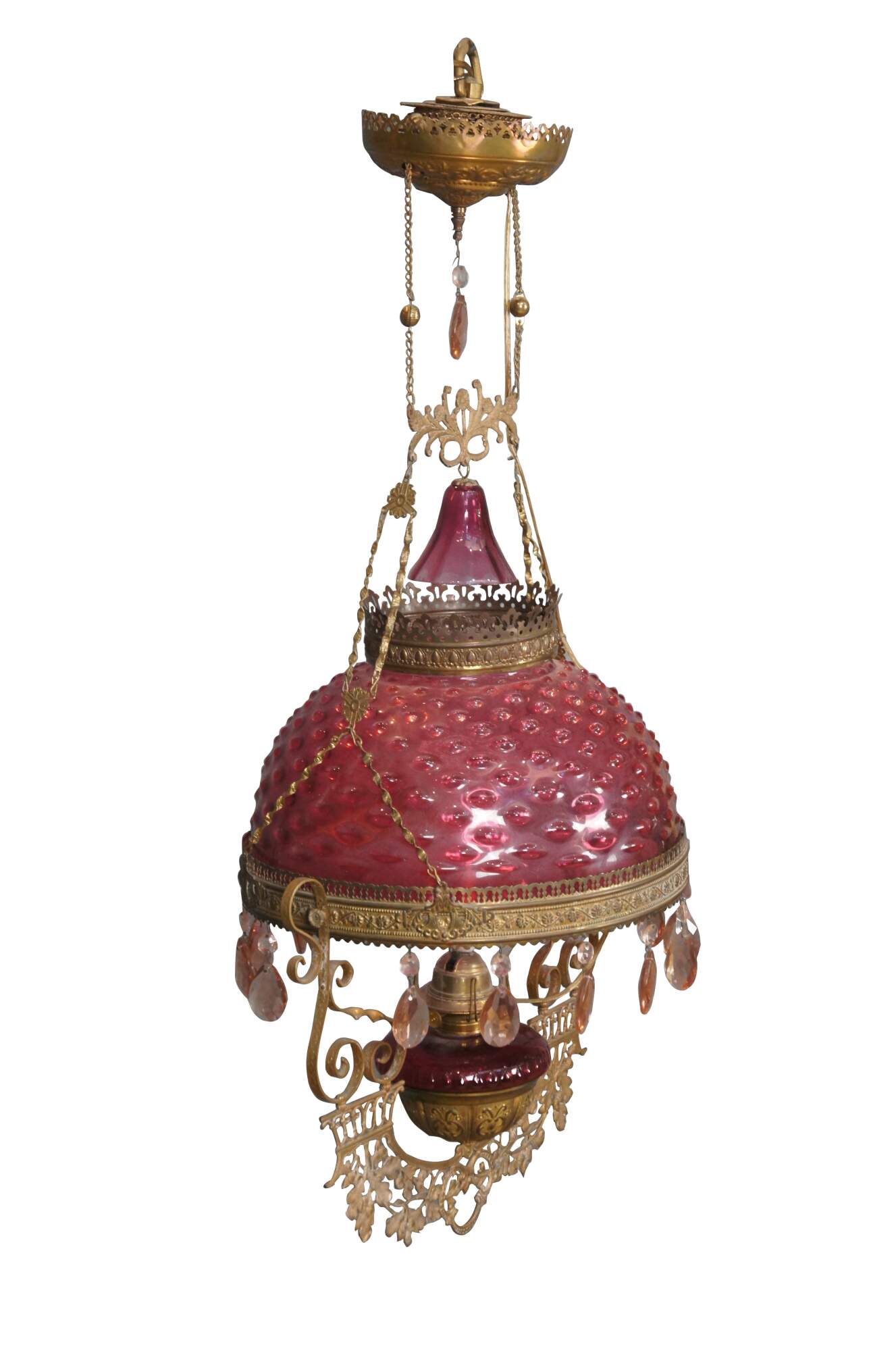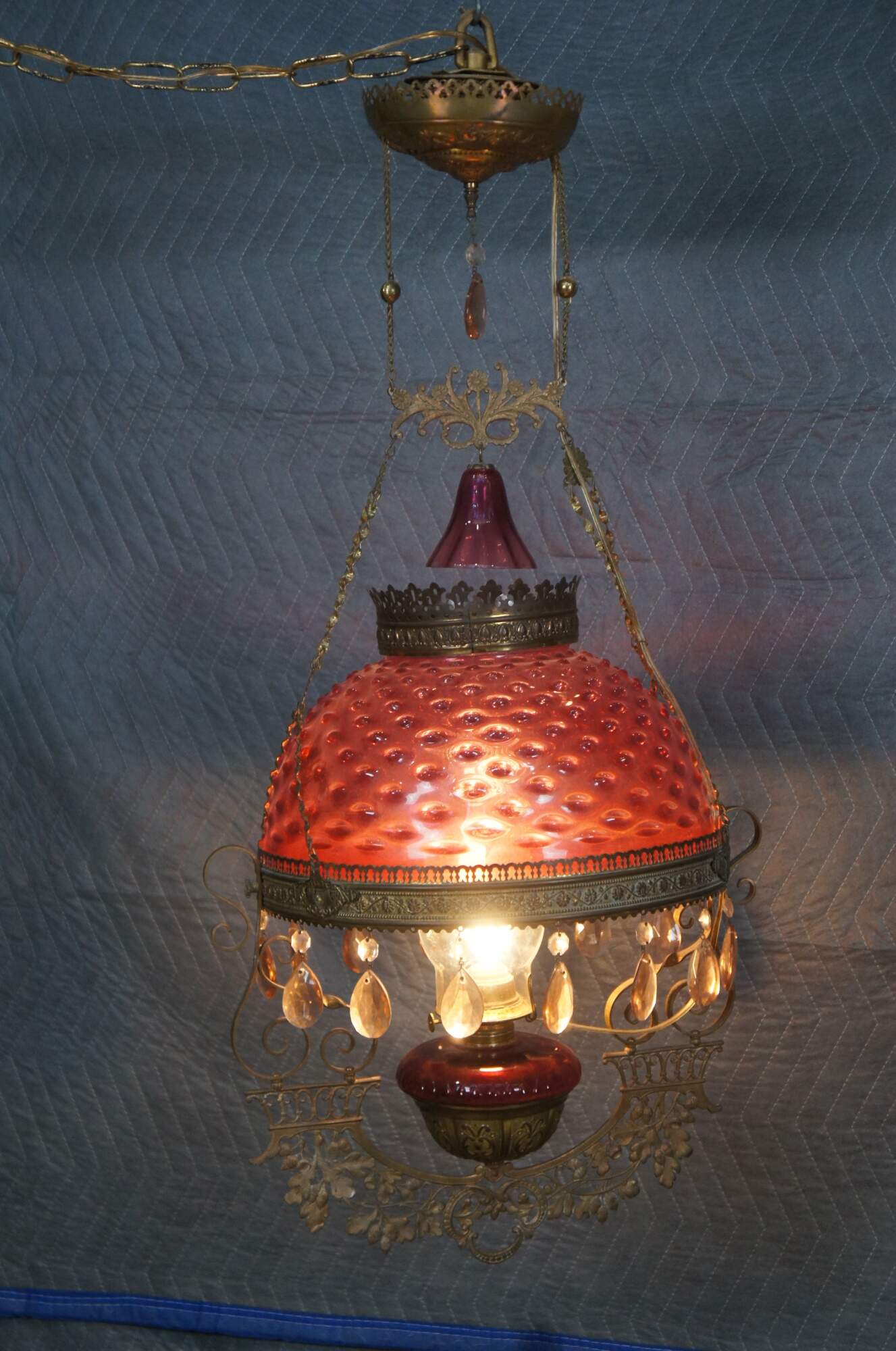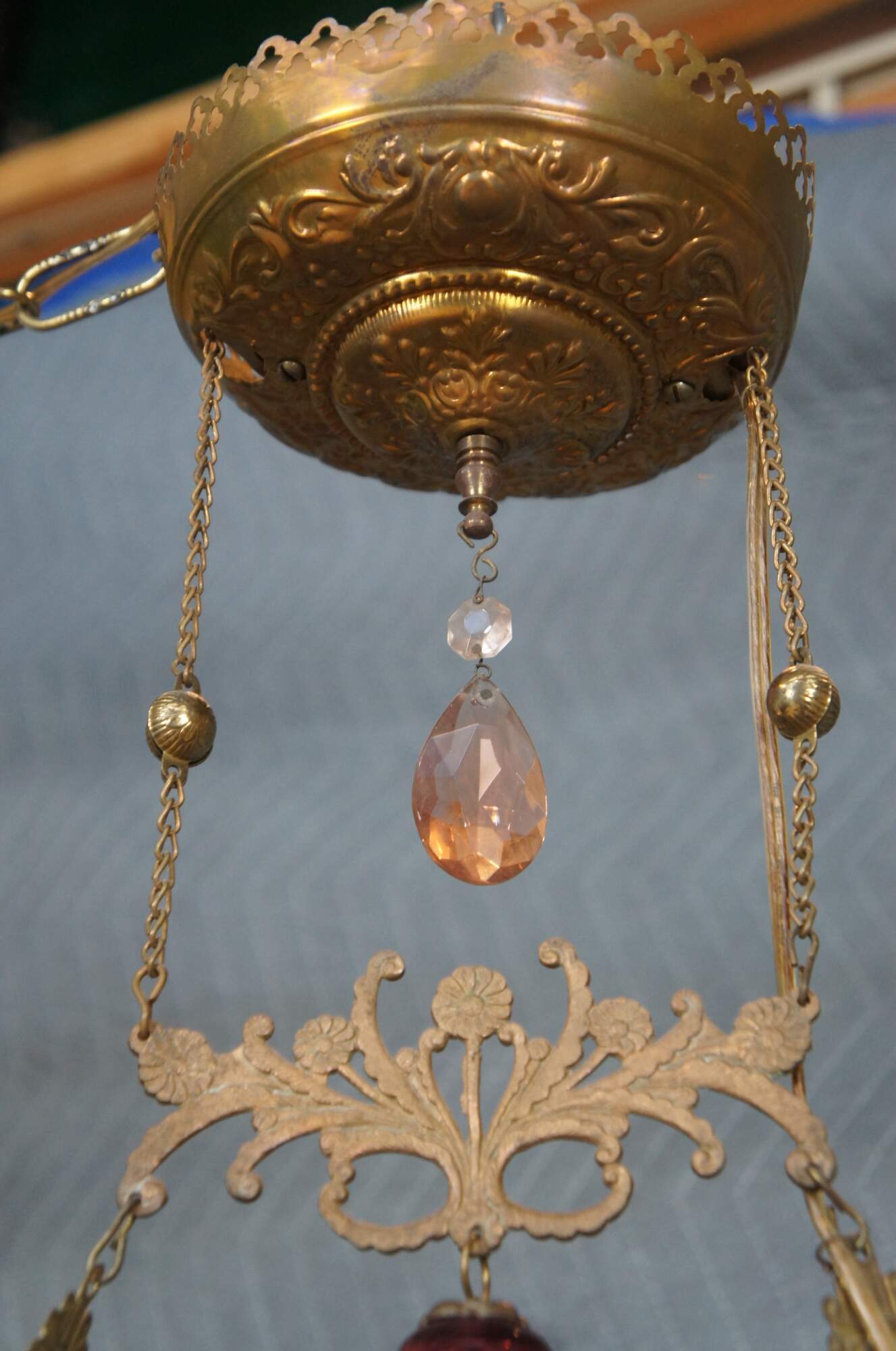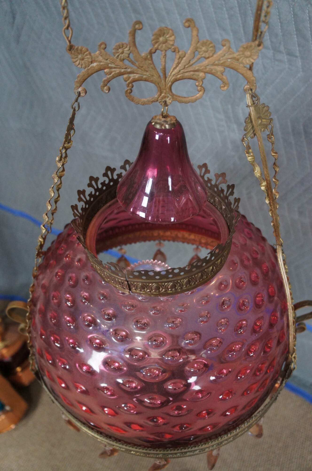 Late 19th century Antique Victorian parlor / pendant light. Oil lamp converted to electric. Intricate brass frame embellished with floral patterns, scrollwork, and a swag of oak leaves and acorns. Deep pink cranberry glass oil reservoir with tear drop deatils, hobnailed shade, and fluted blossom shaped smoke bell. Pink drop crystals hang from the ceiling medallion and around the edge of the shade. Includes clear glass hurricane with beaded top. Plug In.