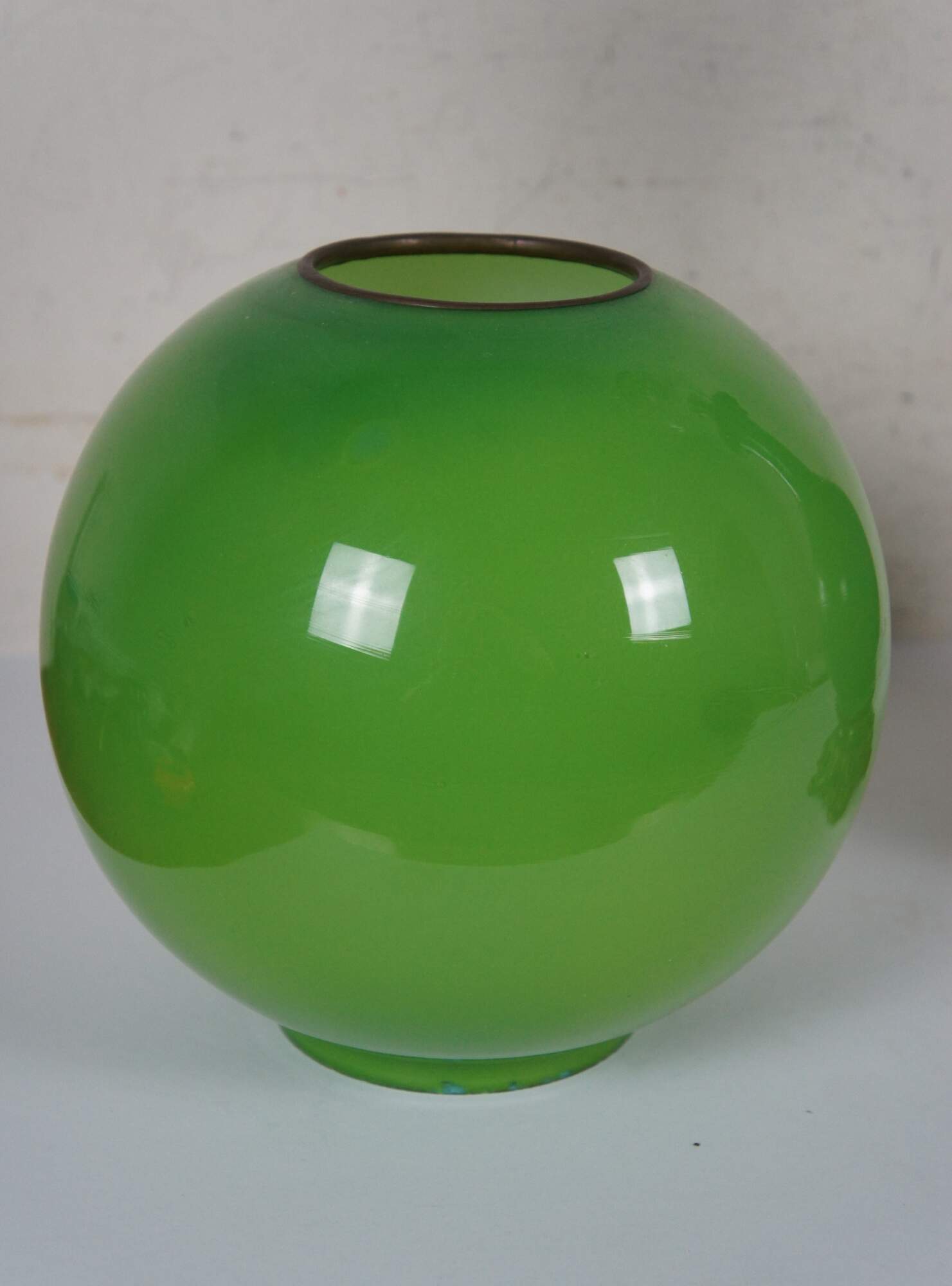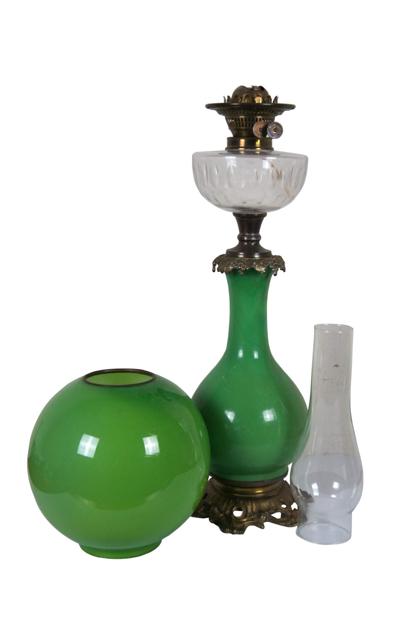Rare apple green antique Victorian parlor Gone with the Wind oil lamp converted to electric. Foliate brass base with vase shaped green glass body, topped with grape vines; clear thumbprint reservoir and hurricane, Duplex - Made in England burner, apple green glass globe. GWTW.