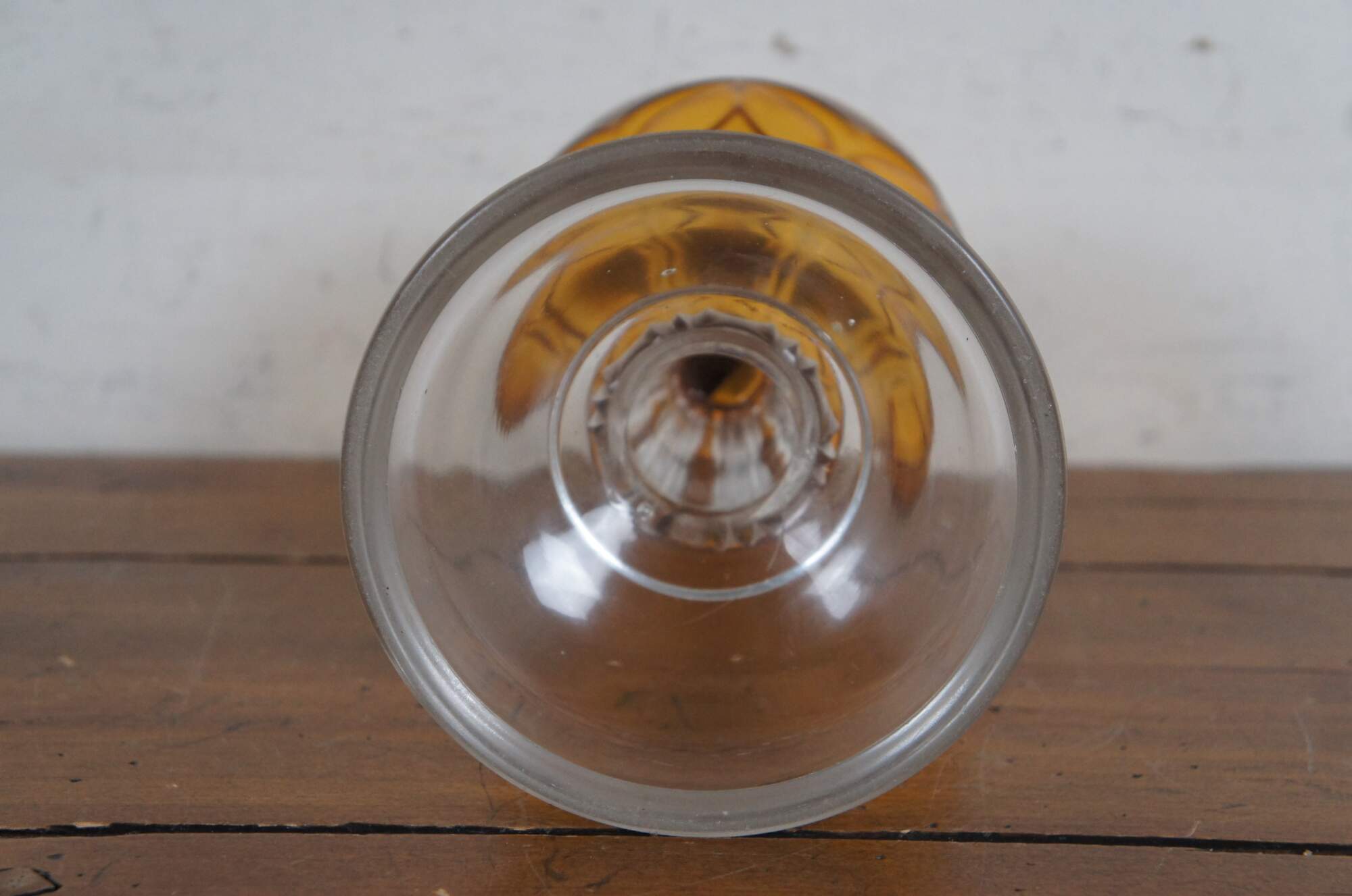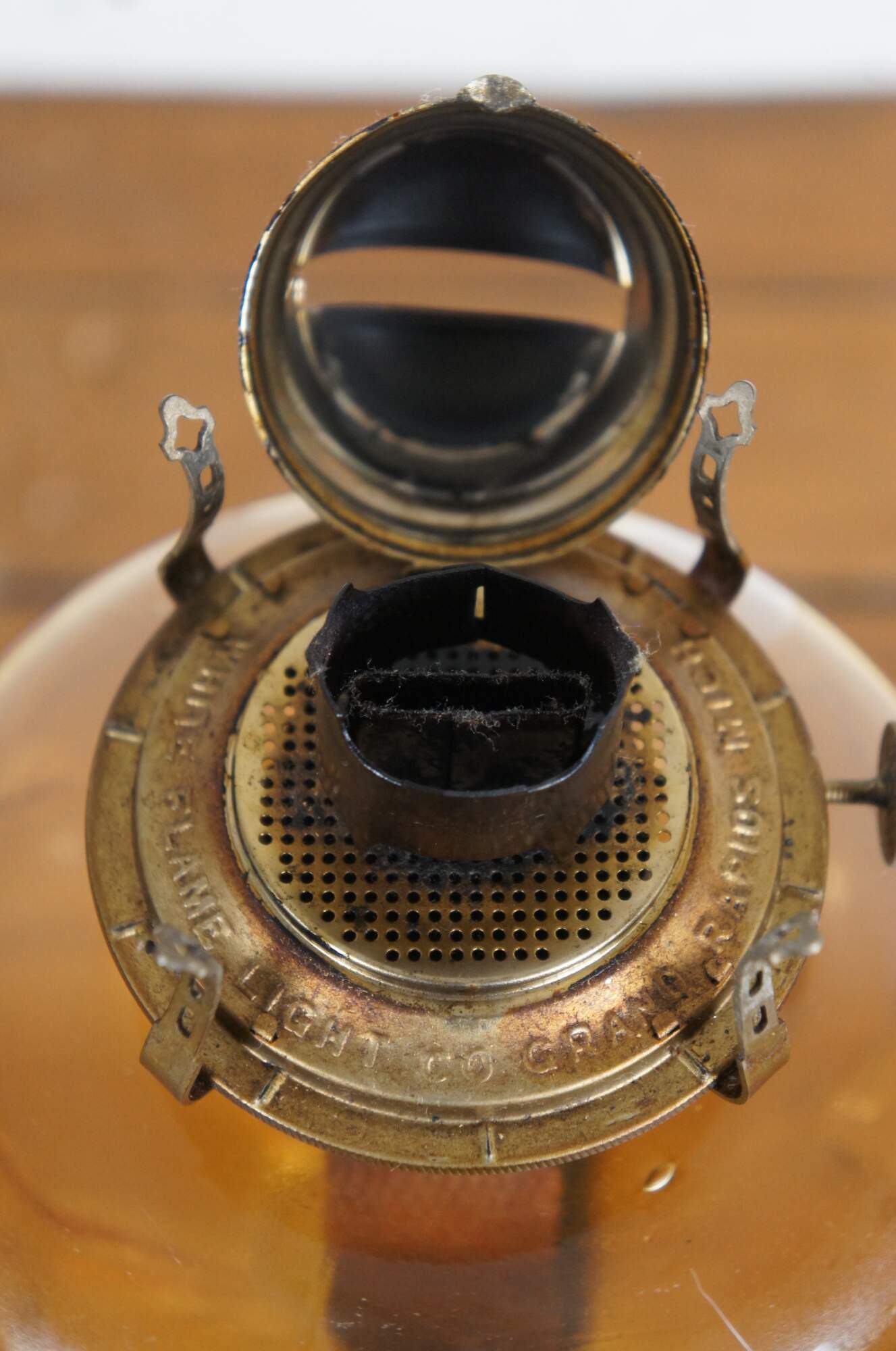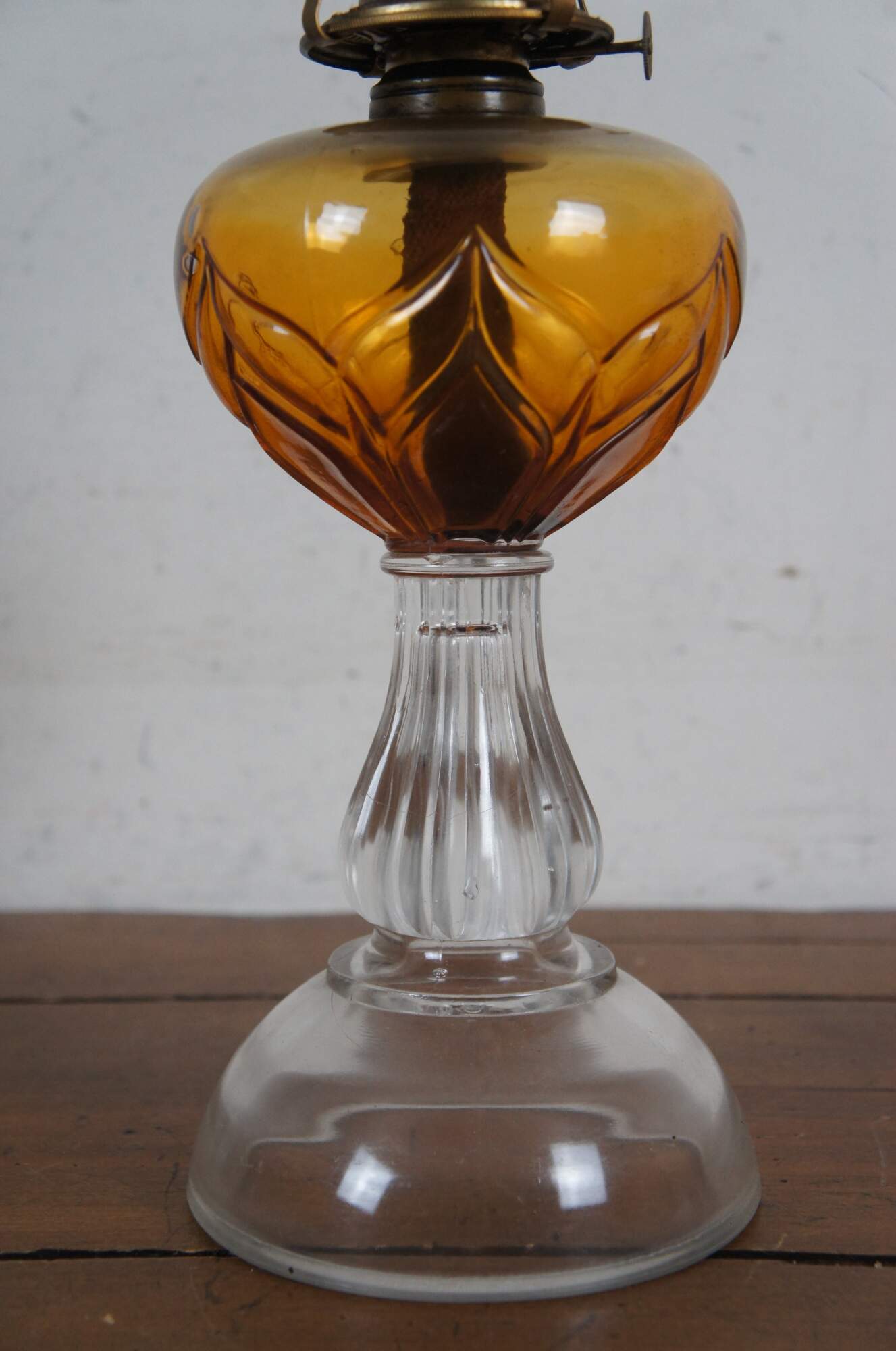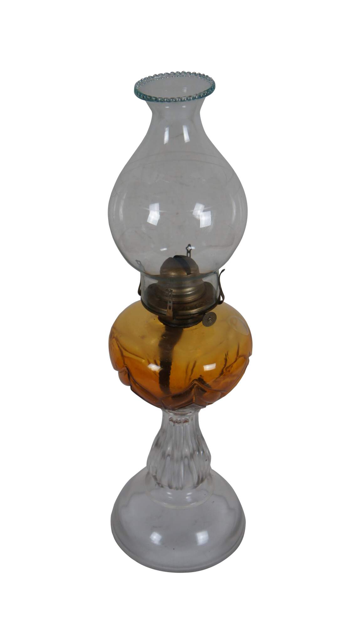Antique Victorian oil lamp featuring a clear presses glass base, amber reservoir decorated with abroad leaf motif, white flame light burner and clear hurricane with beaded edge and faded repeating image of a crescent moon cupping a large five pointed star, surrounded by smaller stars and a laurel wreath.