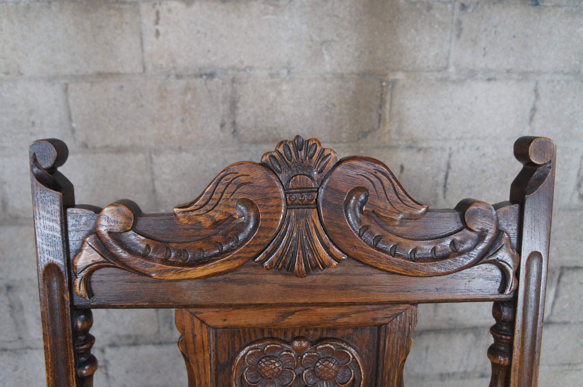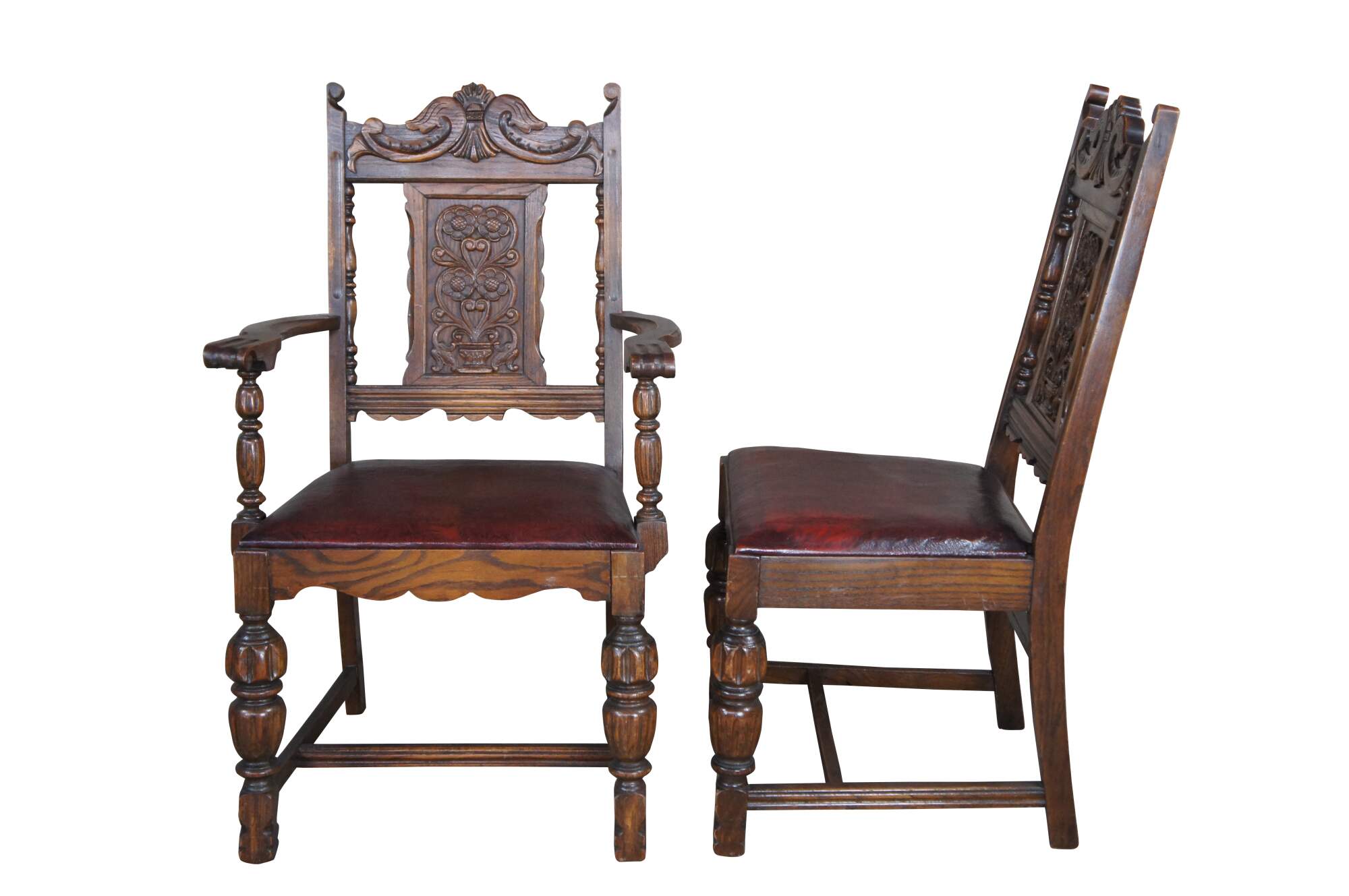 Set of six antique Jacobean dining chairs. Made of oak featuring carved serpentine design with carved floral panel backs and red oxblood leather seats.