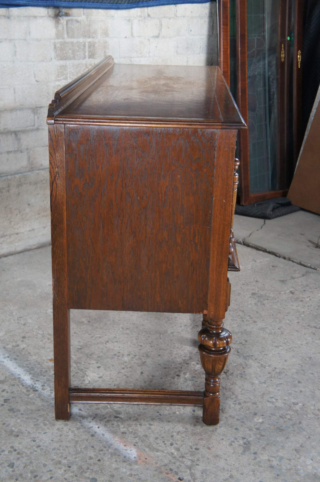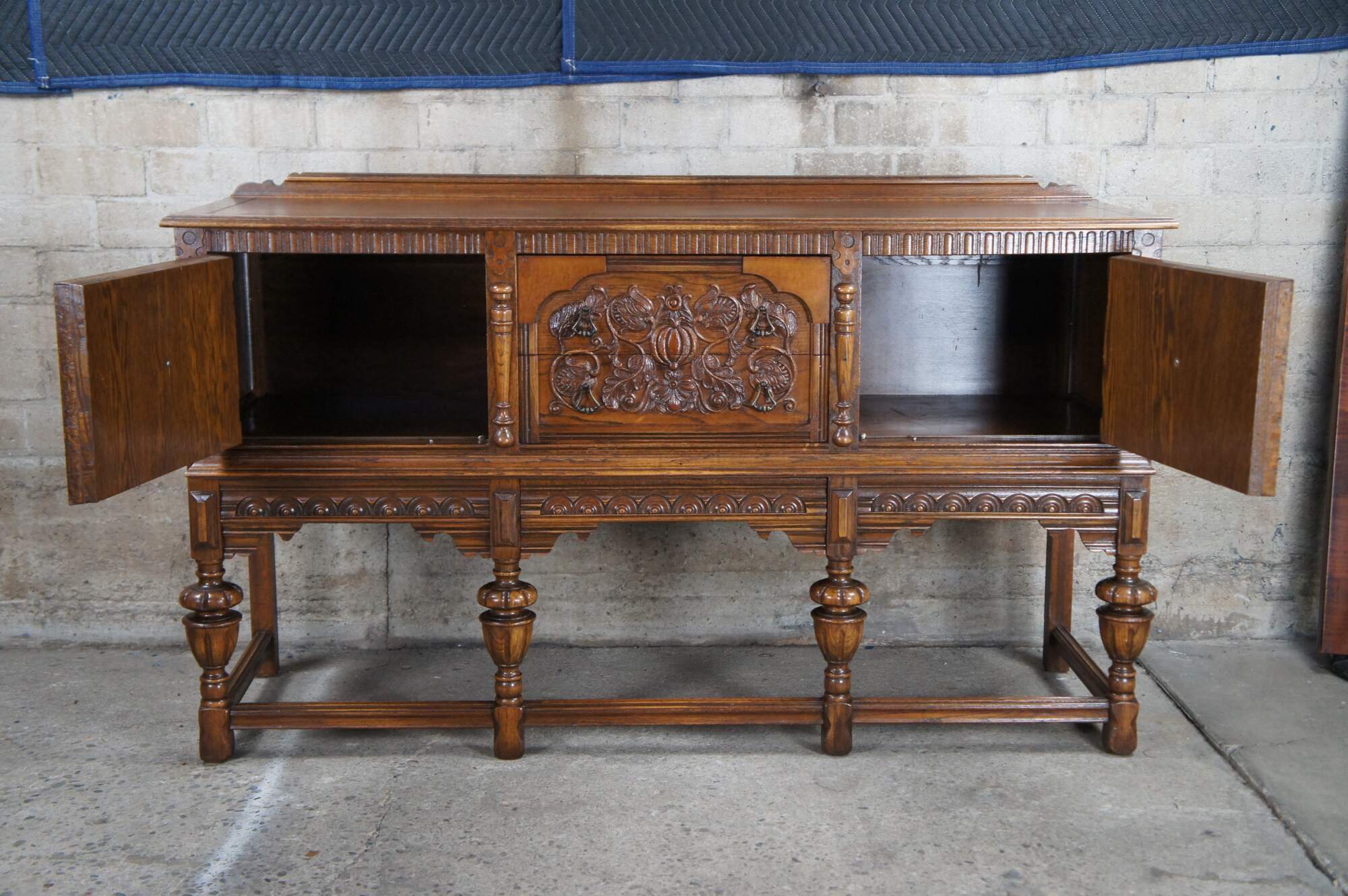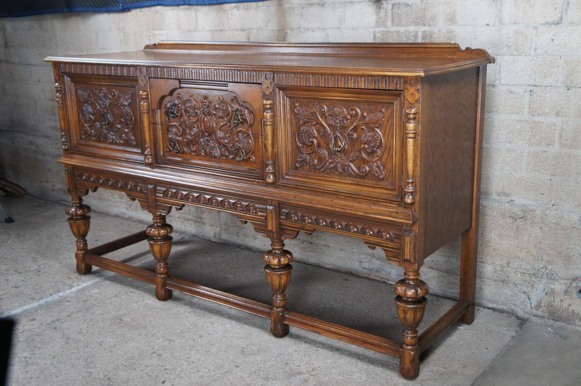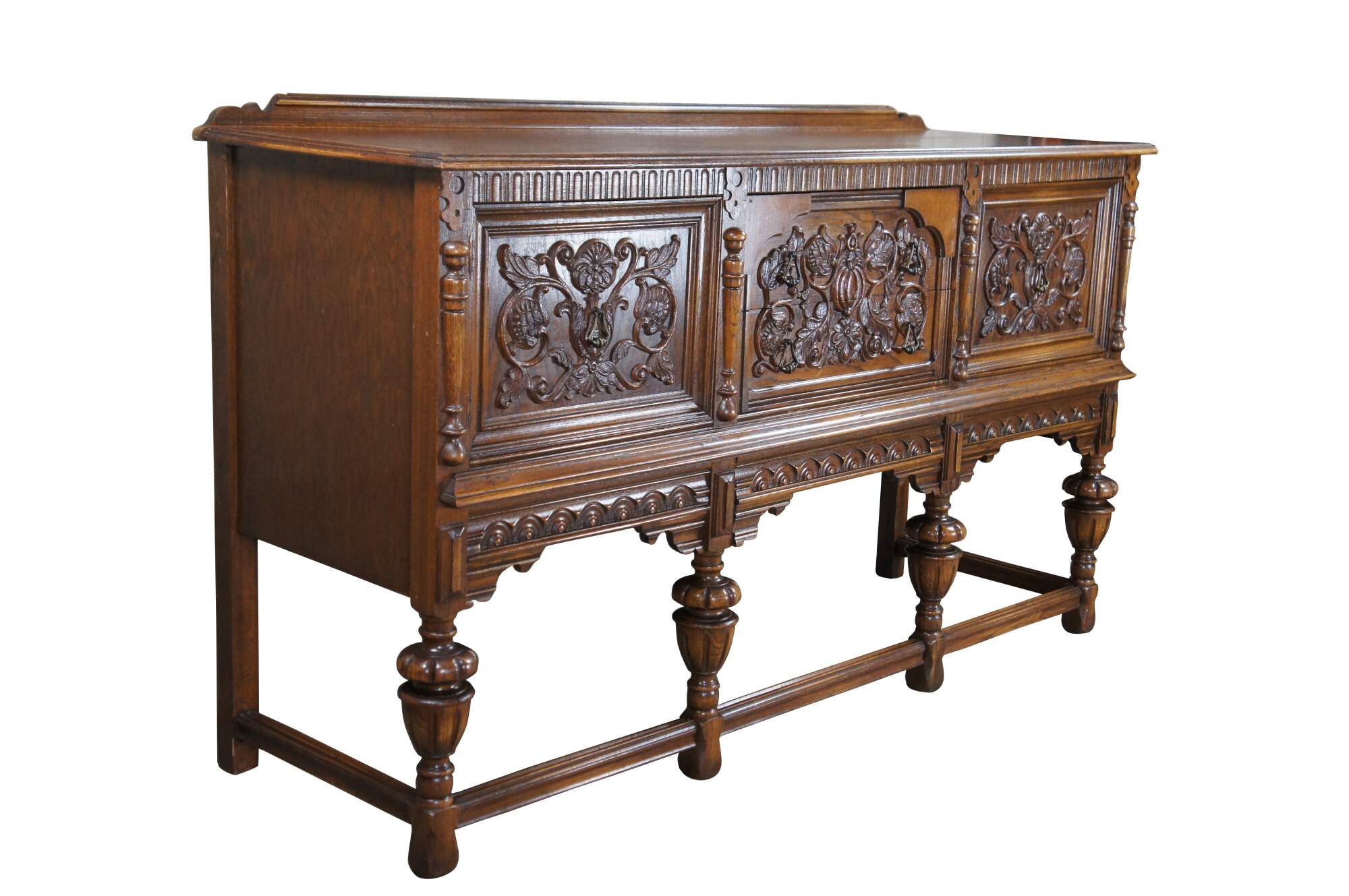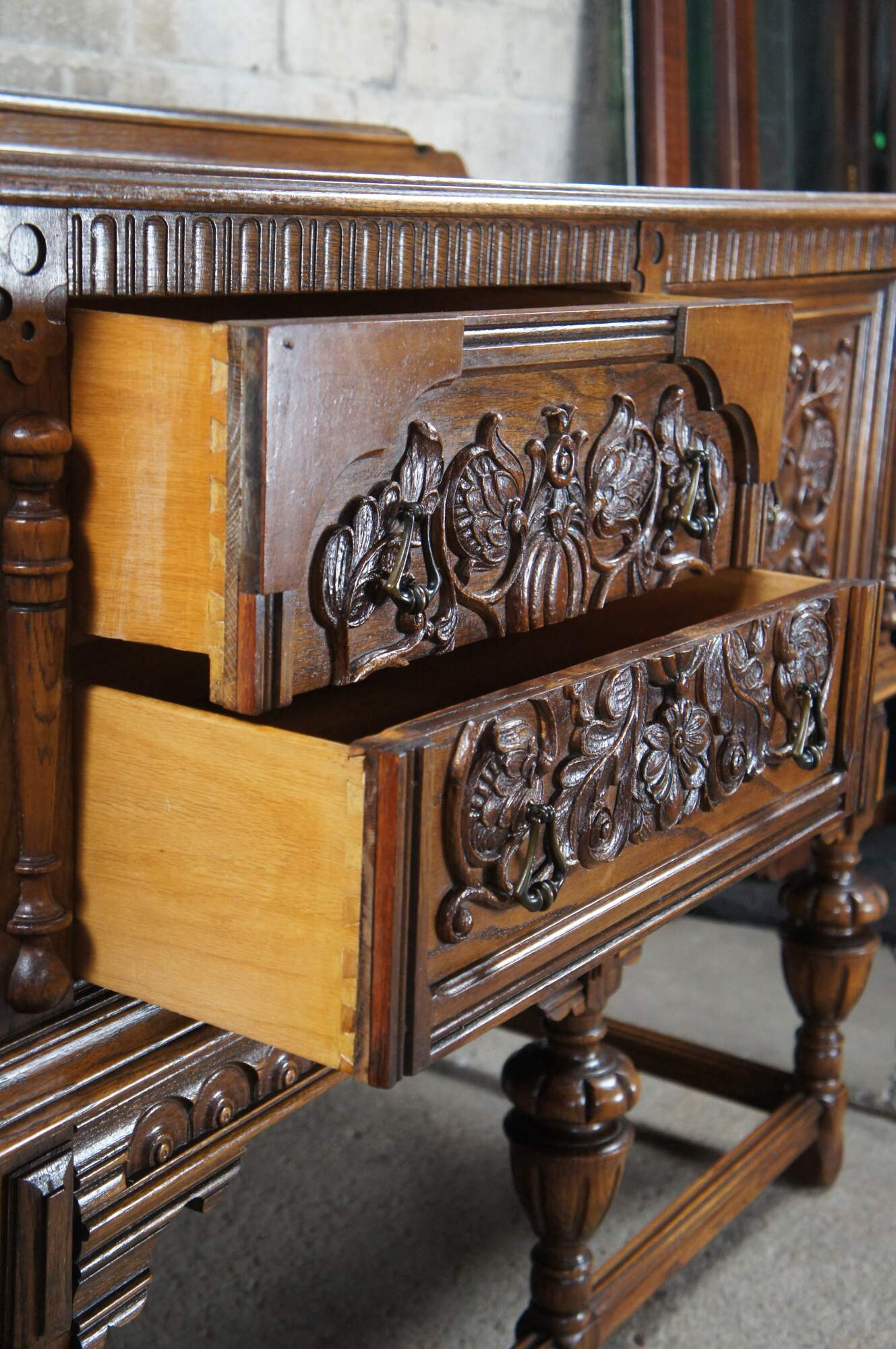 Early 20th Century Jacobean / Elizabethan revival court buffet / credenza / sideboard / console. Made from oak with two cabinets and two drawers featuring floral / acanthus / foliate design supported by beautifully turned baluster legs connected by stretcher.