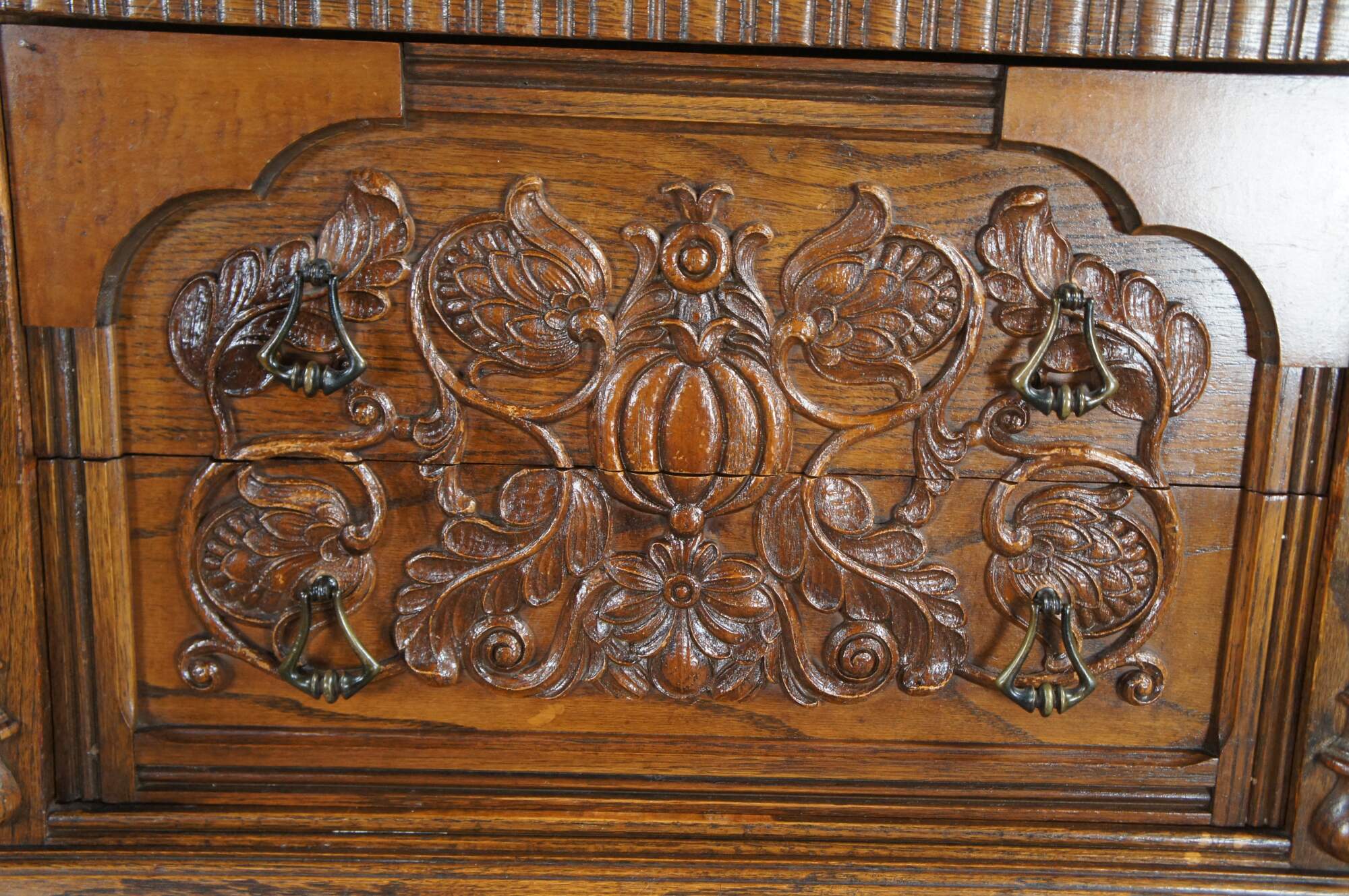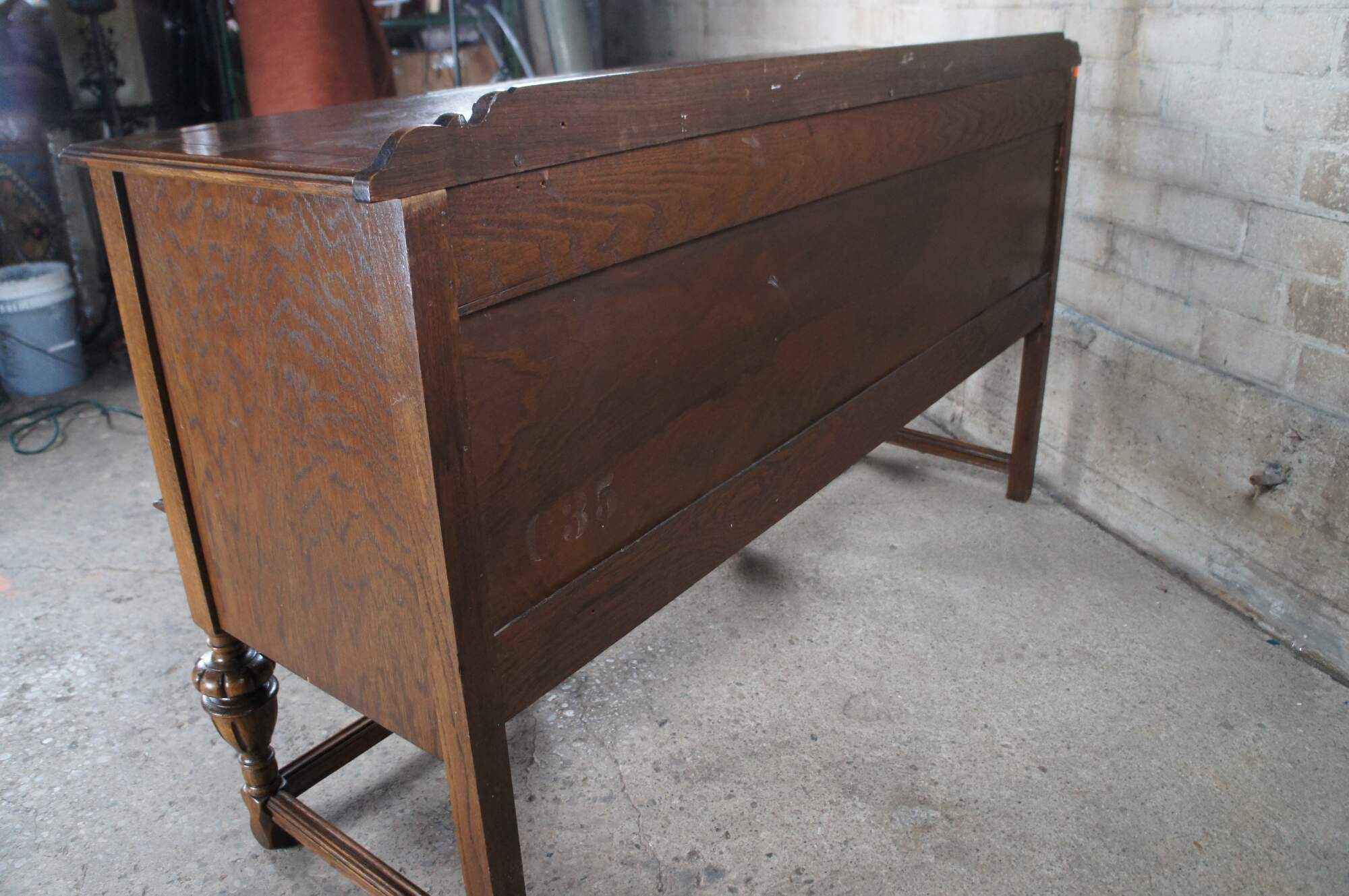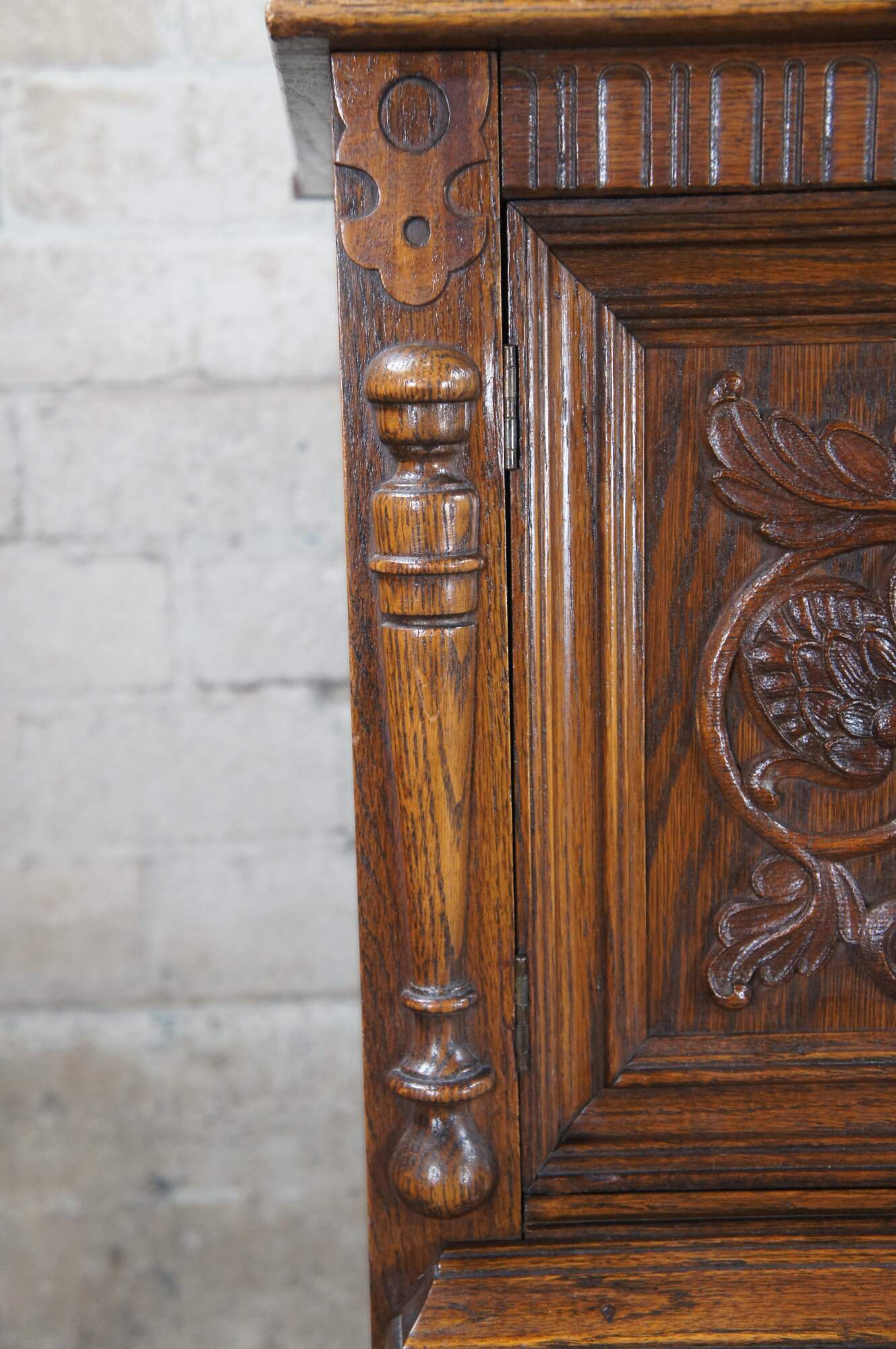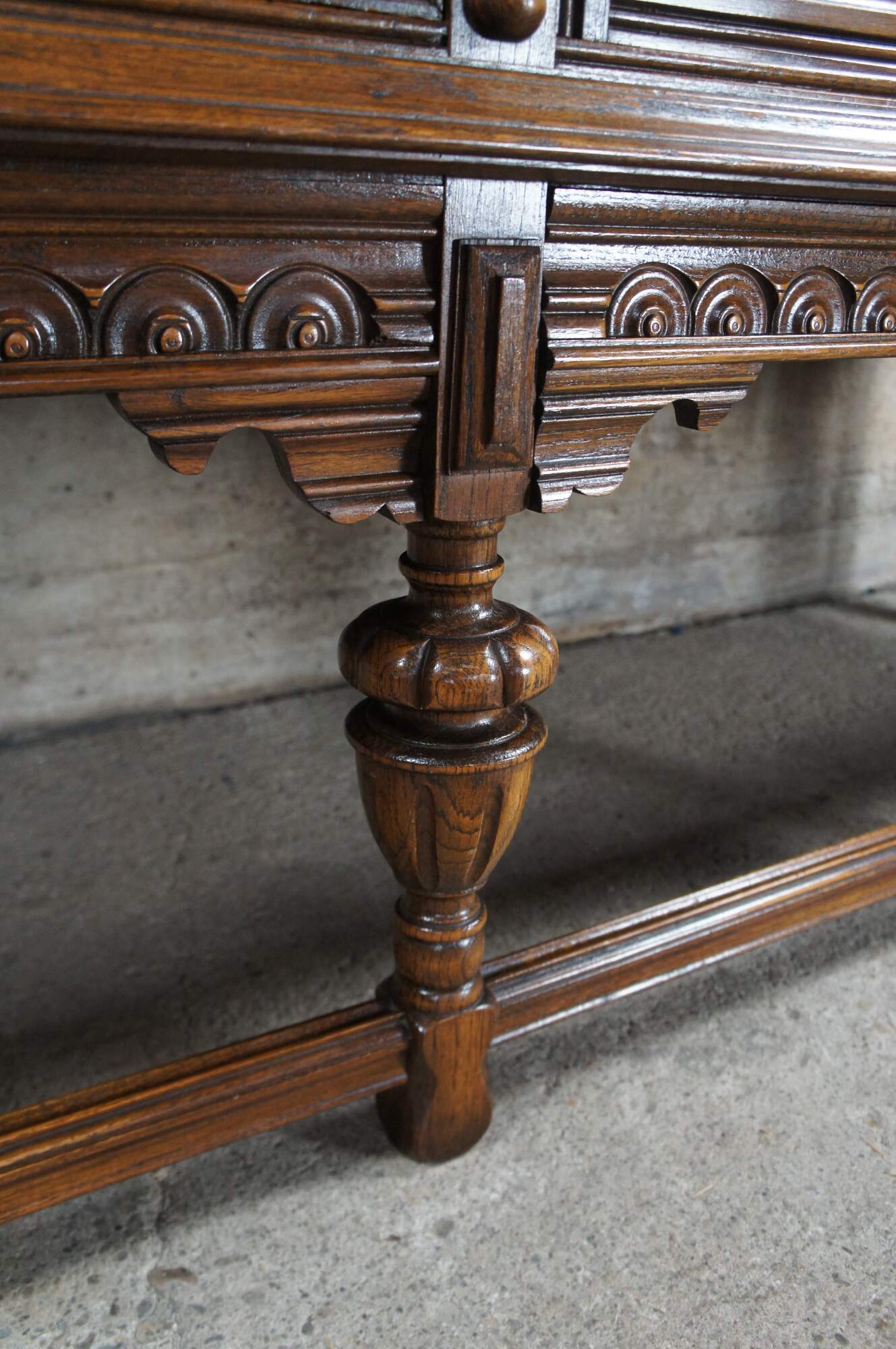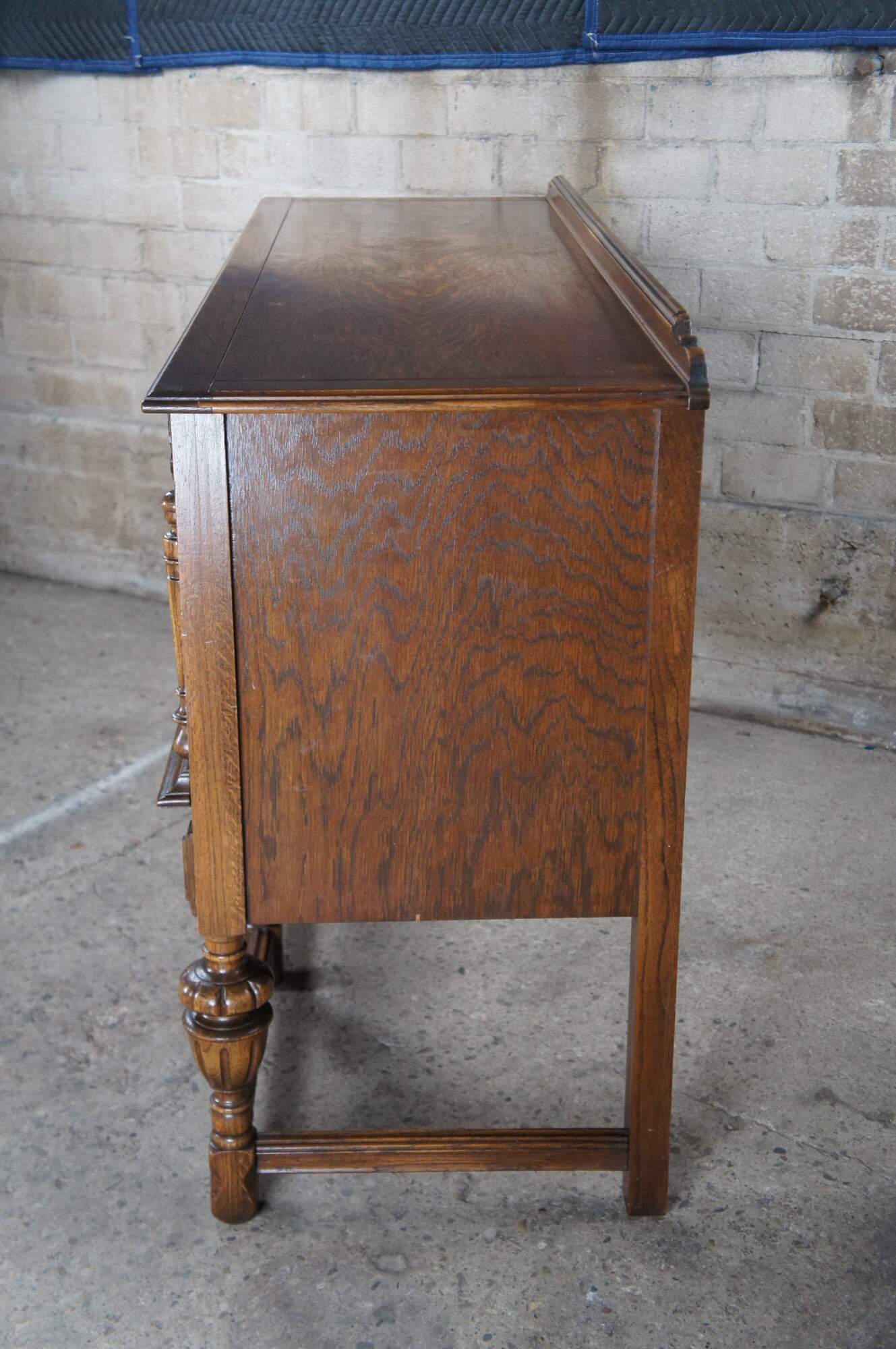 Early 20th Century Jacobean / Elizabethan revival court buffet / credenza / sideboard / console. Made from oak with two cabinets and two drawers featuring floral / acanthus / foliate design supported by beautifully turned baluster legs connected by stretcher.