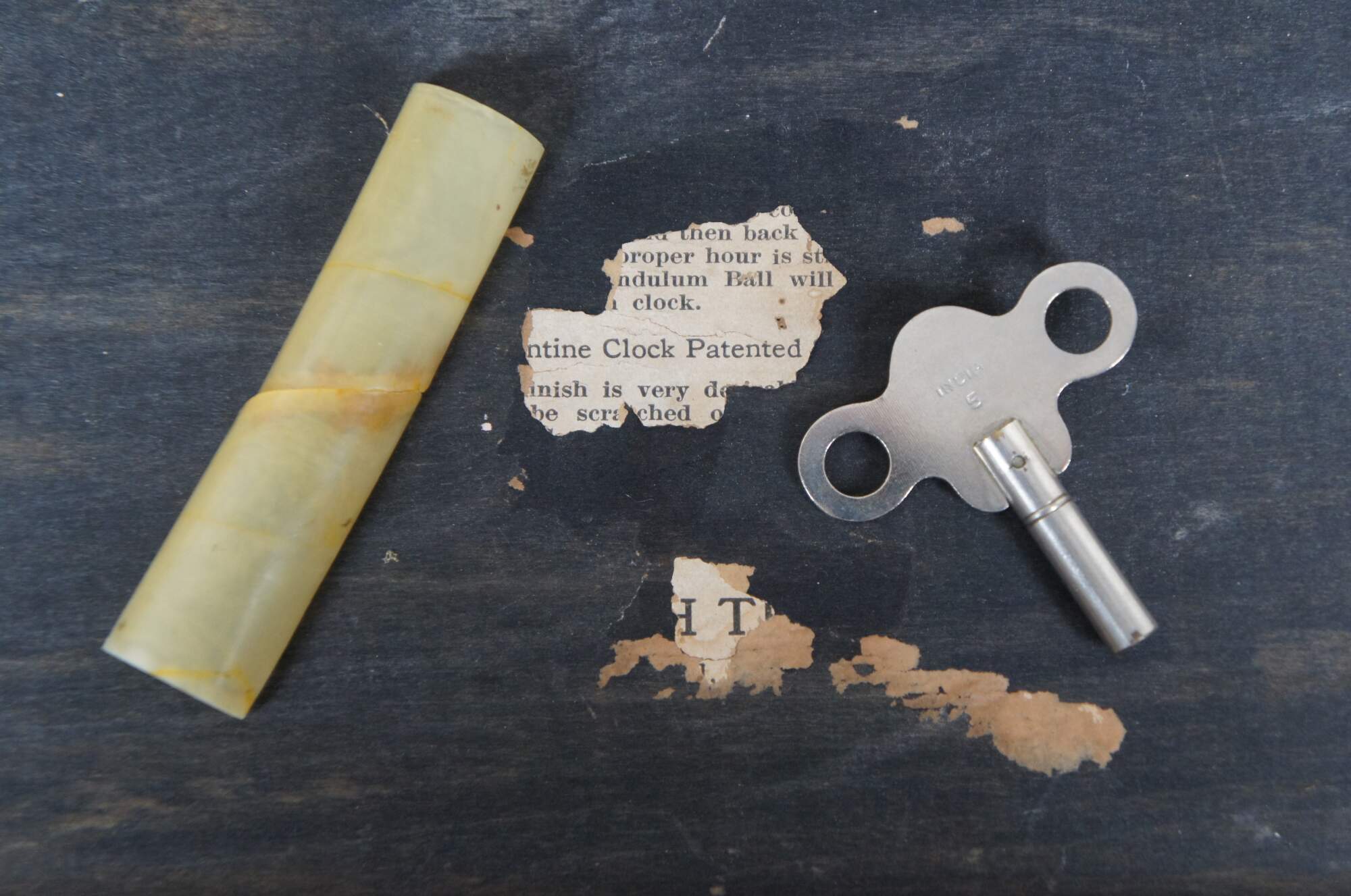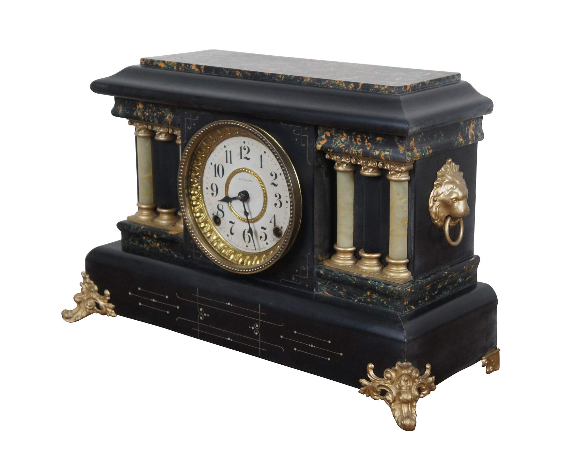 Early 20th century seth Thomas key wound, 8 day chiming mantel clock. Ebonized wood body with delicate white art deco details, green / orange / black adamantine accents and six off white adamantine columns. Brass acanthus leaf feet, lion's head ring handles and ionic column caps.