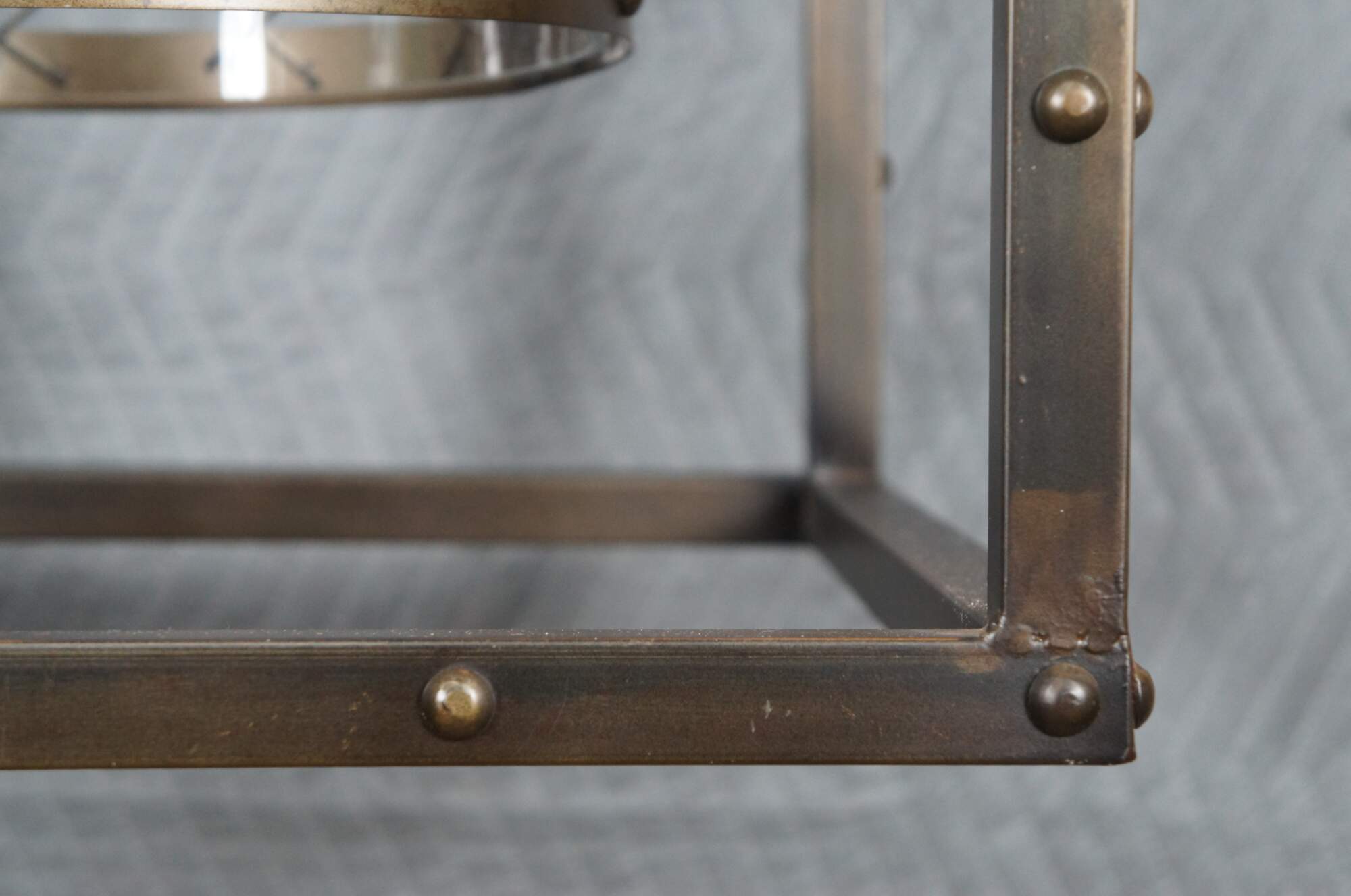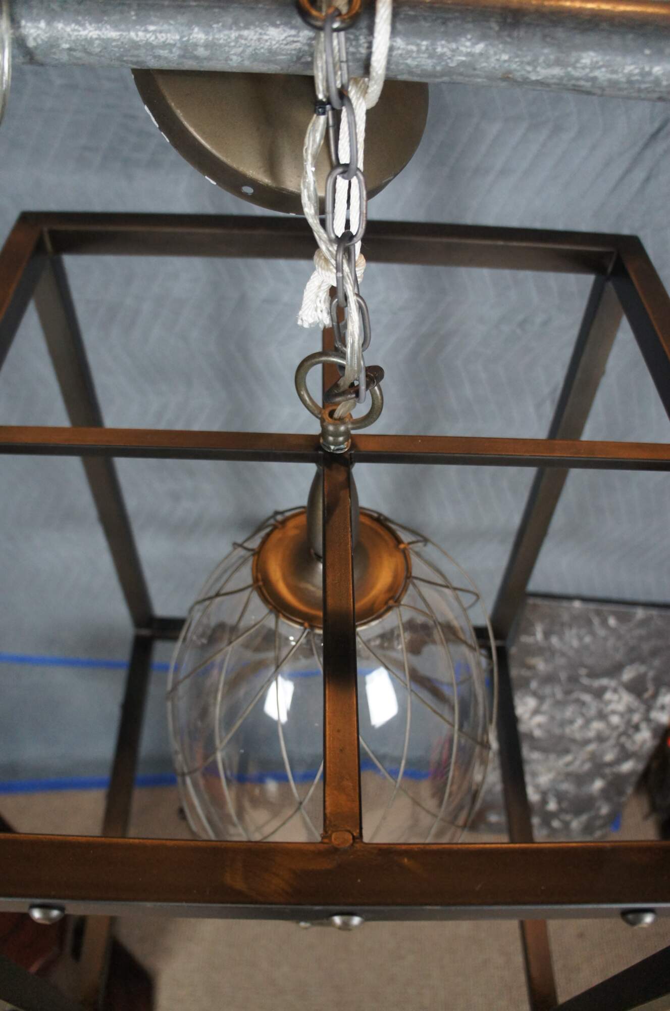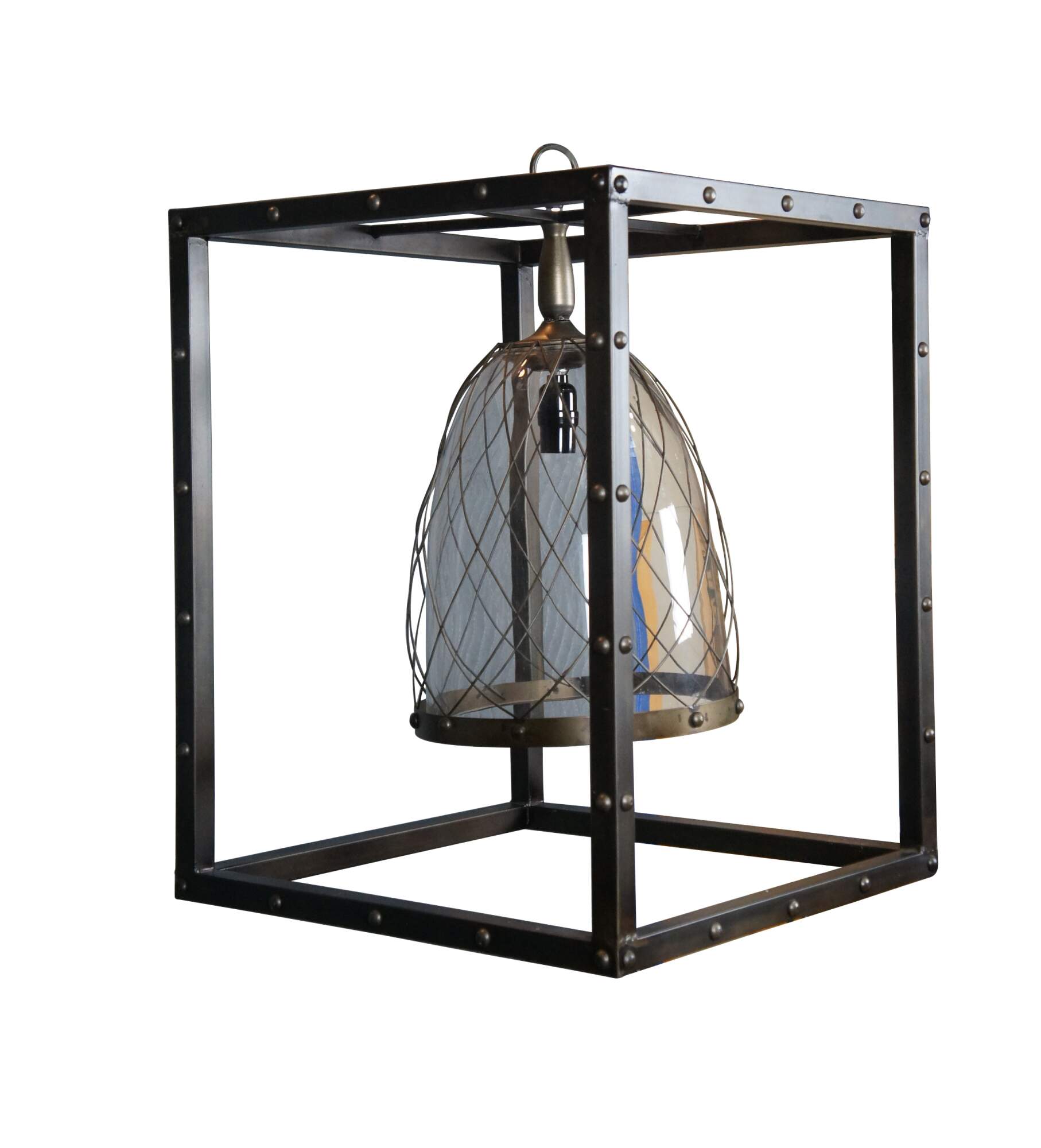 Vintage Karlin pendant swag light / chandelier. Features a modern / industrial style riveted rectangular frame around a glass bell wraped in a wire bird cage. Antique brushed nickel / oiled bronze finish. Plain round ceiling medallion. Hard wired.