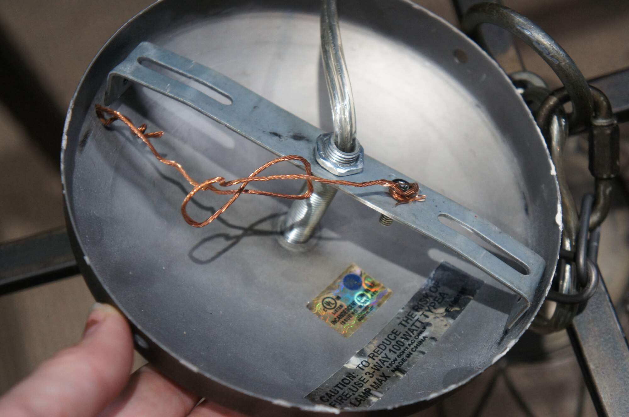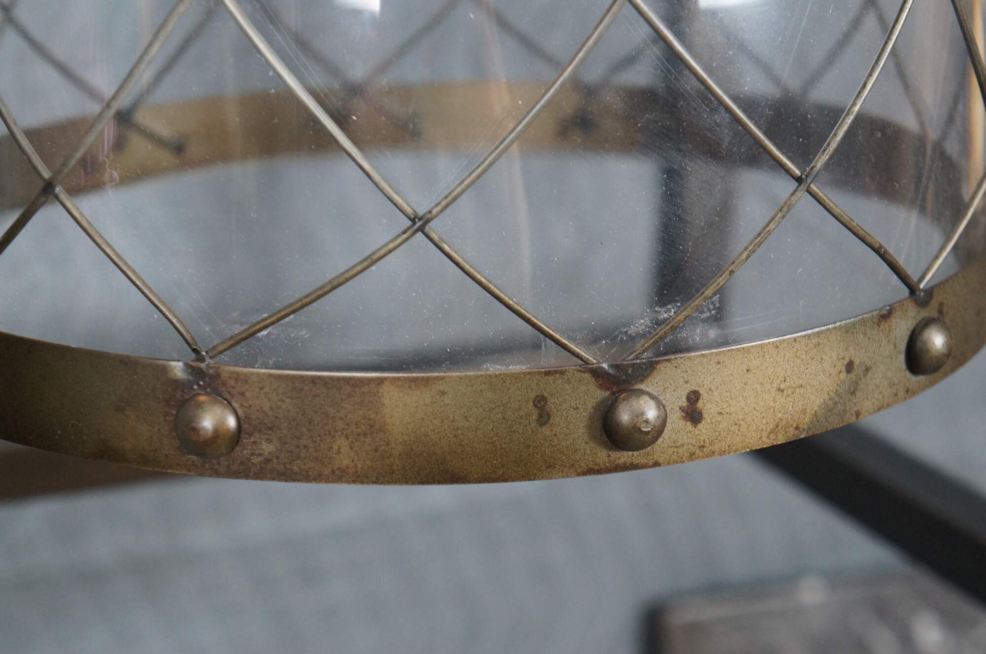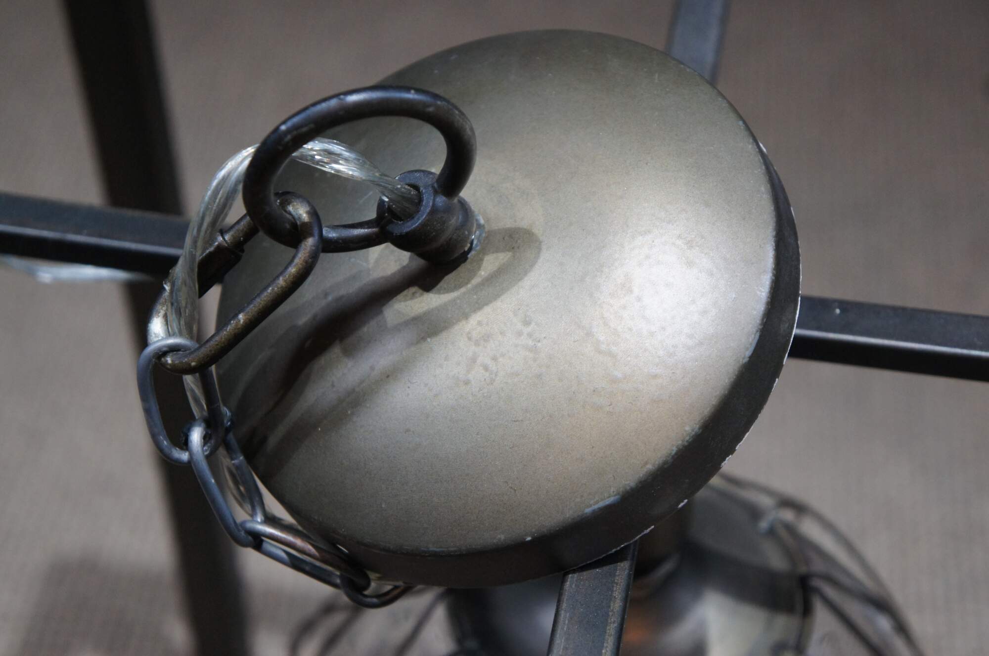 Vintage Karlin pendant swag light / chandelier. Features a modern / industrial style riveted rectangular frame around a glass bell wraped in a wire bird cage. Antique brushed nickel / oiled bronze finish. Plain round ceiling medallion. Hard wired.