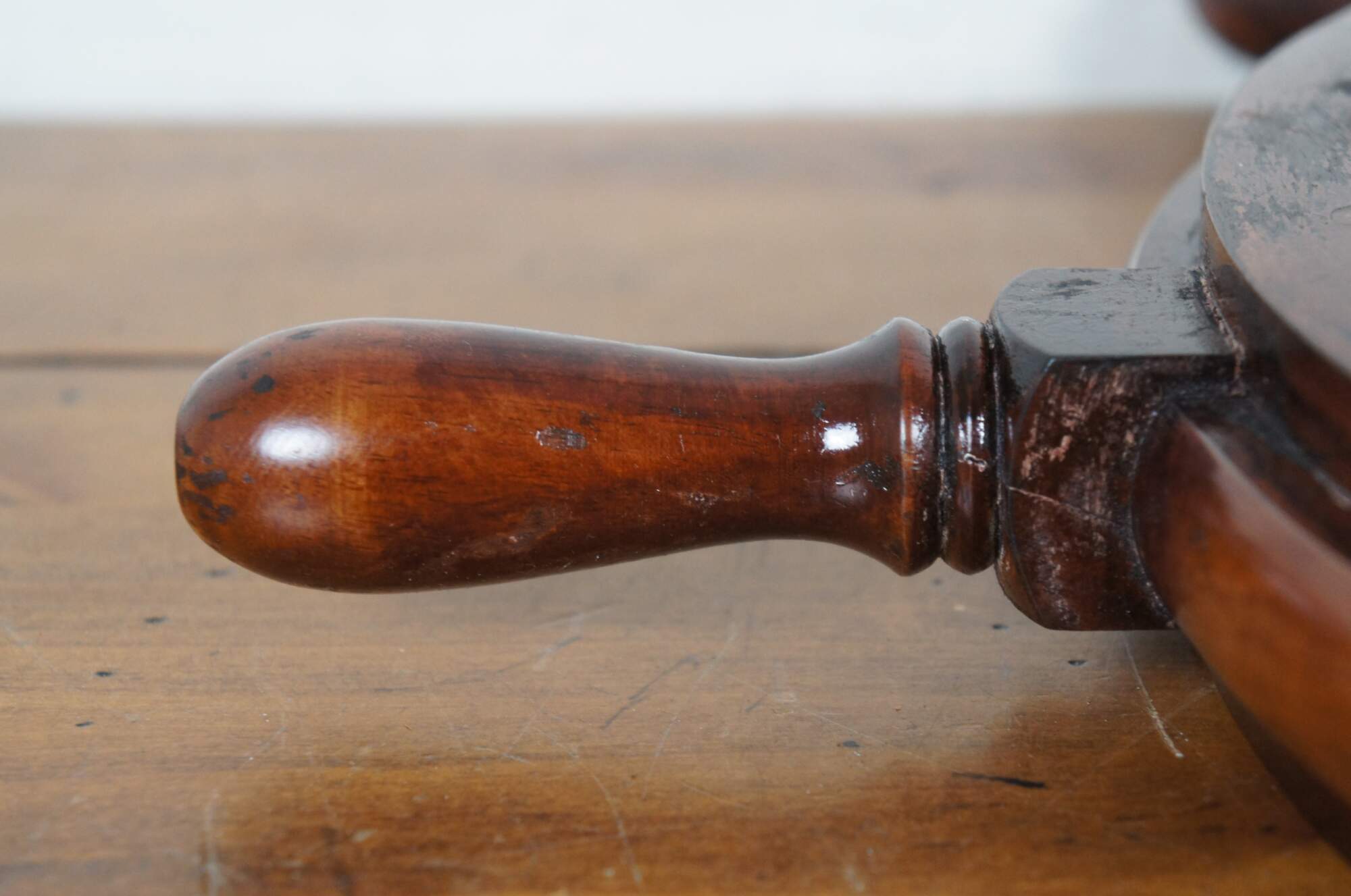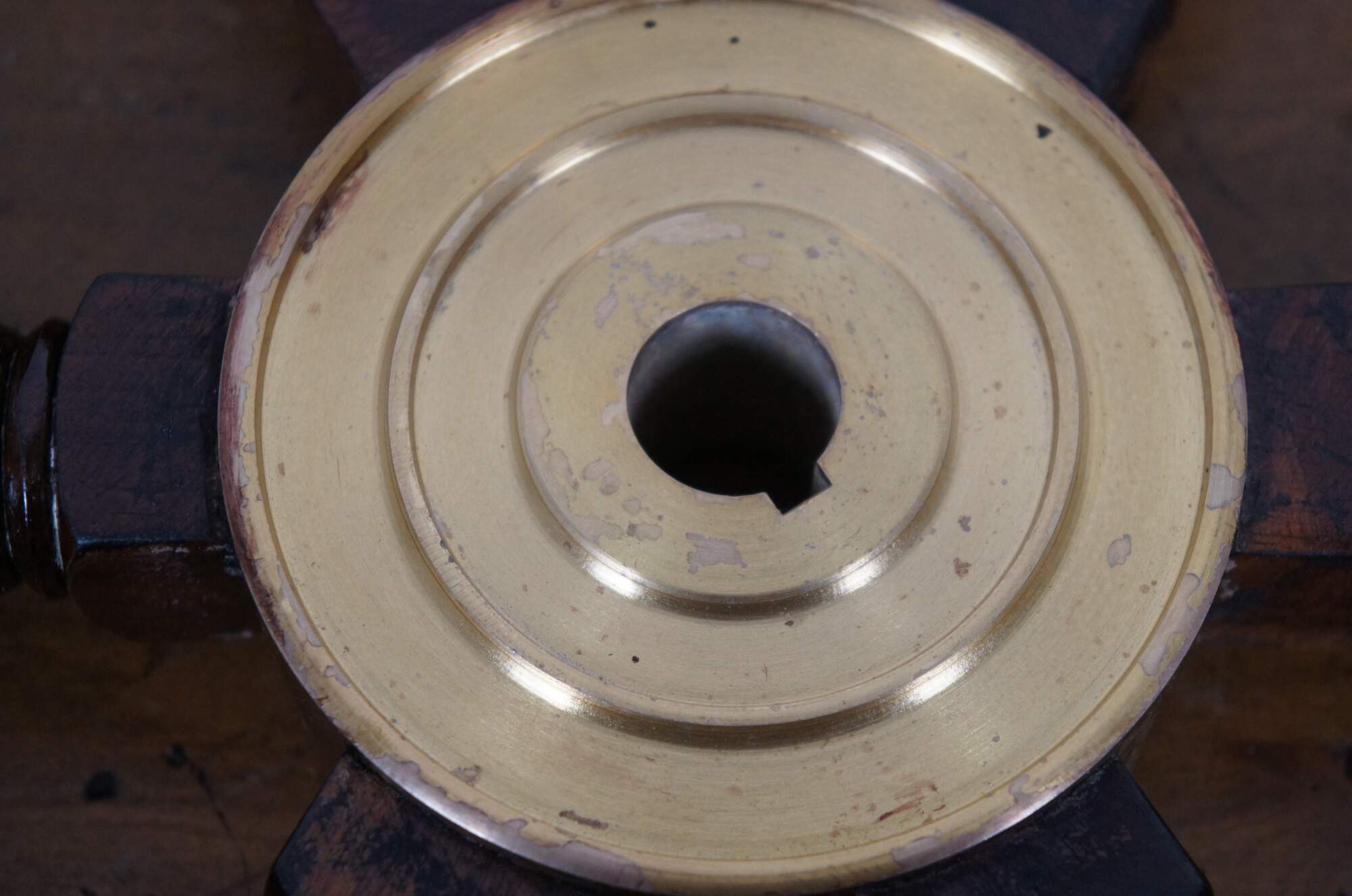 Mid 20th century wood and brass ship's steering wheel / helm. Traditionally styled with six turned spokes and brass center mount.