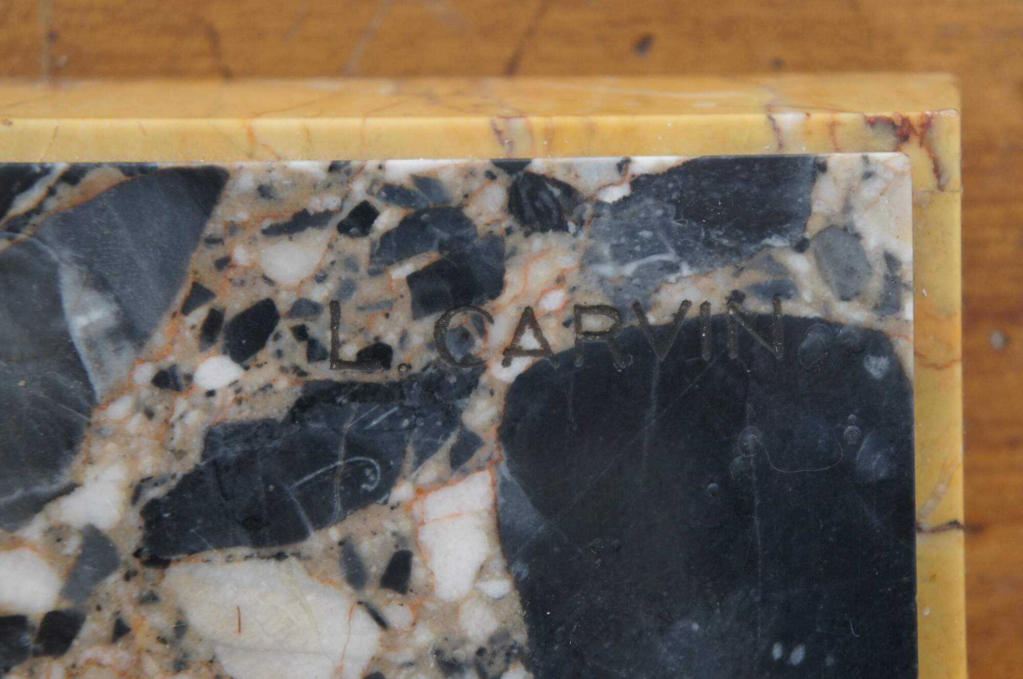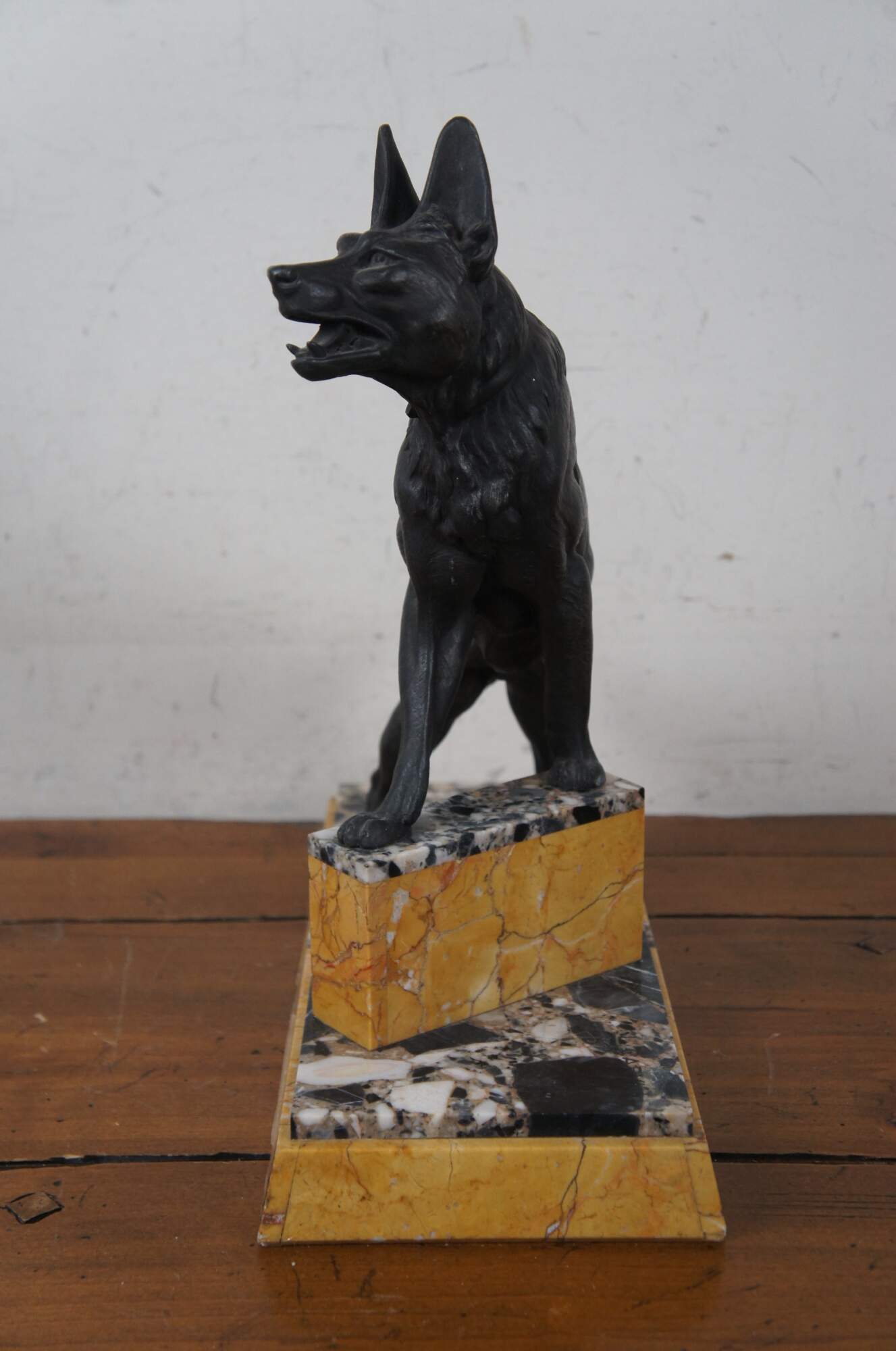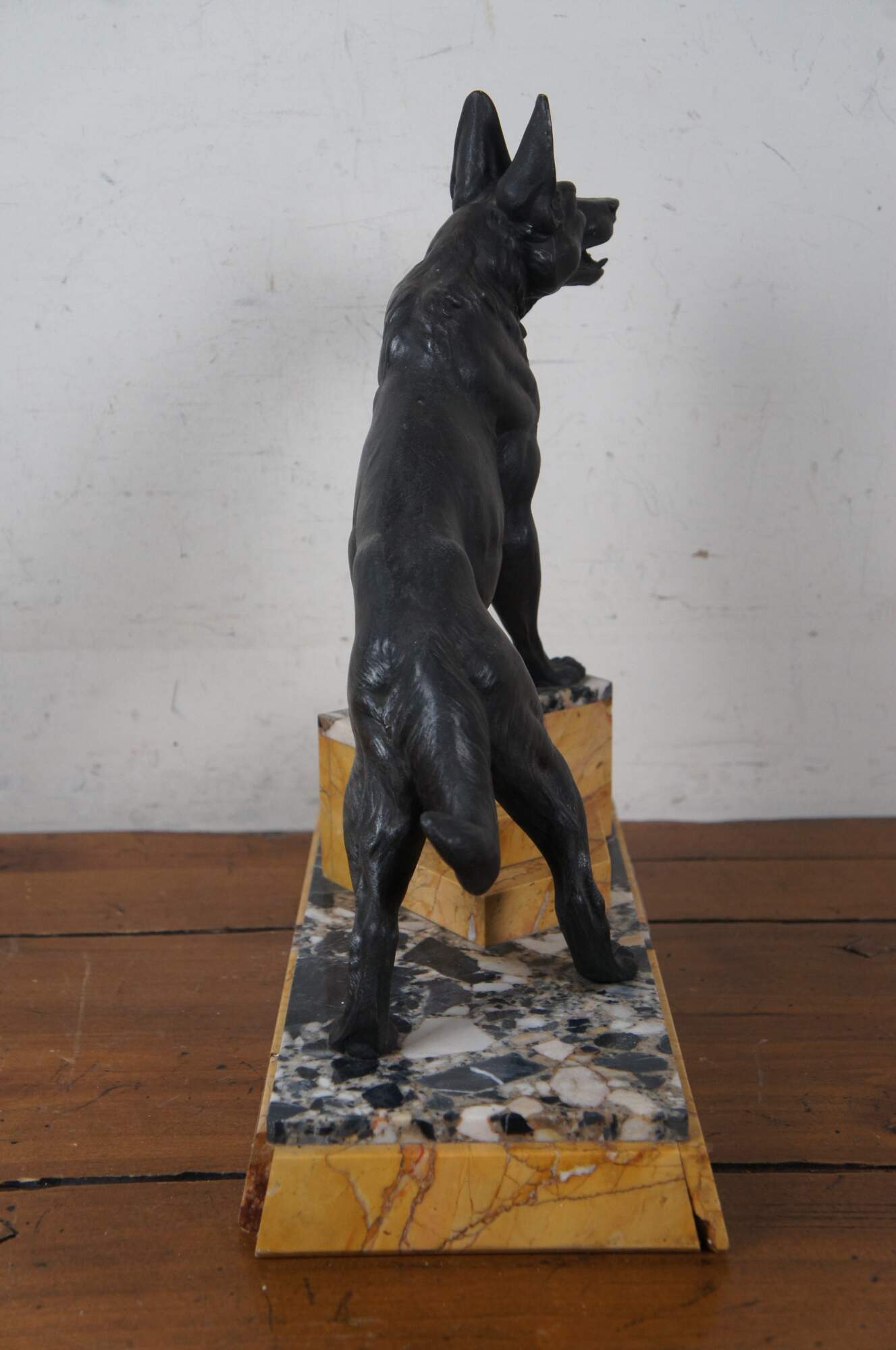 Antique early 20th century art deco spelter sculpture / statue after Louis Albert Carvin, depicting a large wolf like Alsatian German Shepherd / dog with collar, standing on a small set of steps crafted of golden yellow and black and white marble.