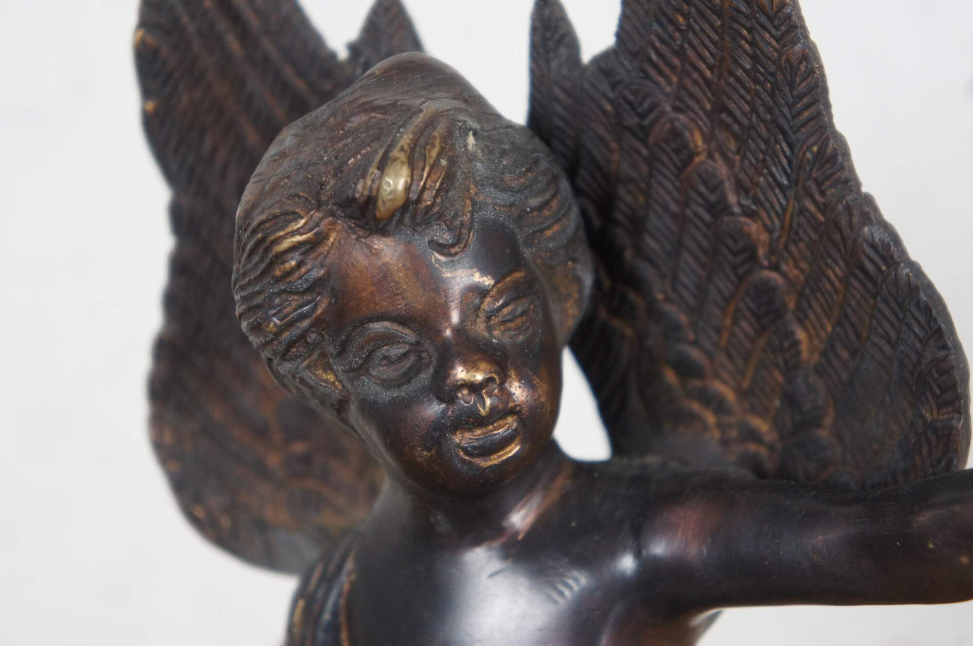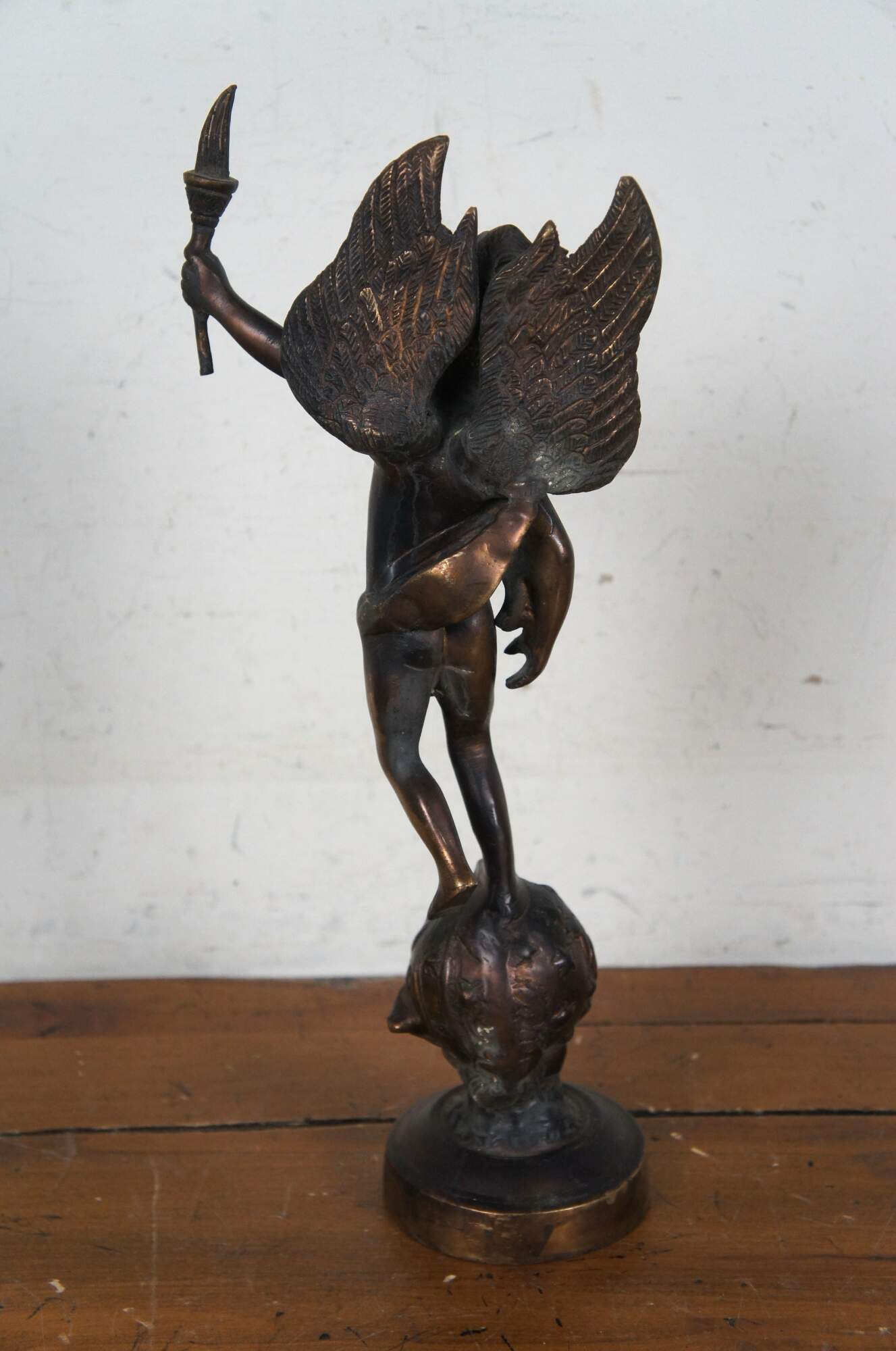 Vintage cast bronze sculpture / figurine in the shape of a putto / cherub / angel carrying a torch, perched on top of a globe studded with stars.
