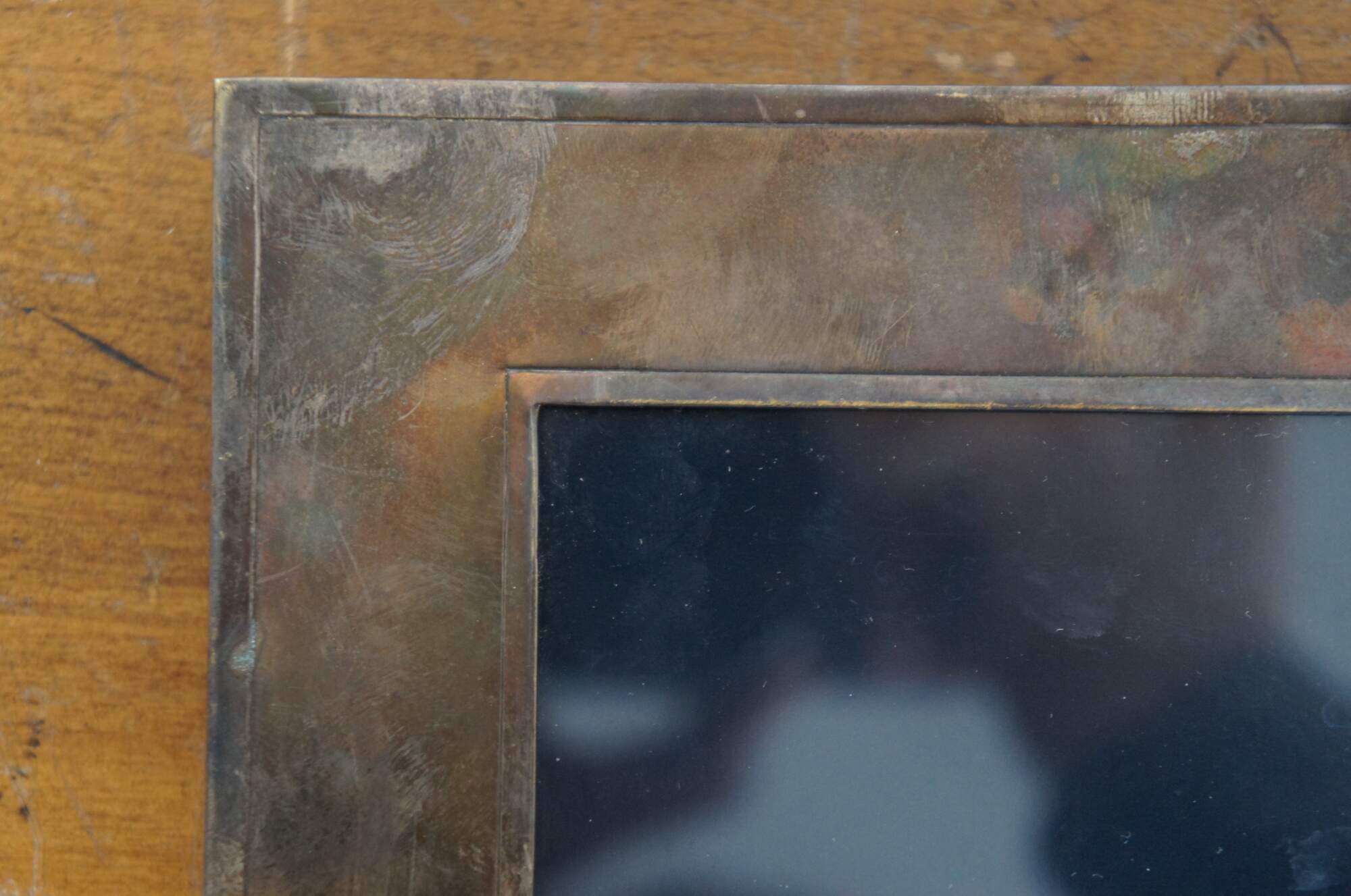 Rare vintage Ralph Lauren silver plate easel style photo frame, simple rectangular design with lined border and applied polo pony logo in lower right corner. Black fabric back secured with sliding monogram latch.