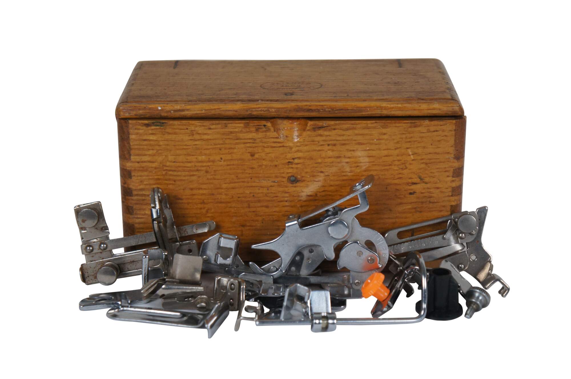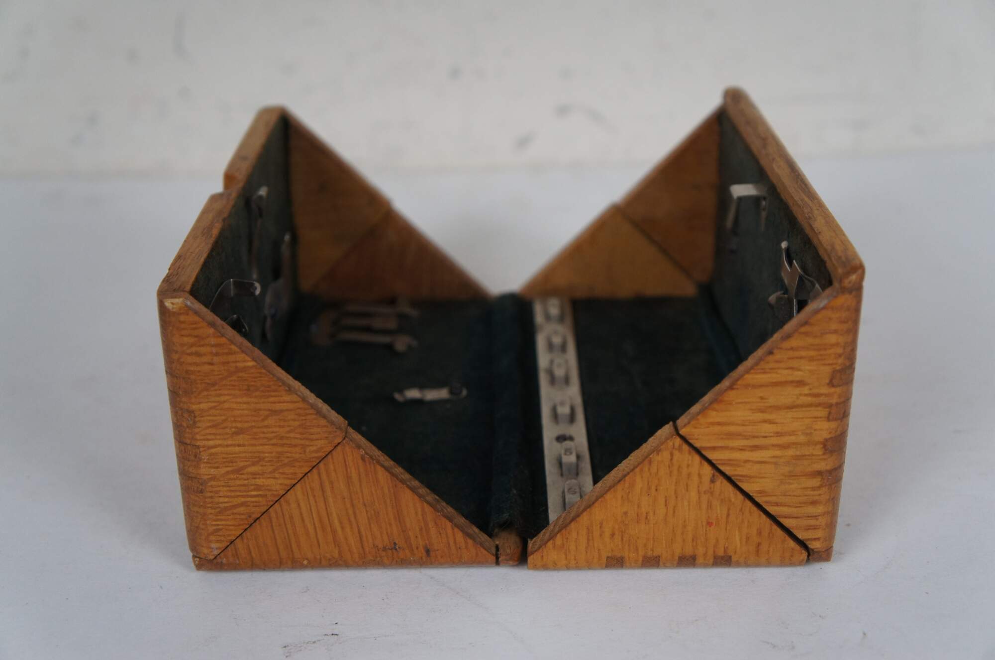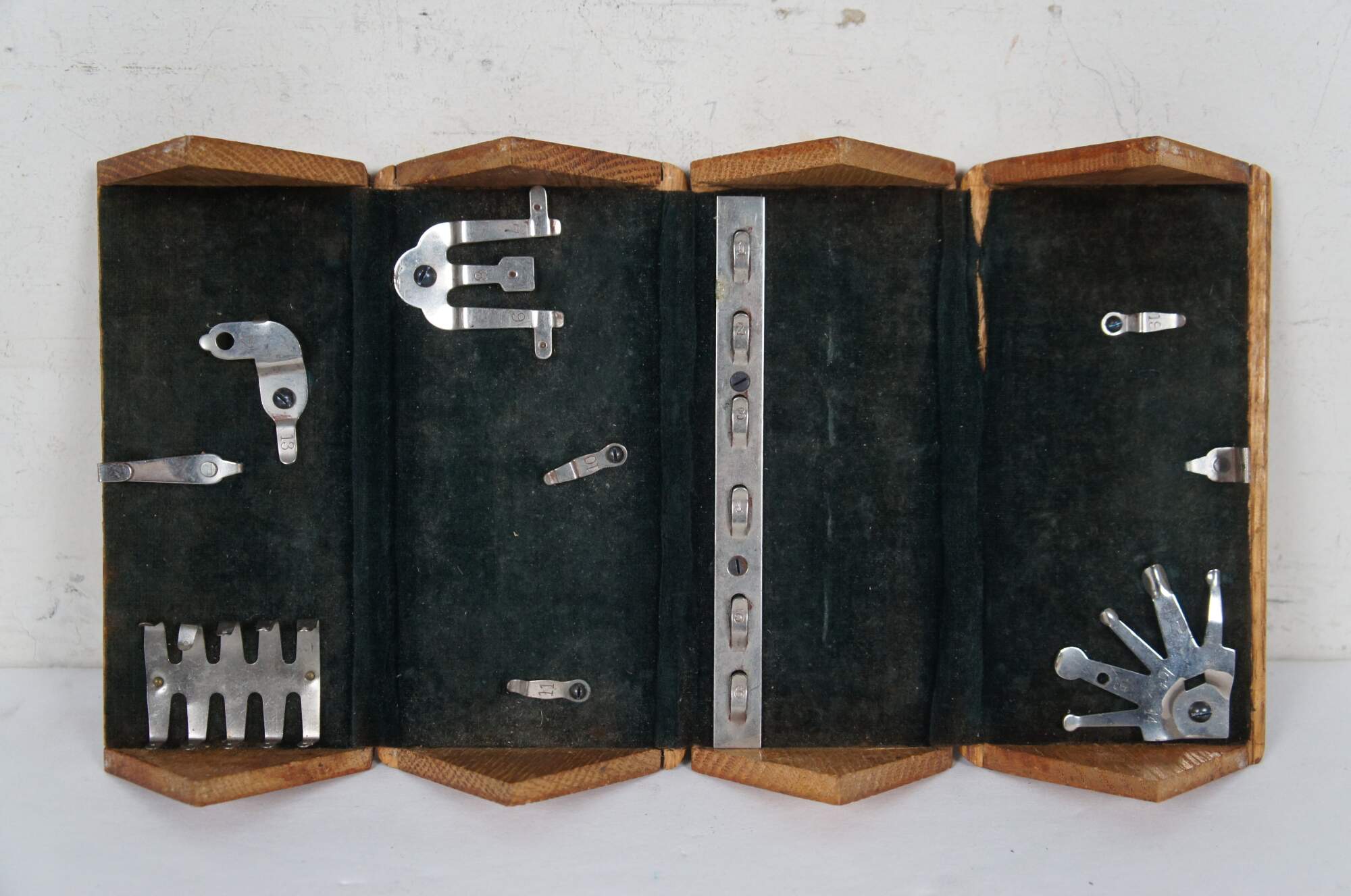 Late 19th century folding box for storing sewing machine feet / attachments. Dovetailed corners. Four triangular sections roll together into a rectangular case. Lined in dark green velvet. Patented February 19, 1889. Includes 11 assorted sewing machine feet / accessories.