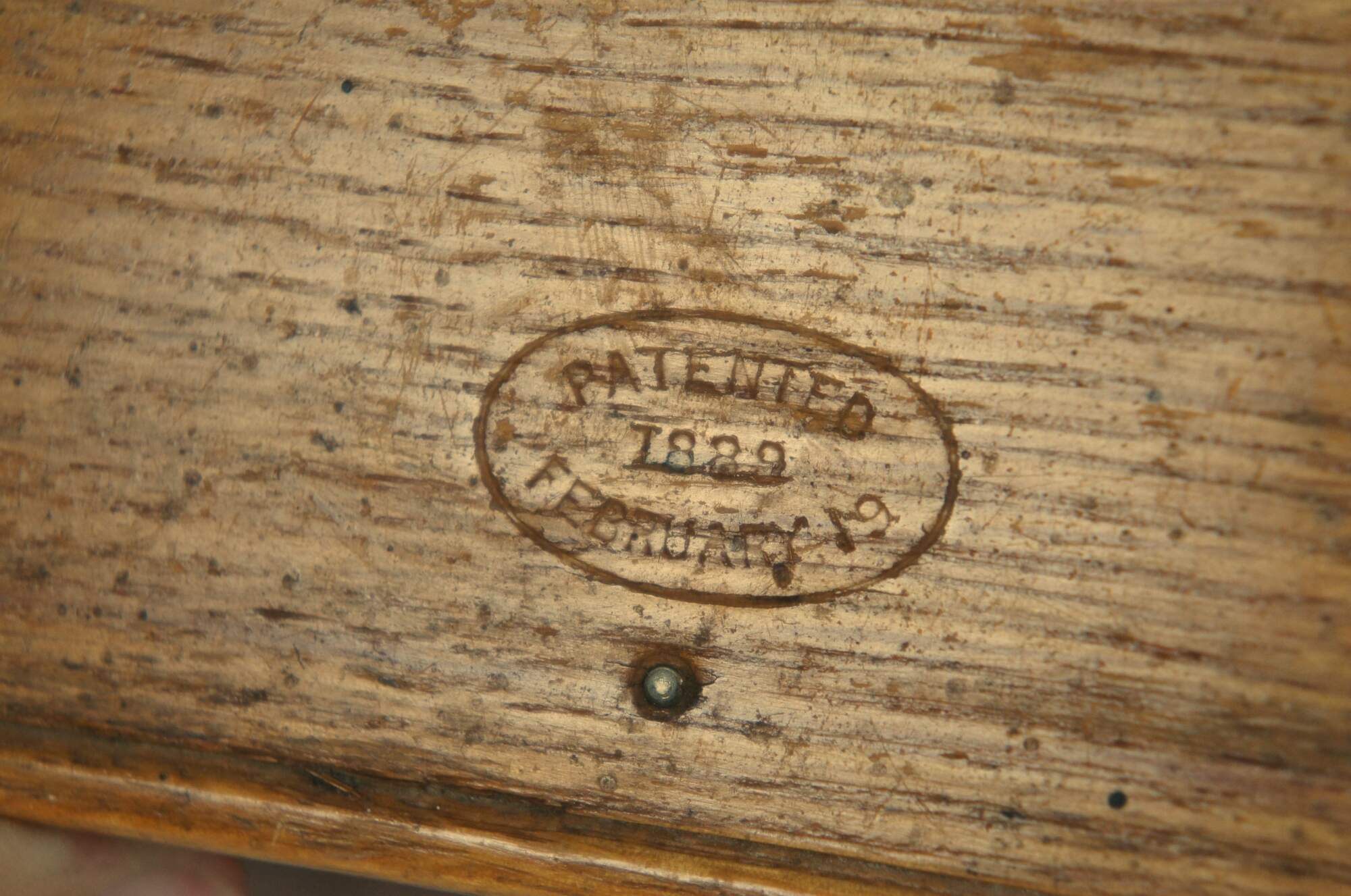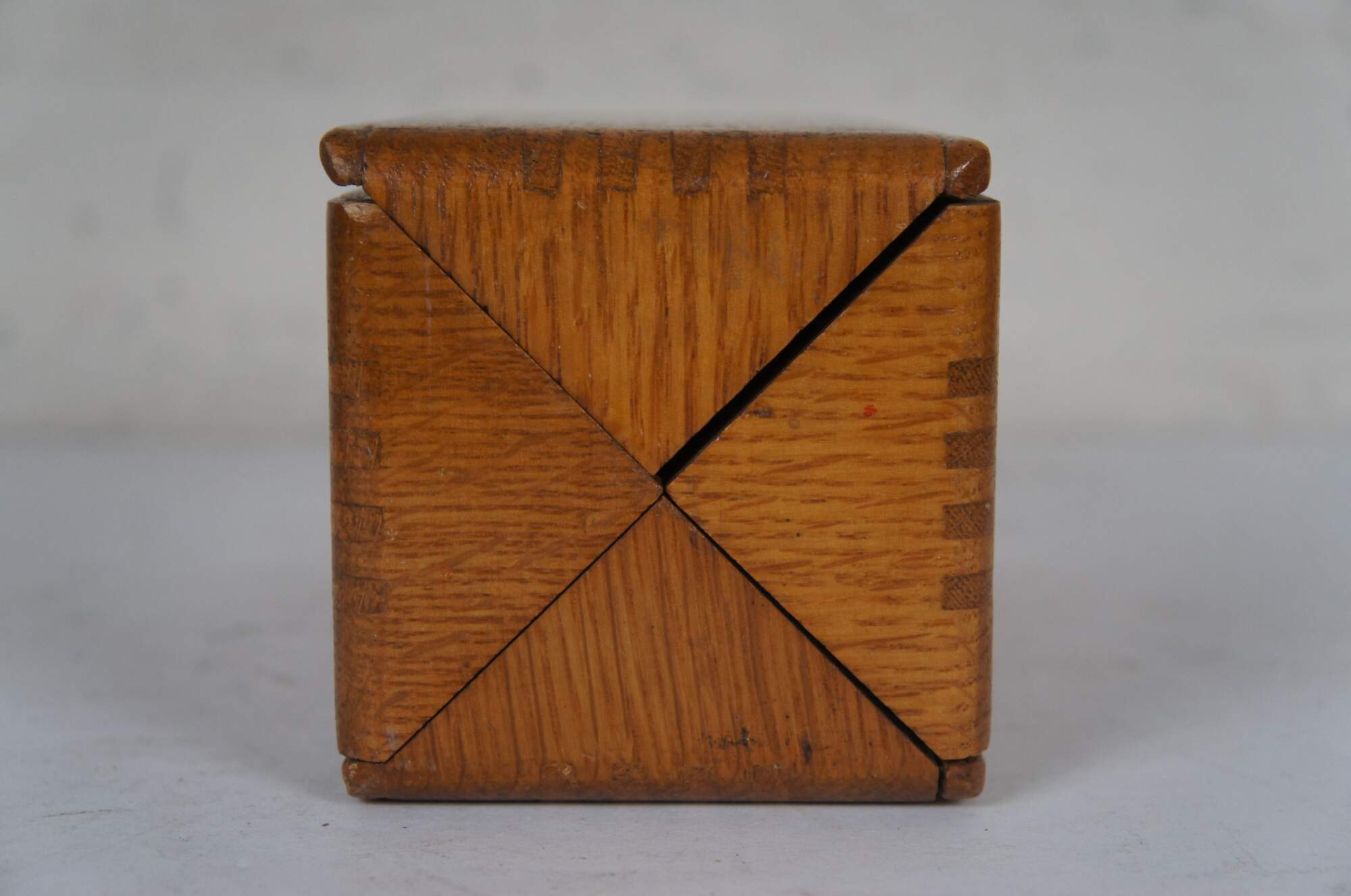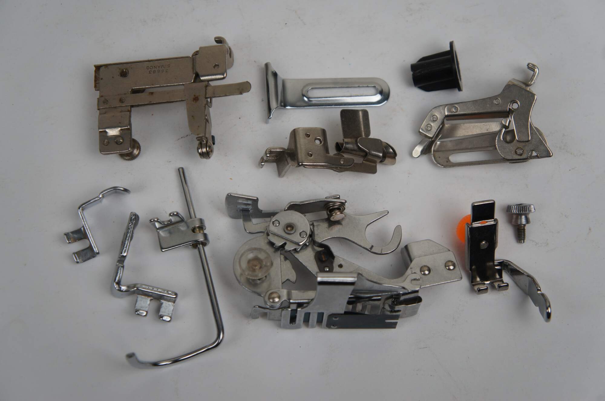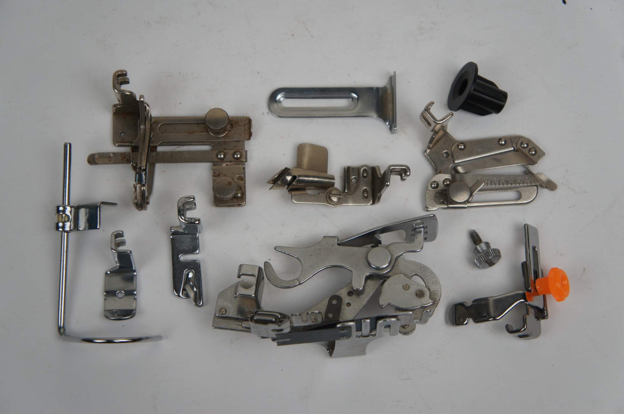 Late 19th century folding box for storing sewing machine feet / attachments. Dovetailed corners. Four triangular sections roll together into a rectangular case. Lined in dark green velvet. Patented February 19, 1889. Includes 11 assorted sewing machine feet / accessories.