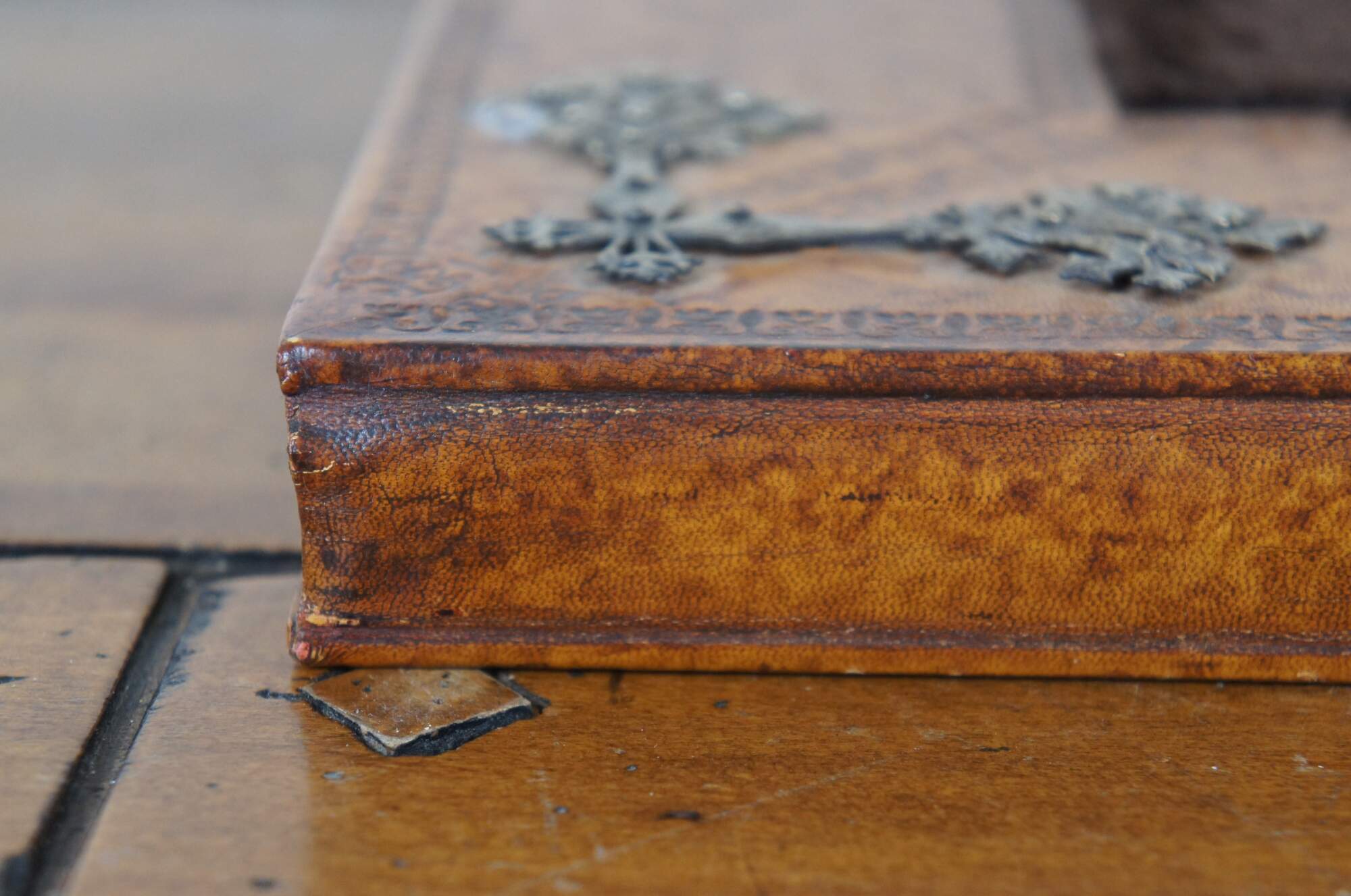 Vintage late 20th century Maitland Smith French Regency style photo album / scrap book. Bound in mottled tooled leather with panel of faux fur at the center, and accented with a shield and floral silver plate appliques. Raw edged blank pages.