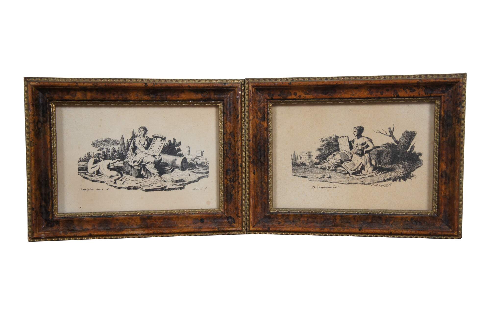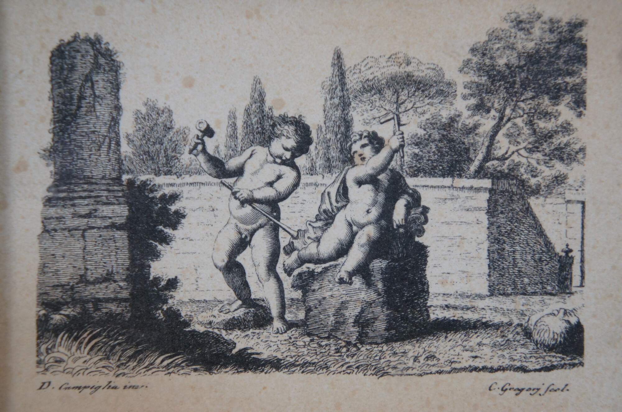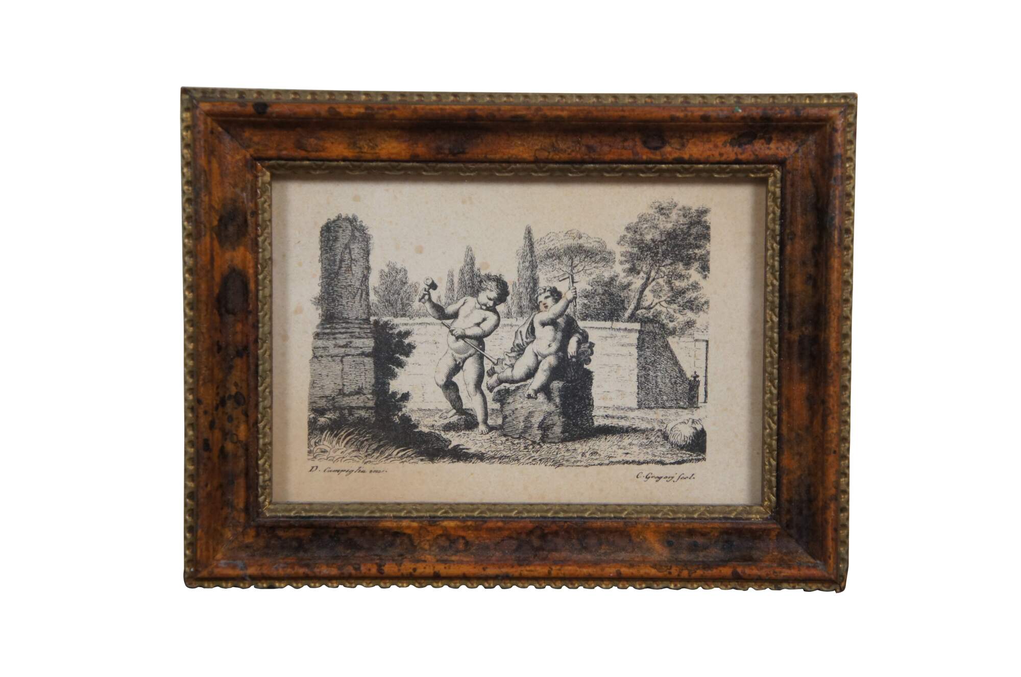 Set of 3 late 19th-early 20th century neoclassical engravings after the work of Giovanni Domenico Campiglia. Prints feature women / children / puttis / cherub figures in classical Roman / Italian landscapes and ruins. Mottled antiqued frame with carved gilt edges. Framed by H. Hal Kramer, Chicago.