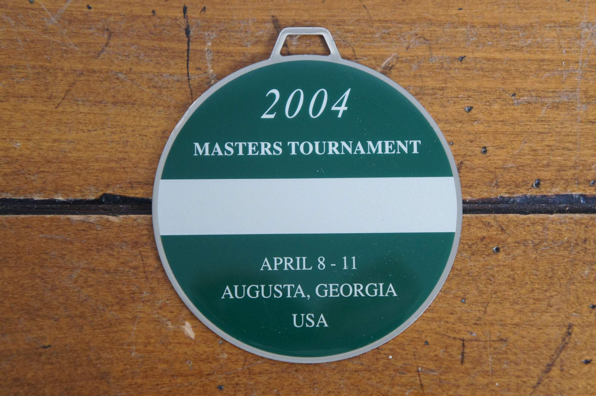 Pair of metal golf bag tags from the 2002 and 2004 PGA Masters Tournament in Augusta, GA. Includes green leather buckle straps and plastic cases.