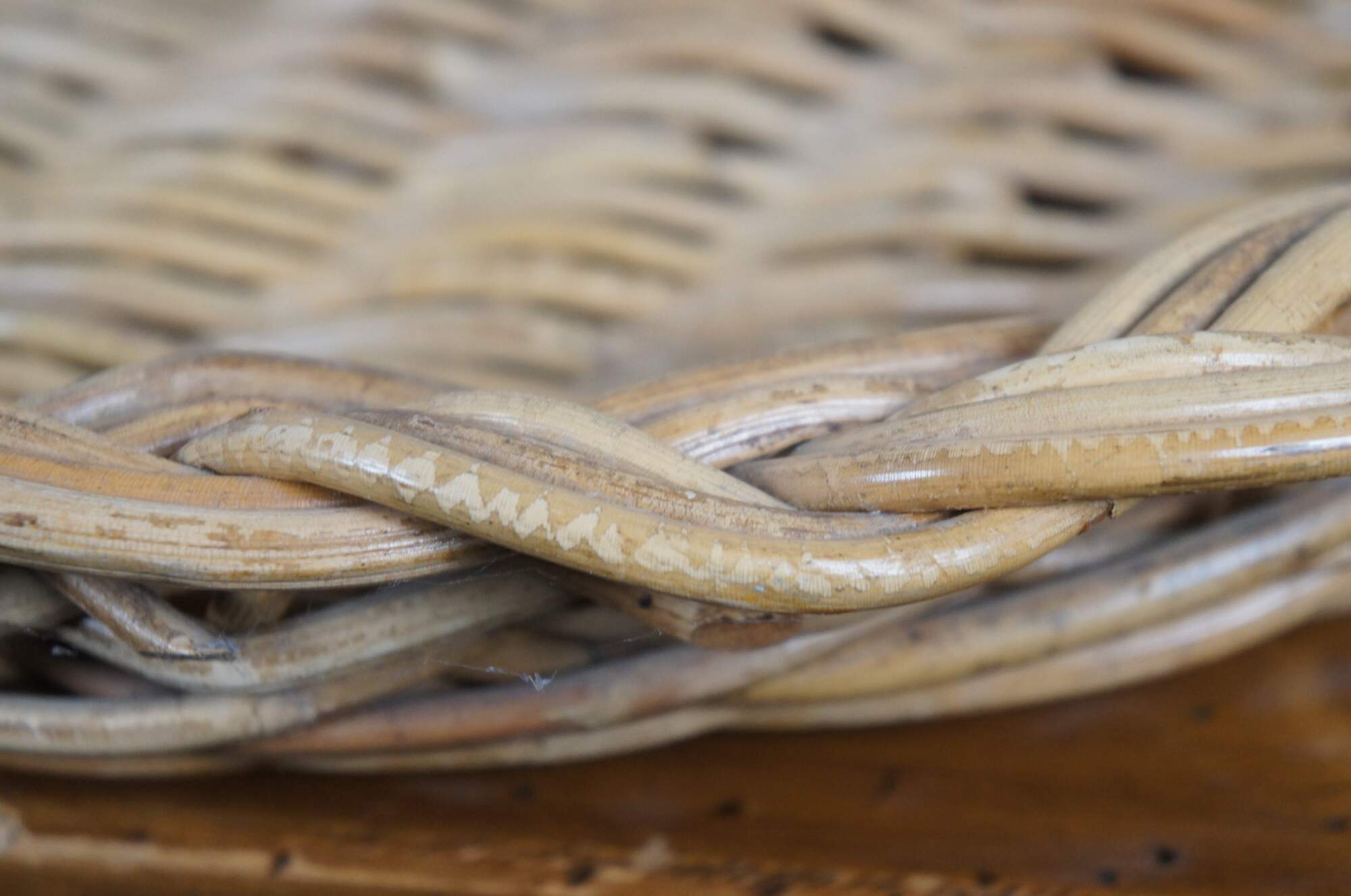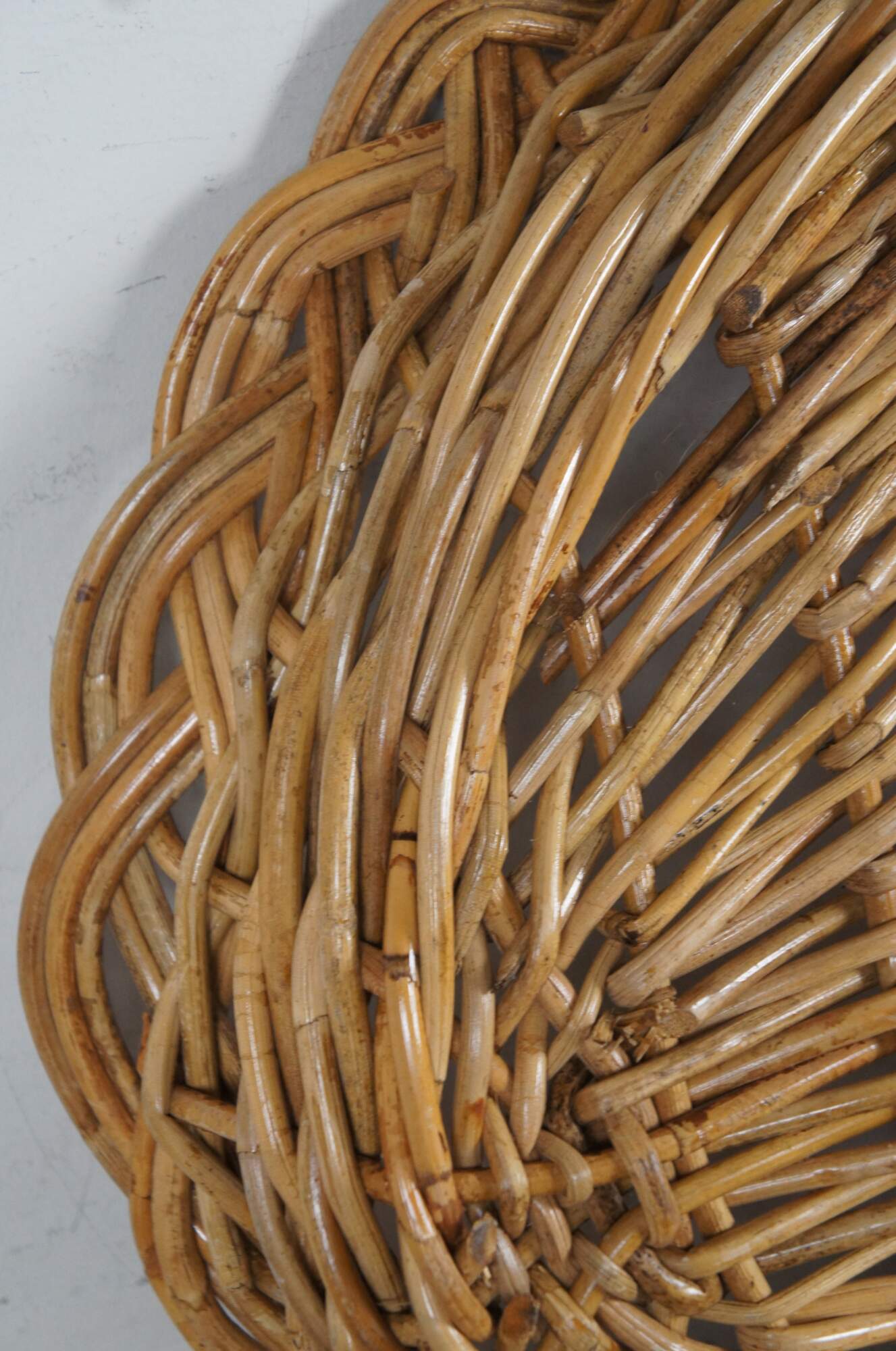 Late 20th century large rustice woven willow basket tray. Oval / boat shape with low sloping edges; braided design around the rim. Newspaper, storage, centerpiece, serving, country, farmhouse, harvest.