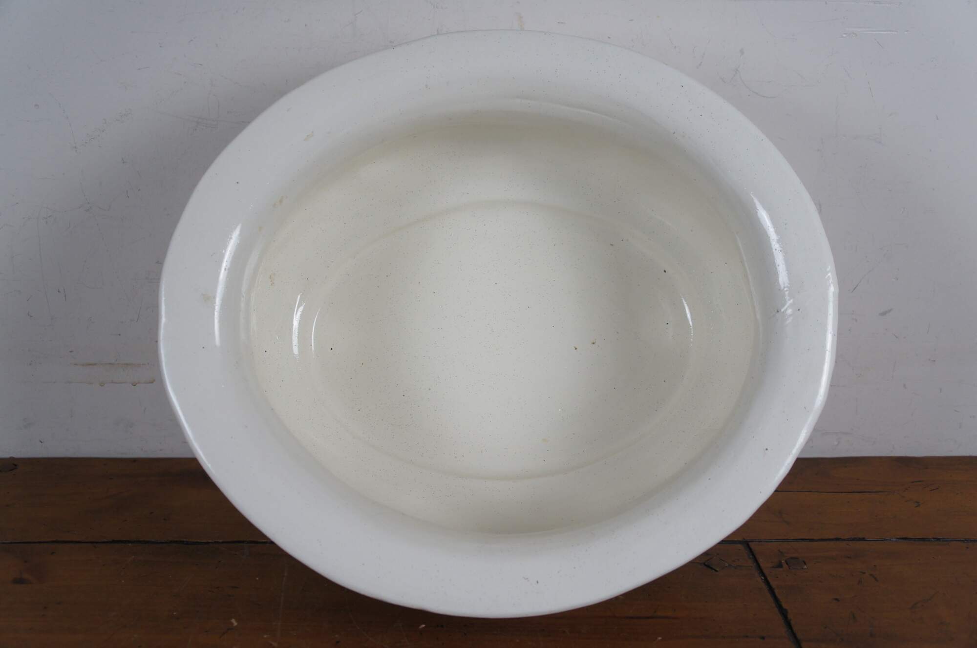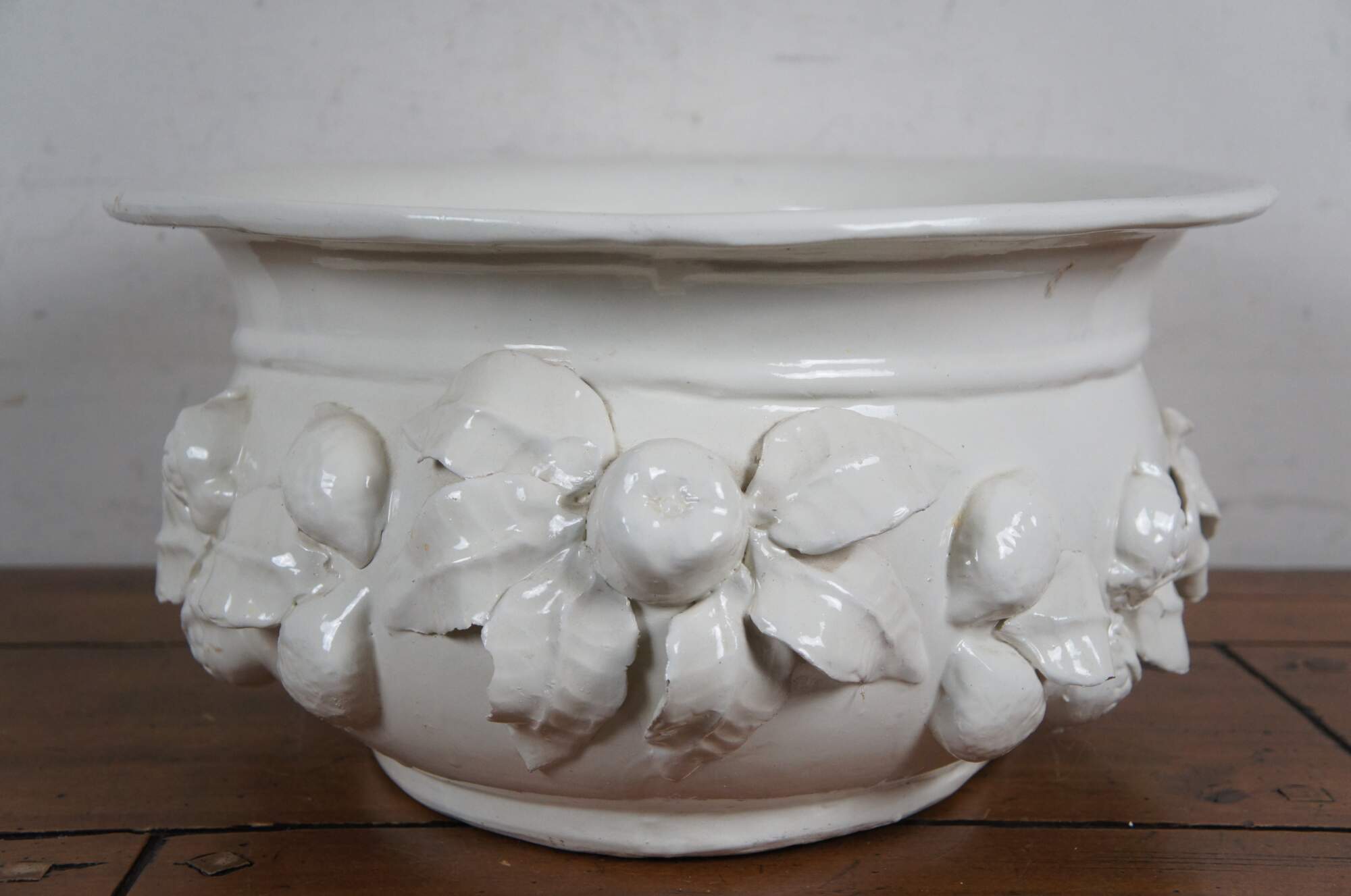 Late 20th century white glazed ceramic planter. Oval shape with flared rim, embellinshed with a garlands of leaves , pomegranates and lemons in high relief. Made in Italy for Neiman Marcus. Fruit centerpiece bowl, planter, flower pot, jardiniere, cachepot.