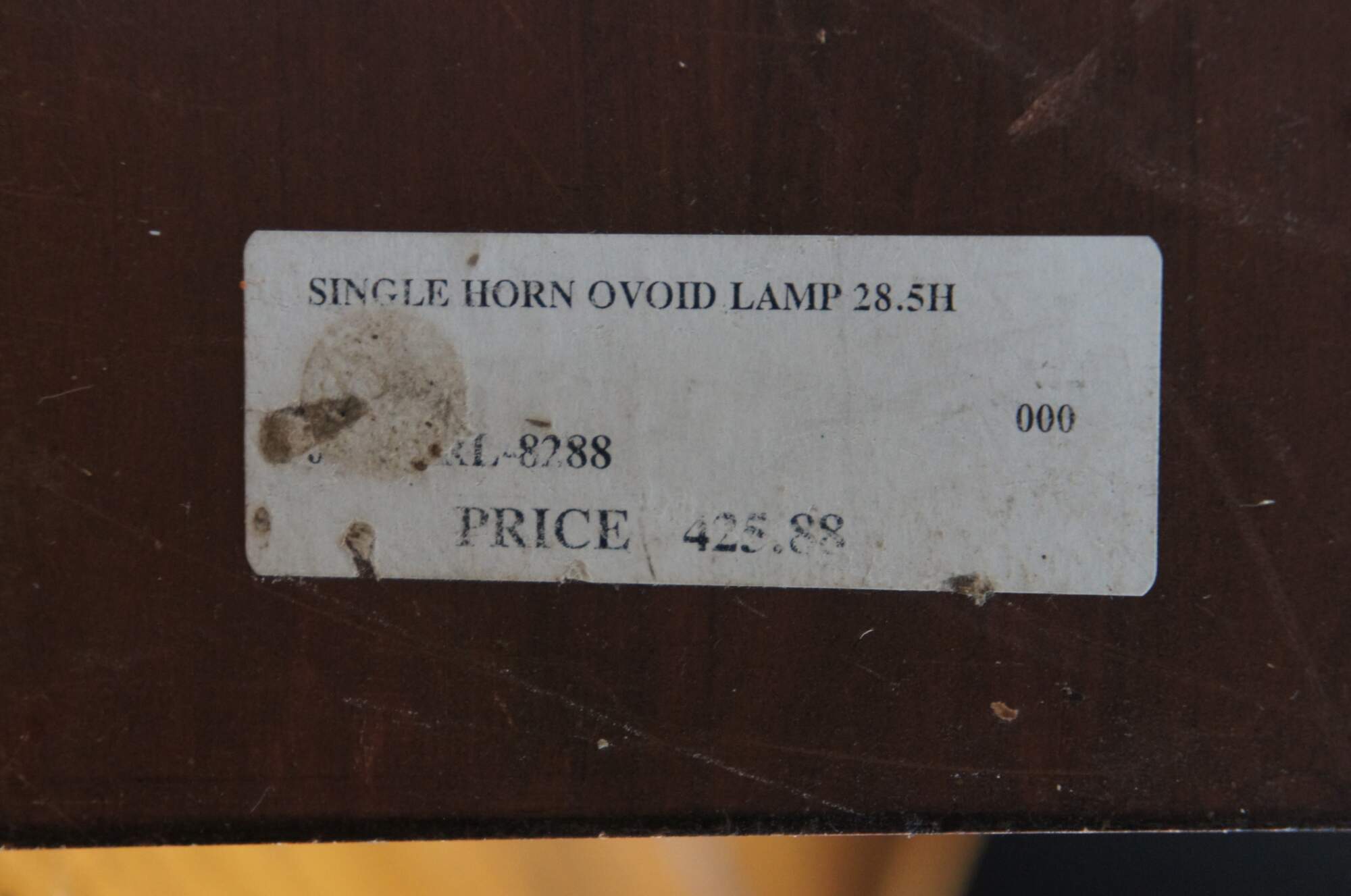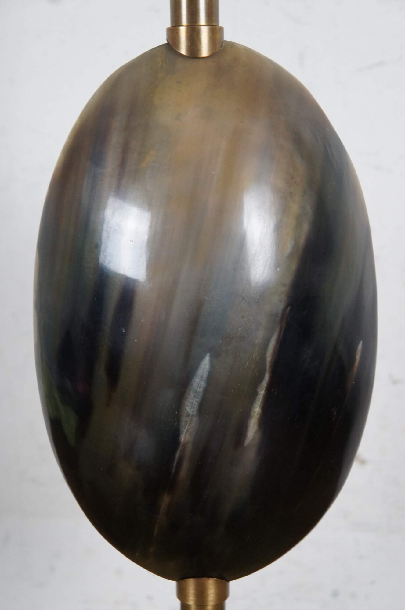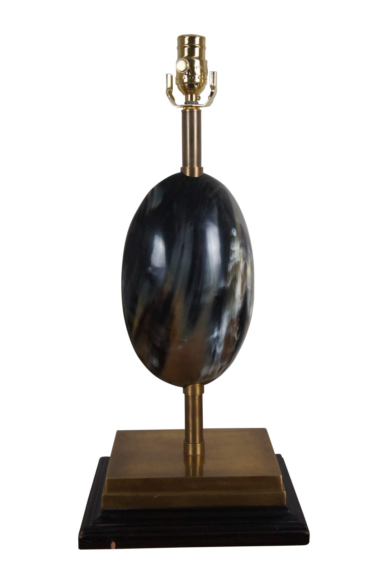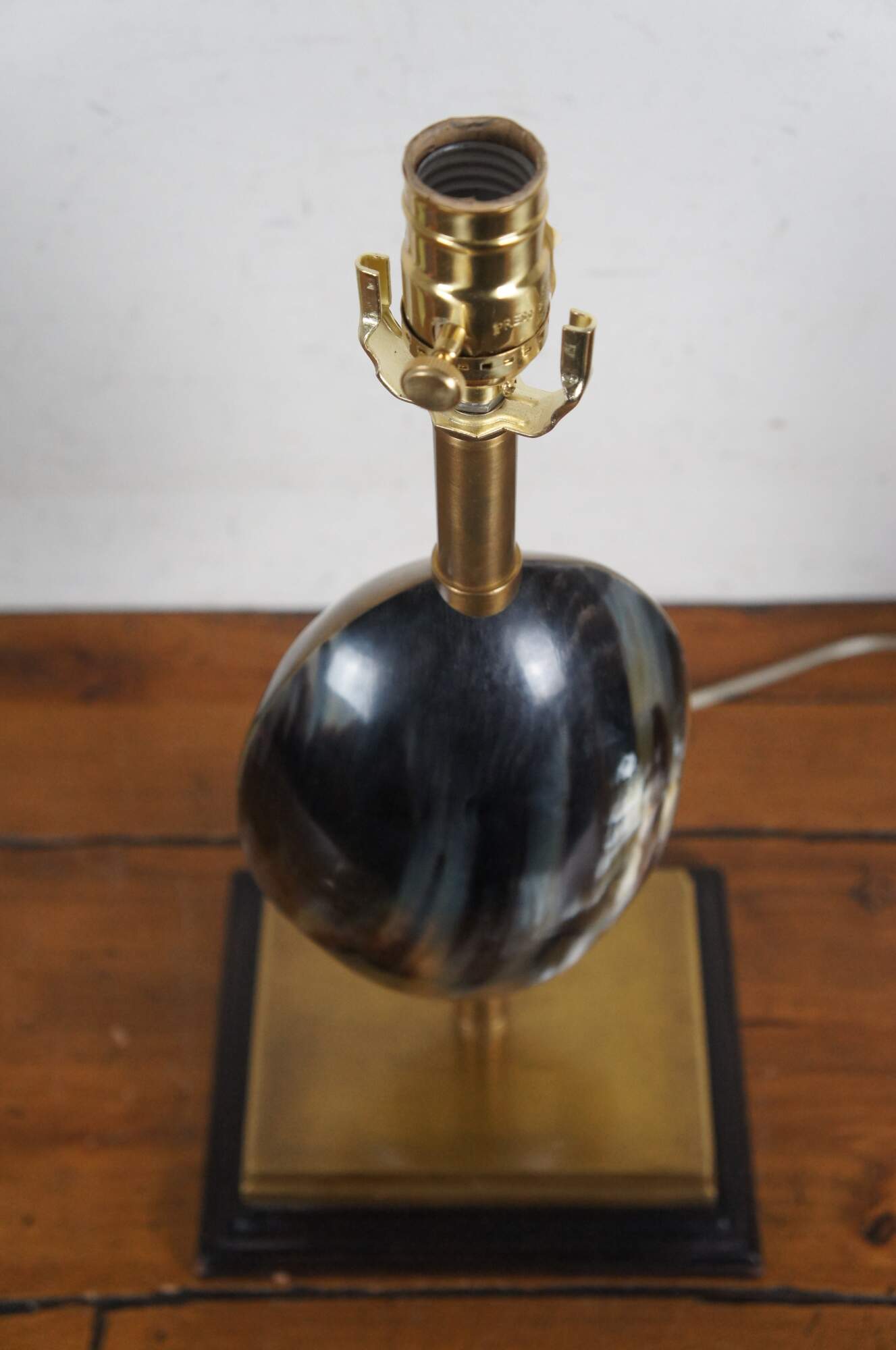 Vintage single horn Ovid lamp by John Richard. Square black and giltwood stepped base, brass column accented with a black and brown horn oval. Includes harp, brass orb finial and original black fabric drum shade with foiled interior.