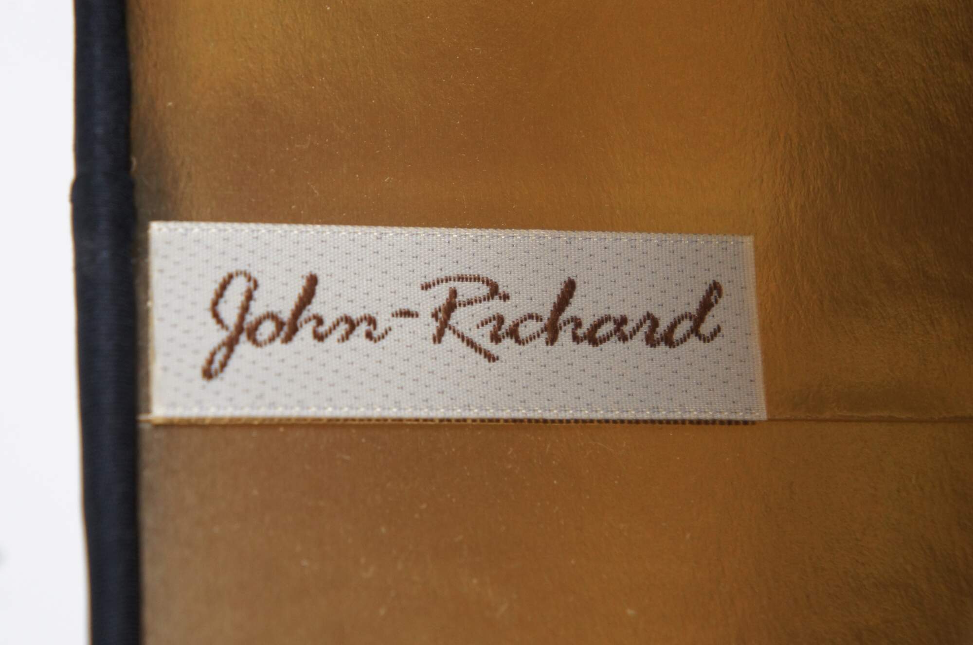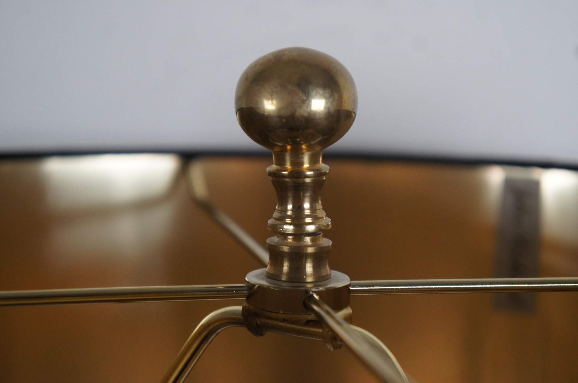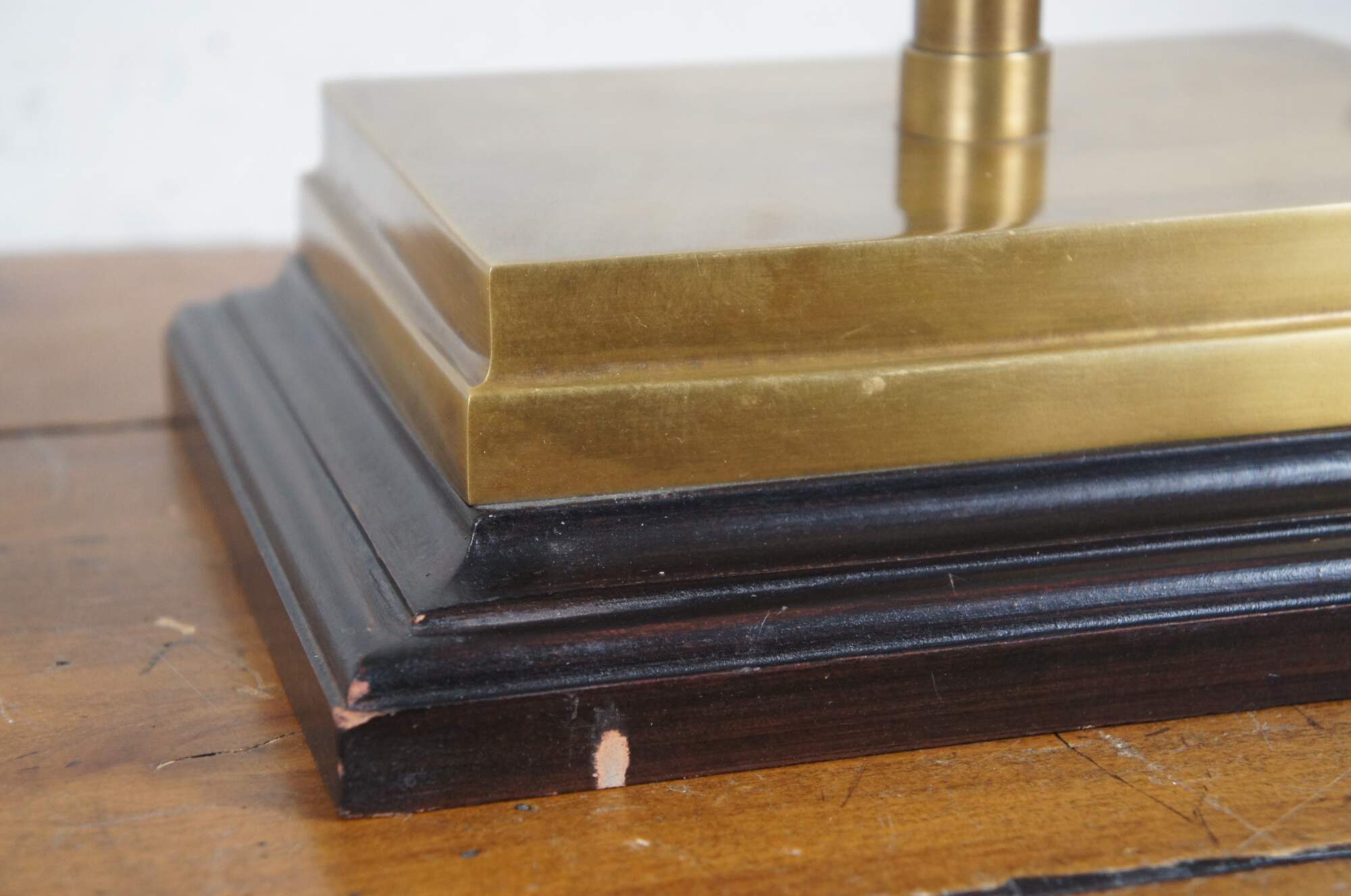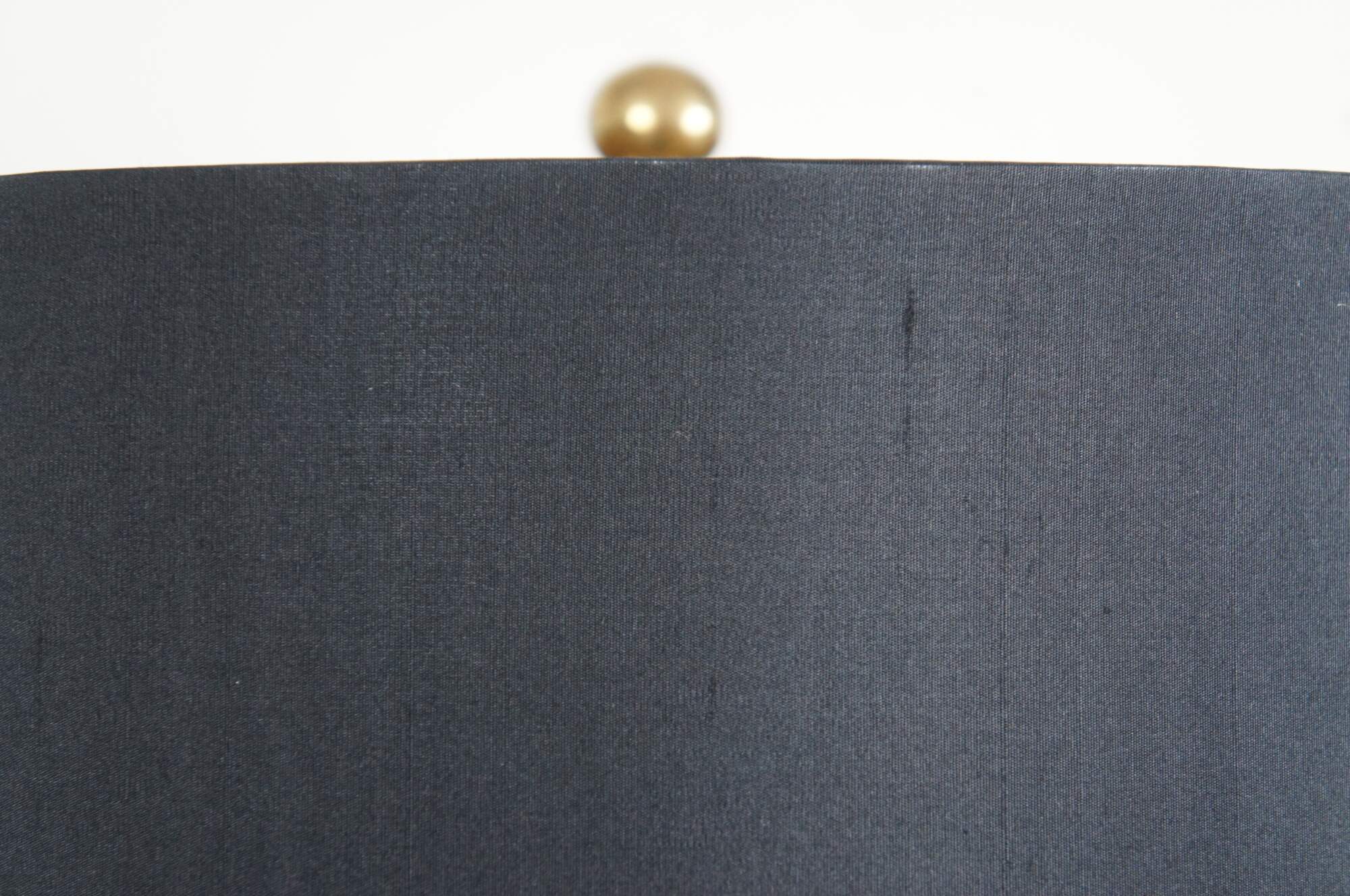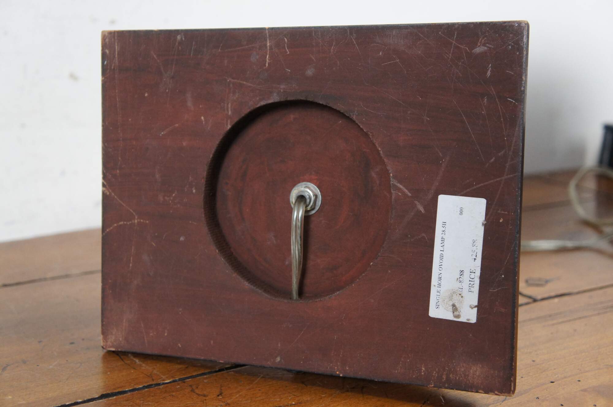 Vintage single horn Ovid lamp by John Richard. Square black and giltwood stepped base, brass column accented with a black and brown horn oval. Includes harp, brass orb finial and original black fabric drum shade with foiled interior.