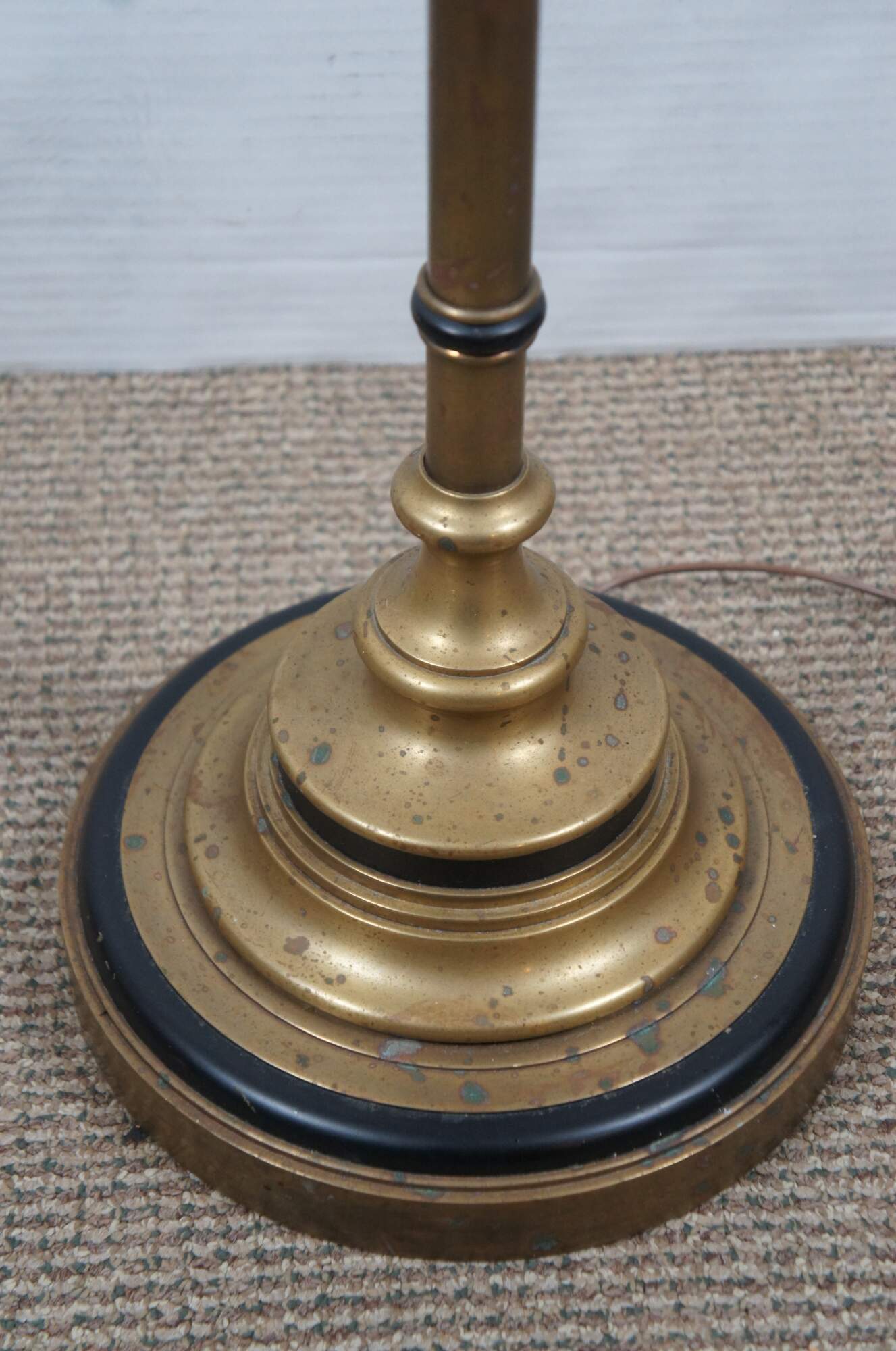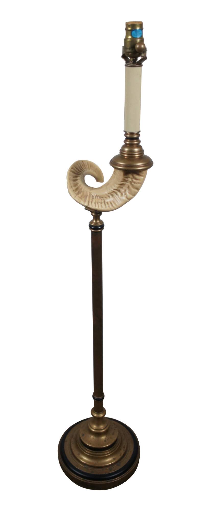 Circa 1970's Chapman Brass floor lamp featuring a round, stepped pedestal base and artificial ram's horn perched on the column body with black accents, leading to a faux candlestick top. Black paper shade with foiled interior. Includes harp and ball finial.