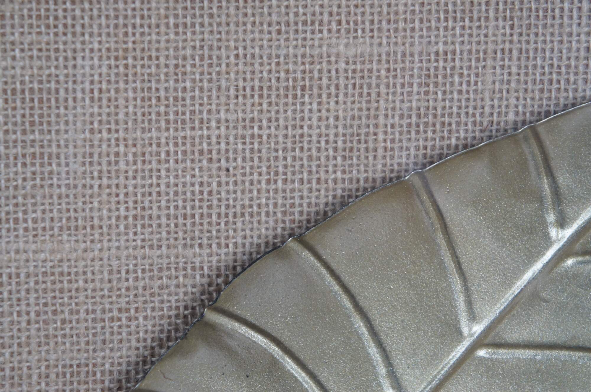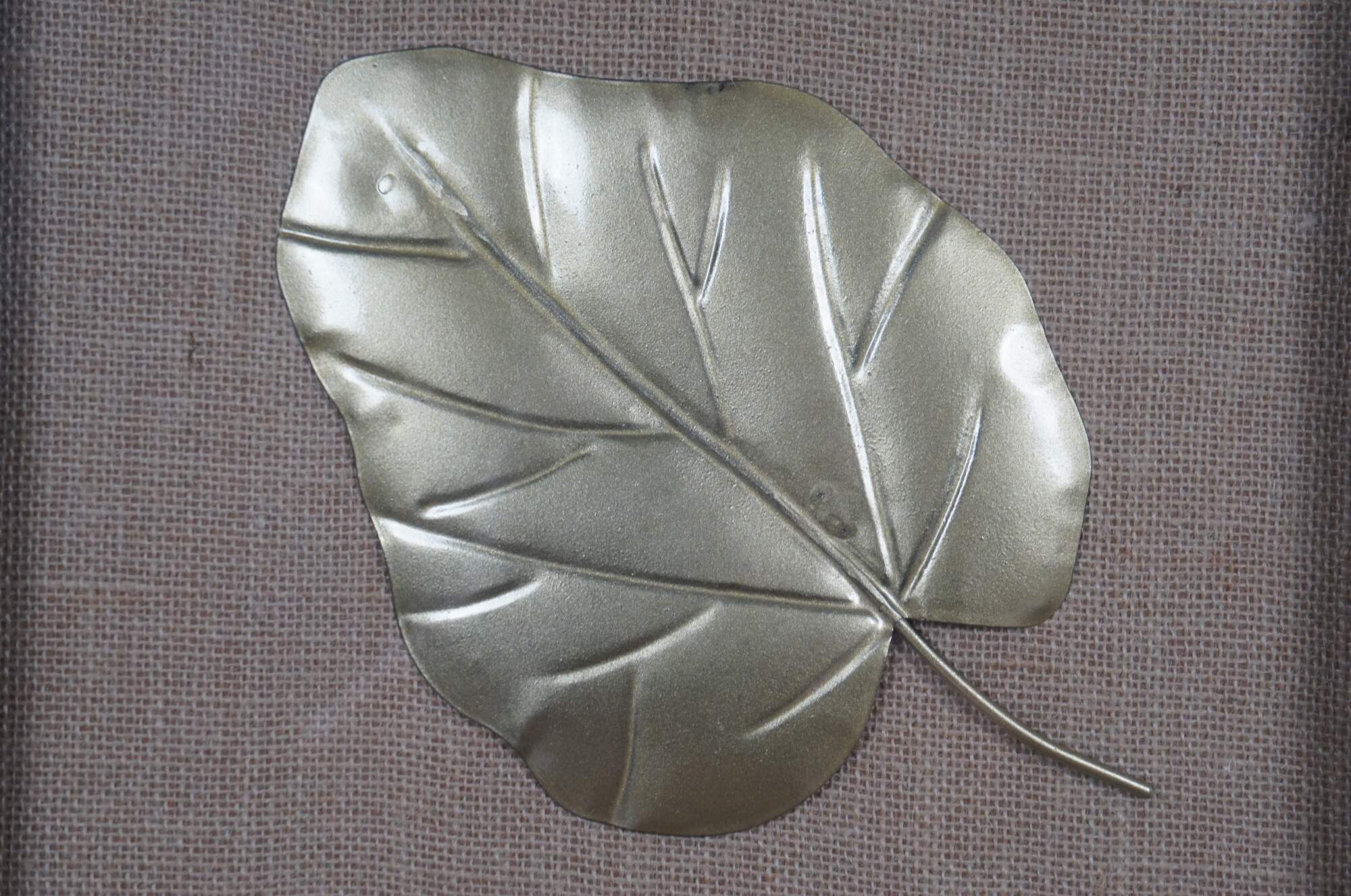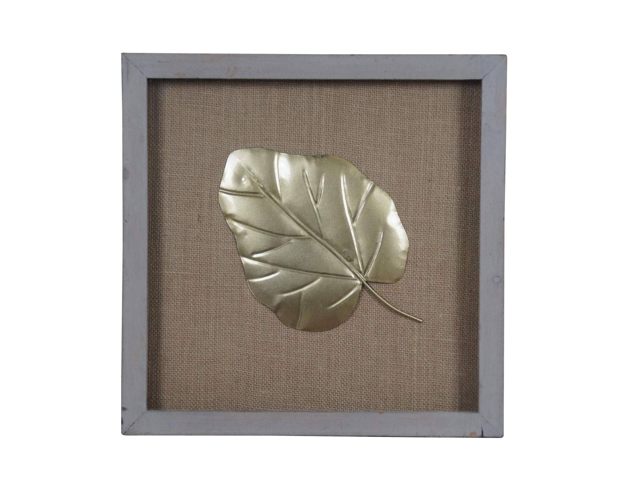Late 20th century pair of gold / gilt metal leaves set on plain burlap mats in shadowboxes framed in distressed, gray painted wood.