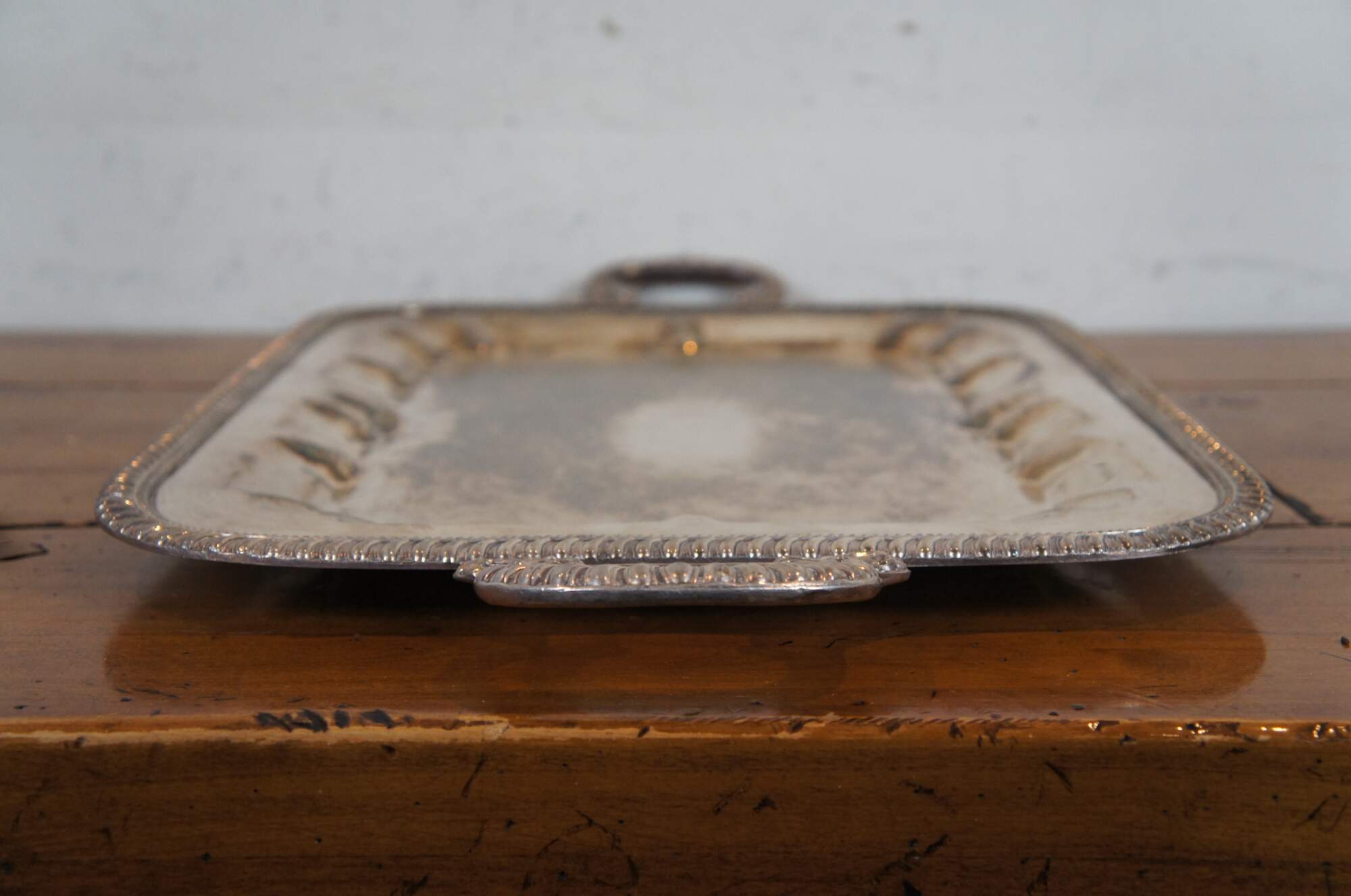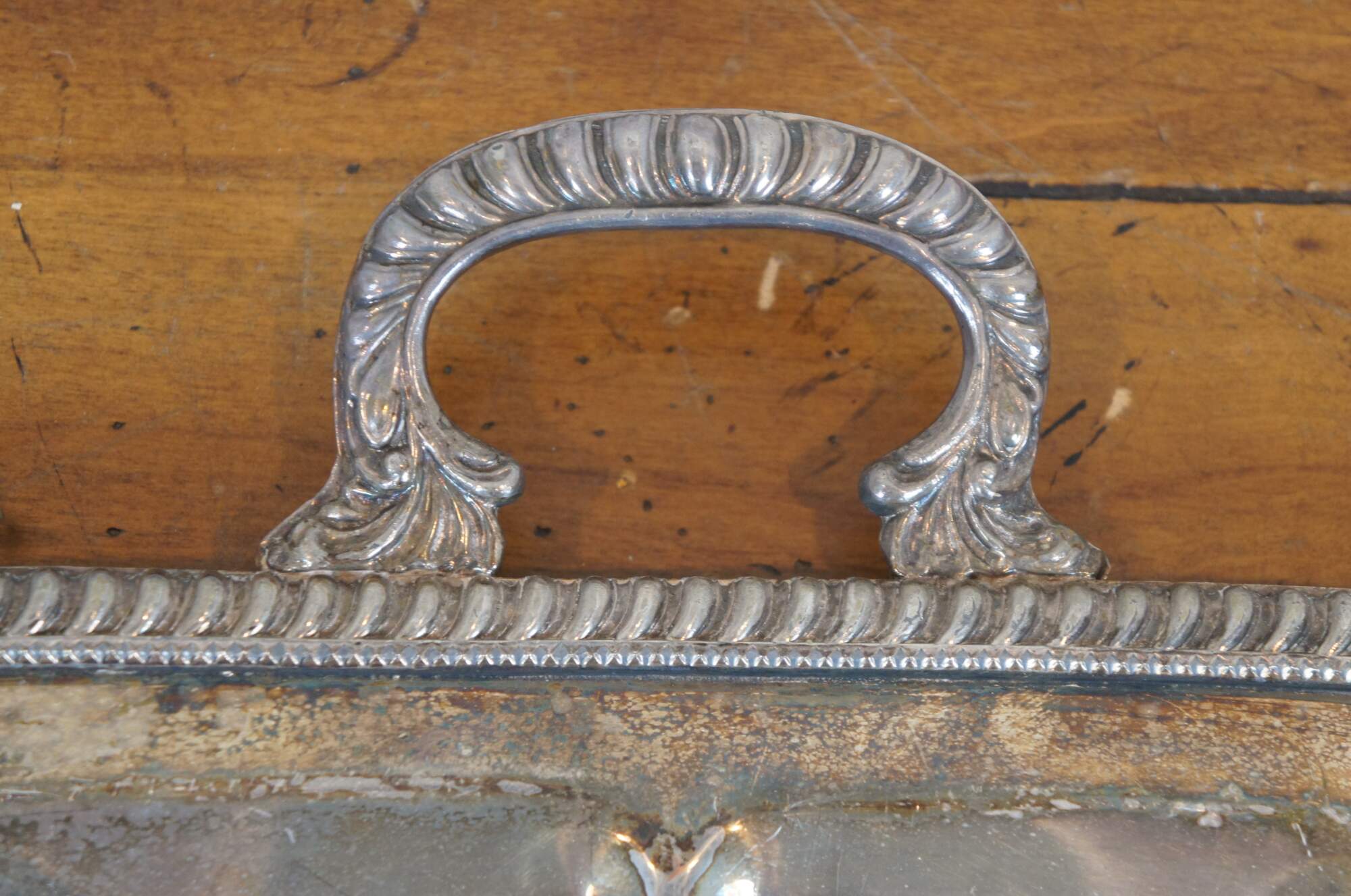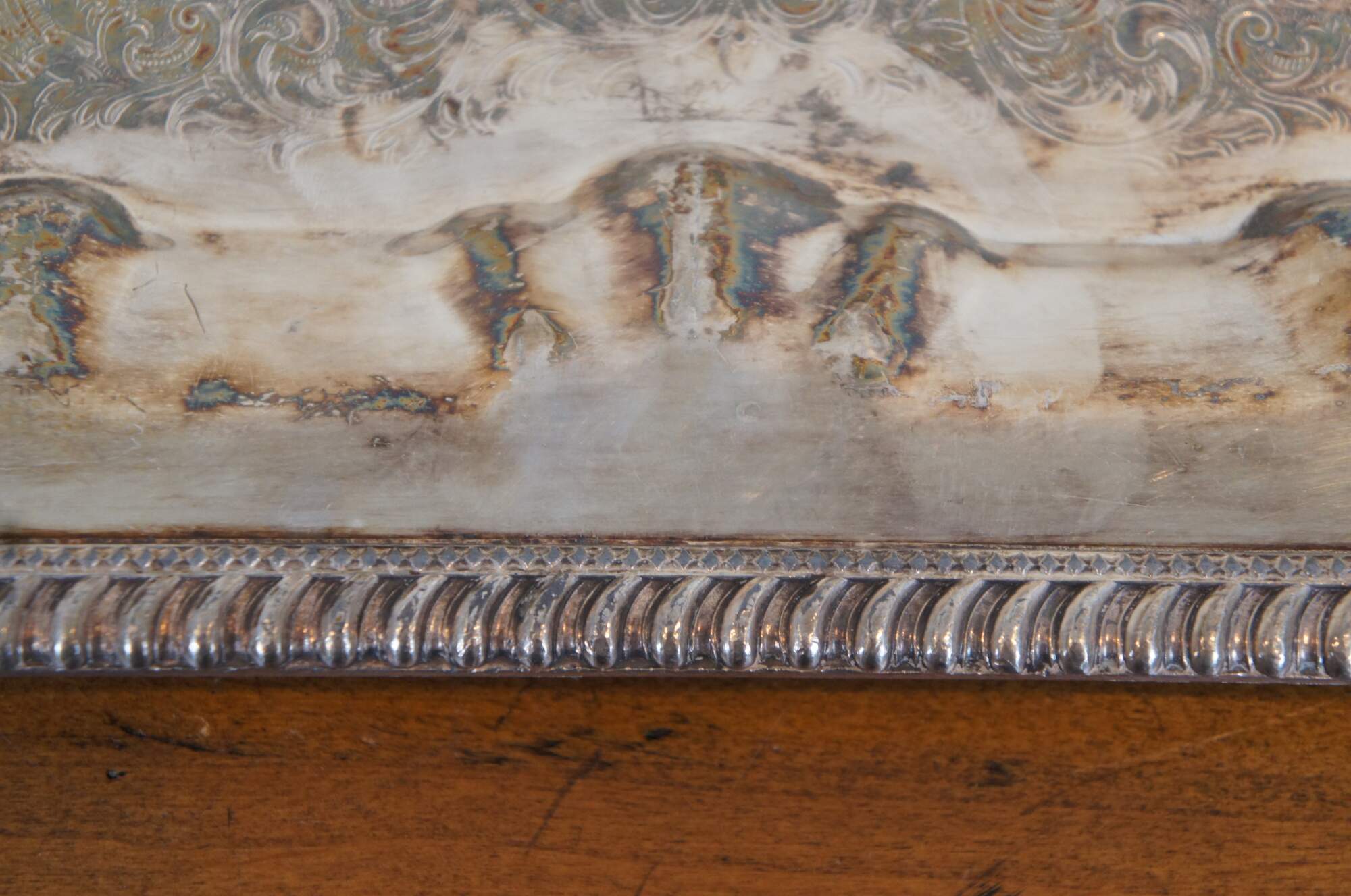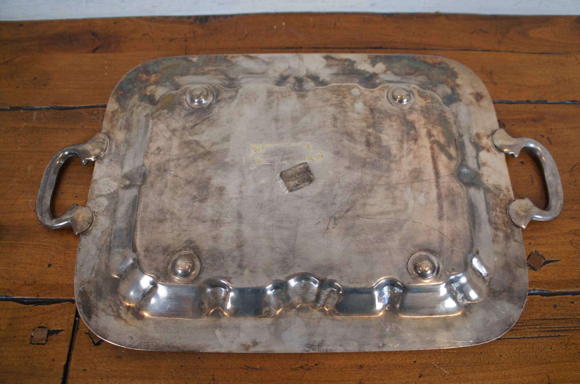 20th century silver plate butler's serving tray by Lehman Brothers Silverware Corp. Rectangular form with rope twist edge and handles, scalloped interior bevel, and surface etched with foliate/scalloped/floral motif.
