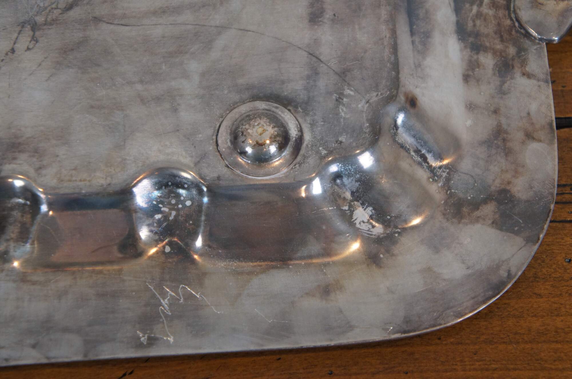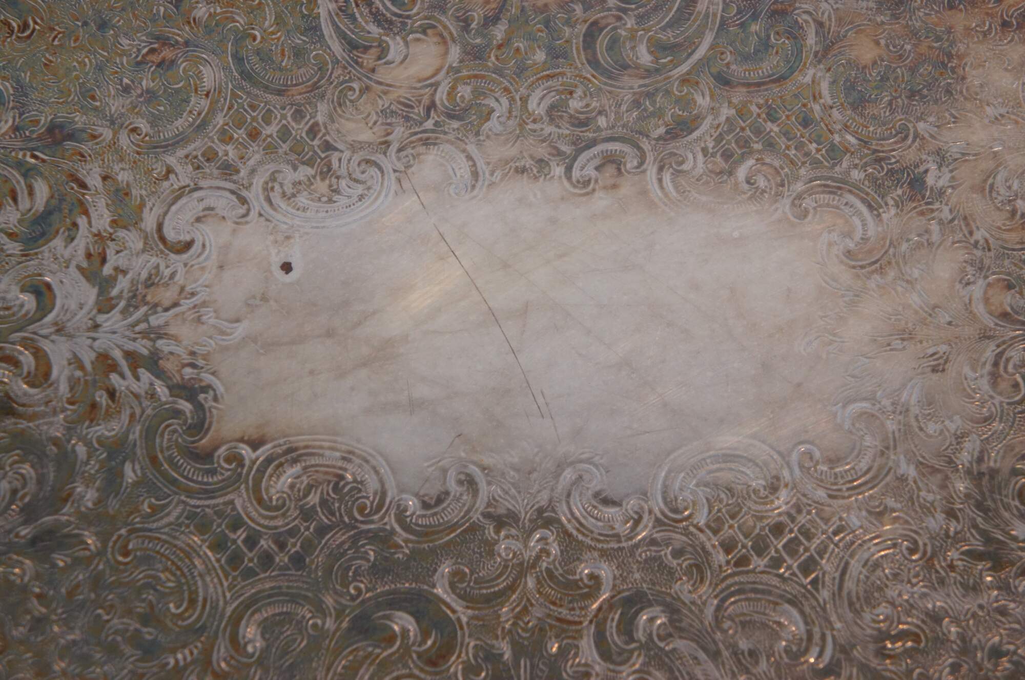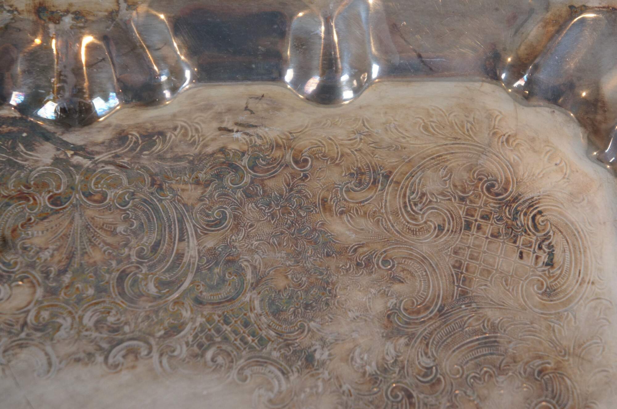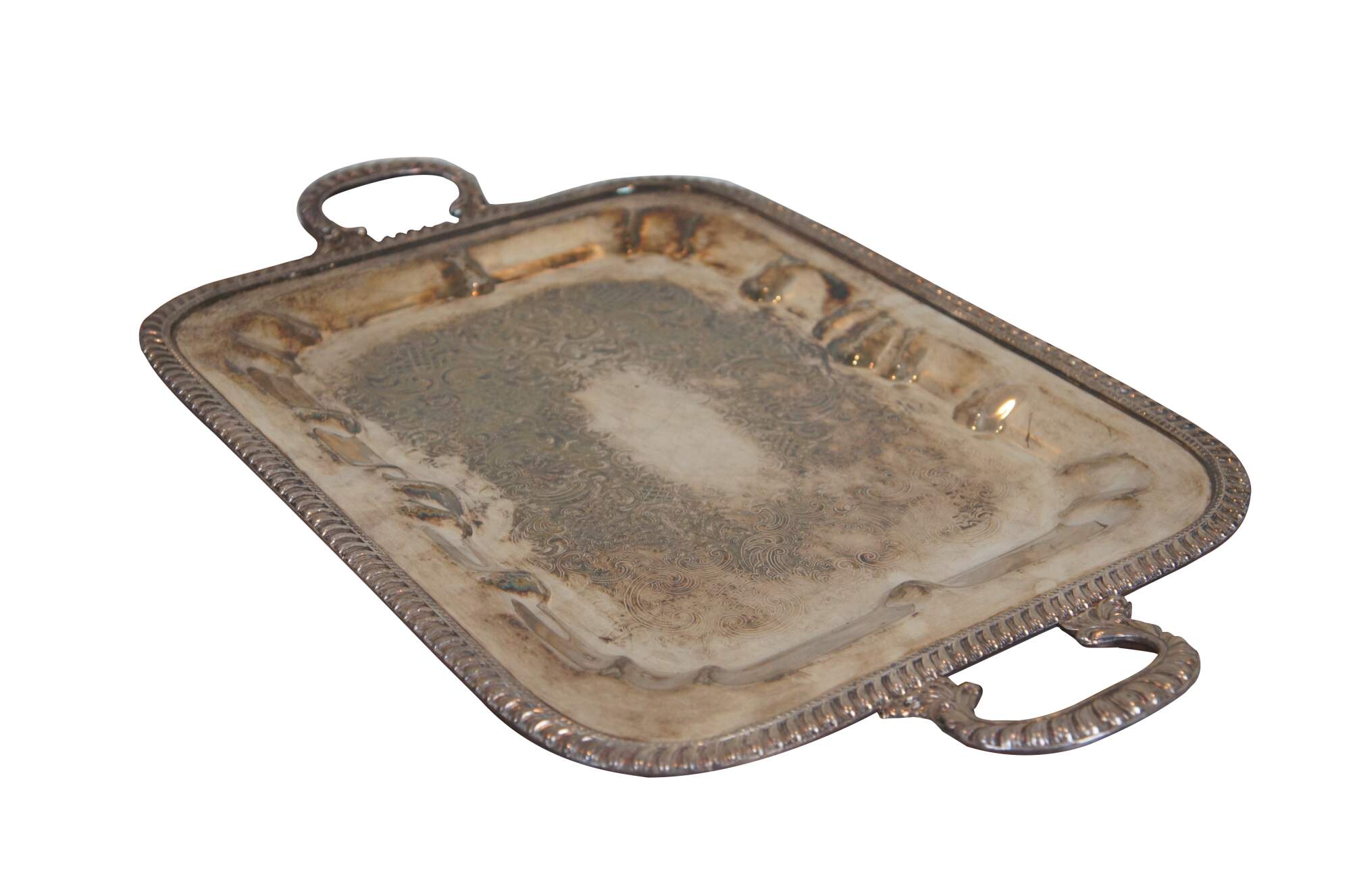 20th century silver plate butler's serving tray by Lehman Brothers Silverware Corp. Rectangular form with rope twist edge and handles, scalloped interior bevel, and surface etched with foliate/scalloped/floral motif.