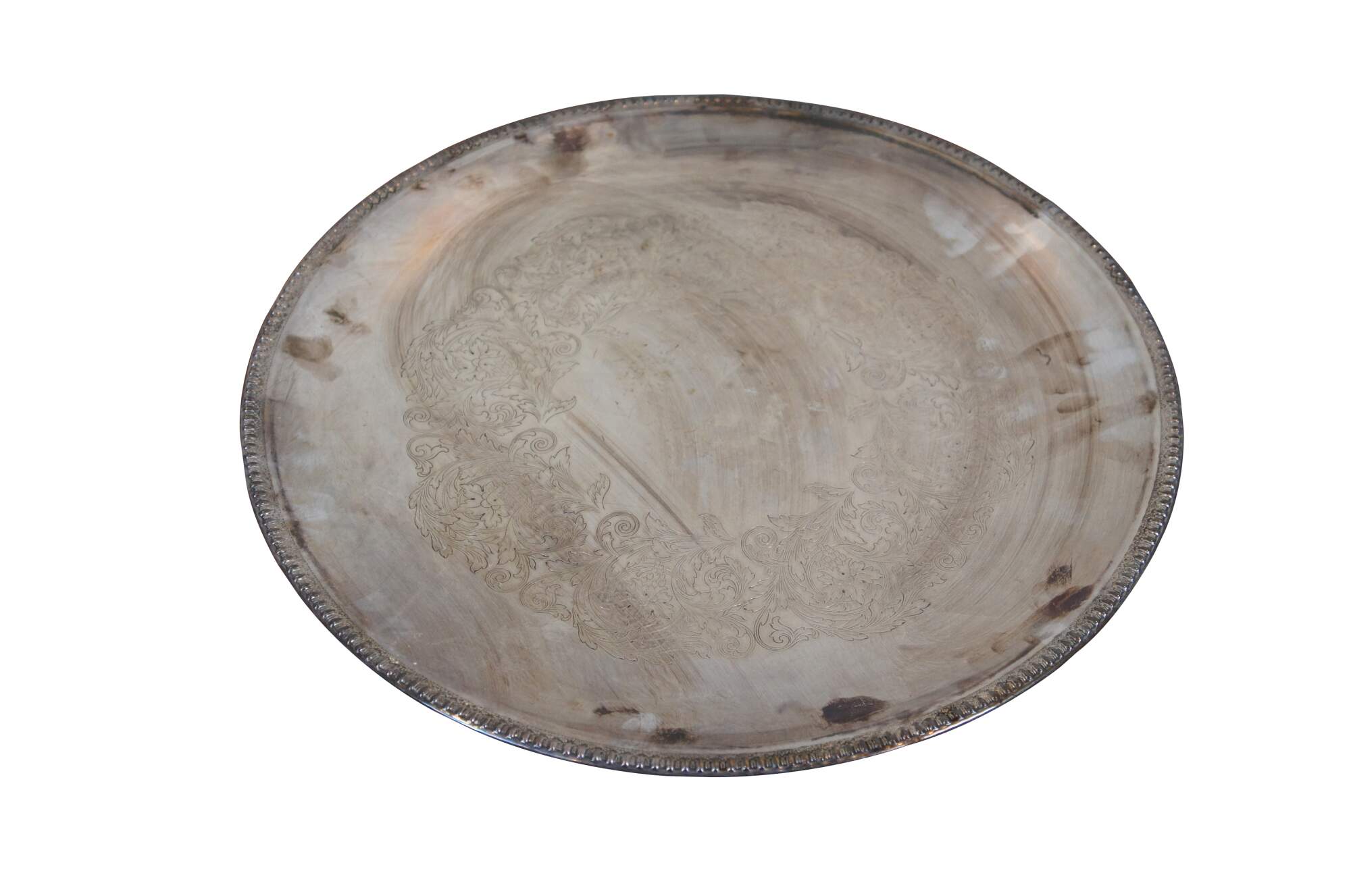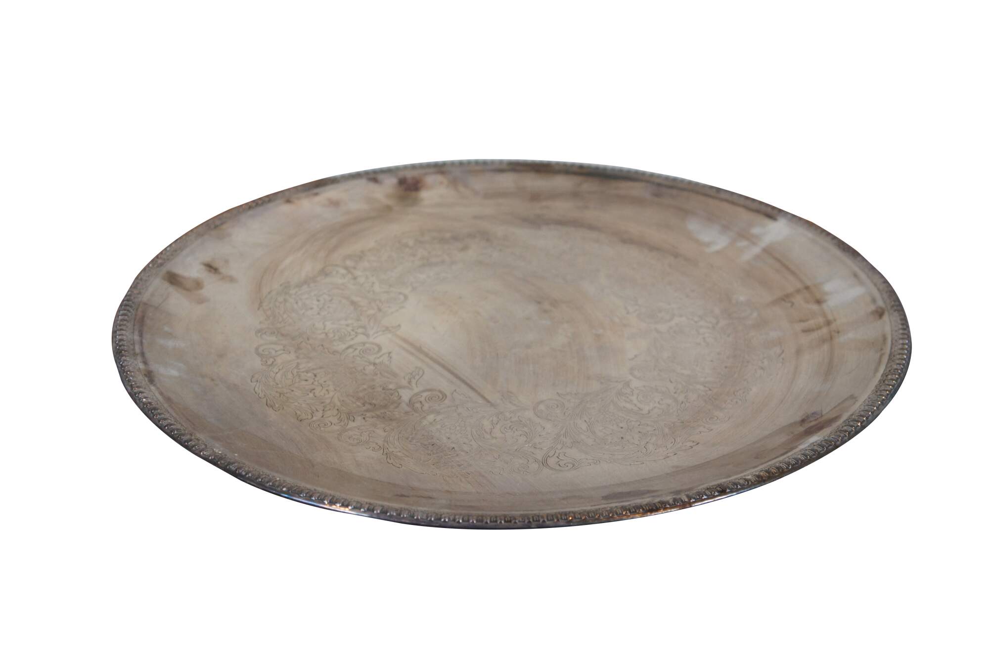 20th century Wilcox International Silver Plate serving platter / tray, in the Brandon Hall pattern. Round form with rope twist edge and surface etched with scrolling foliate/floral motif.
