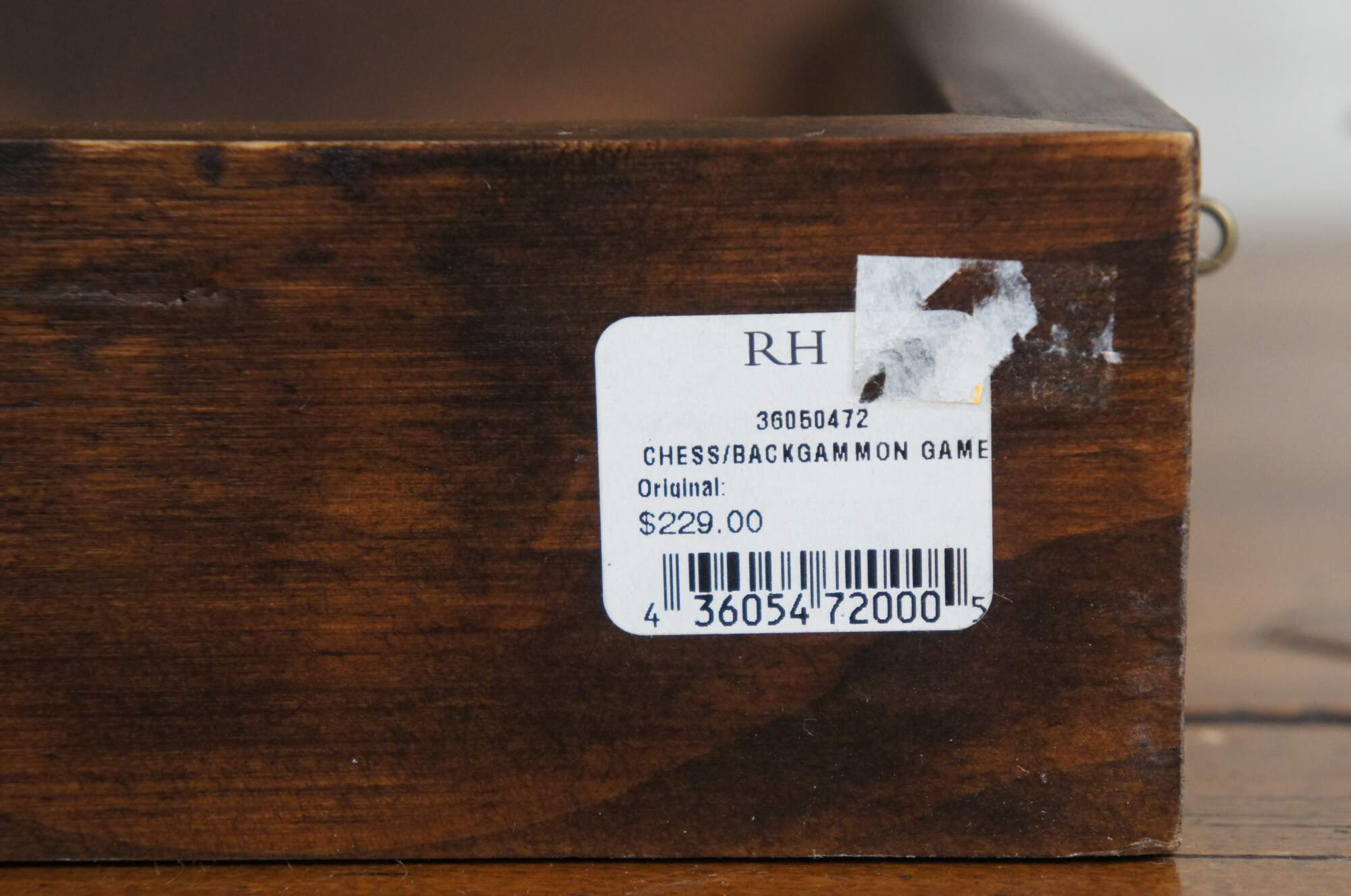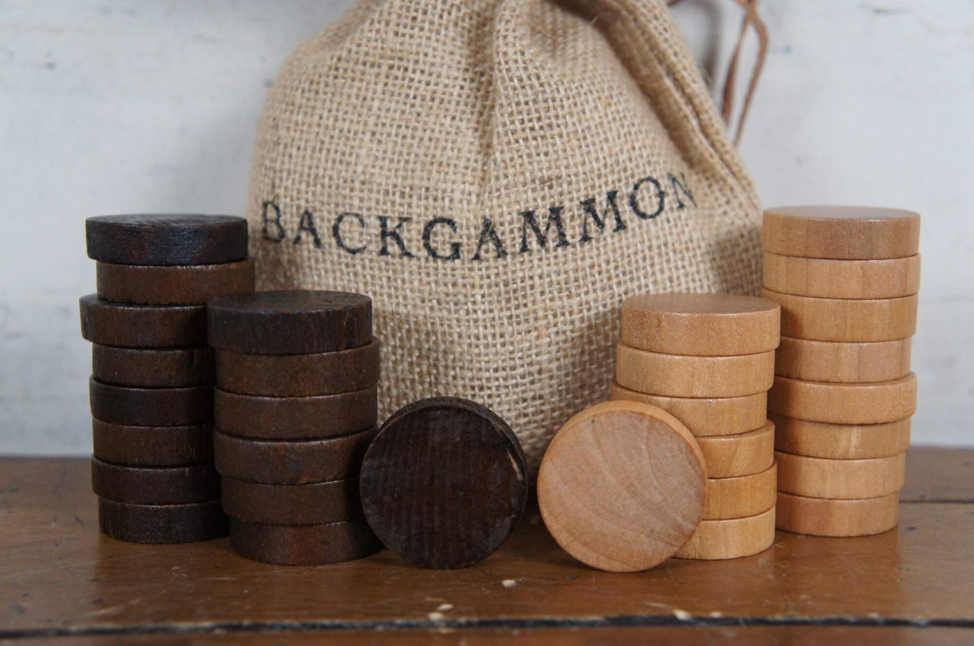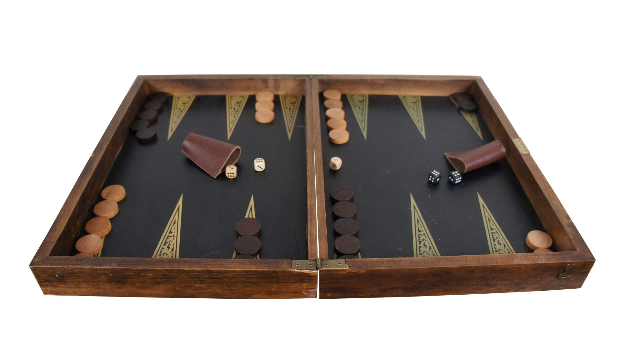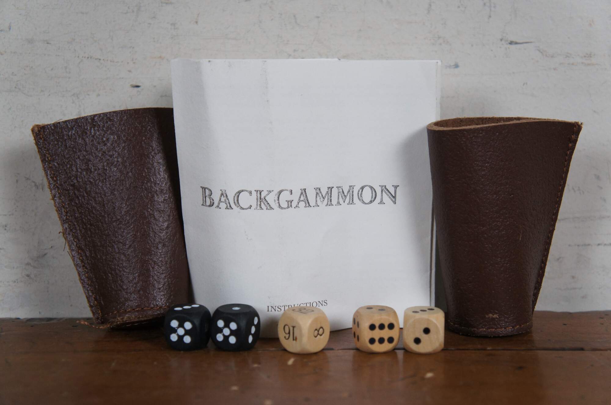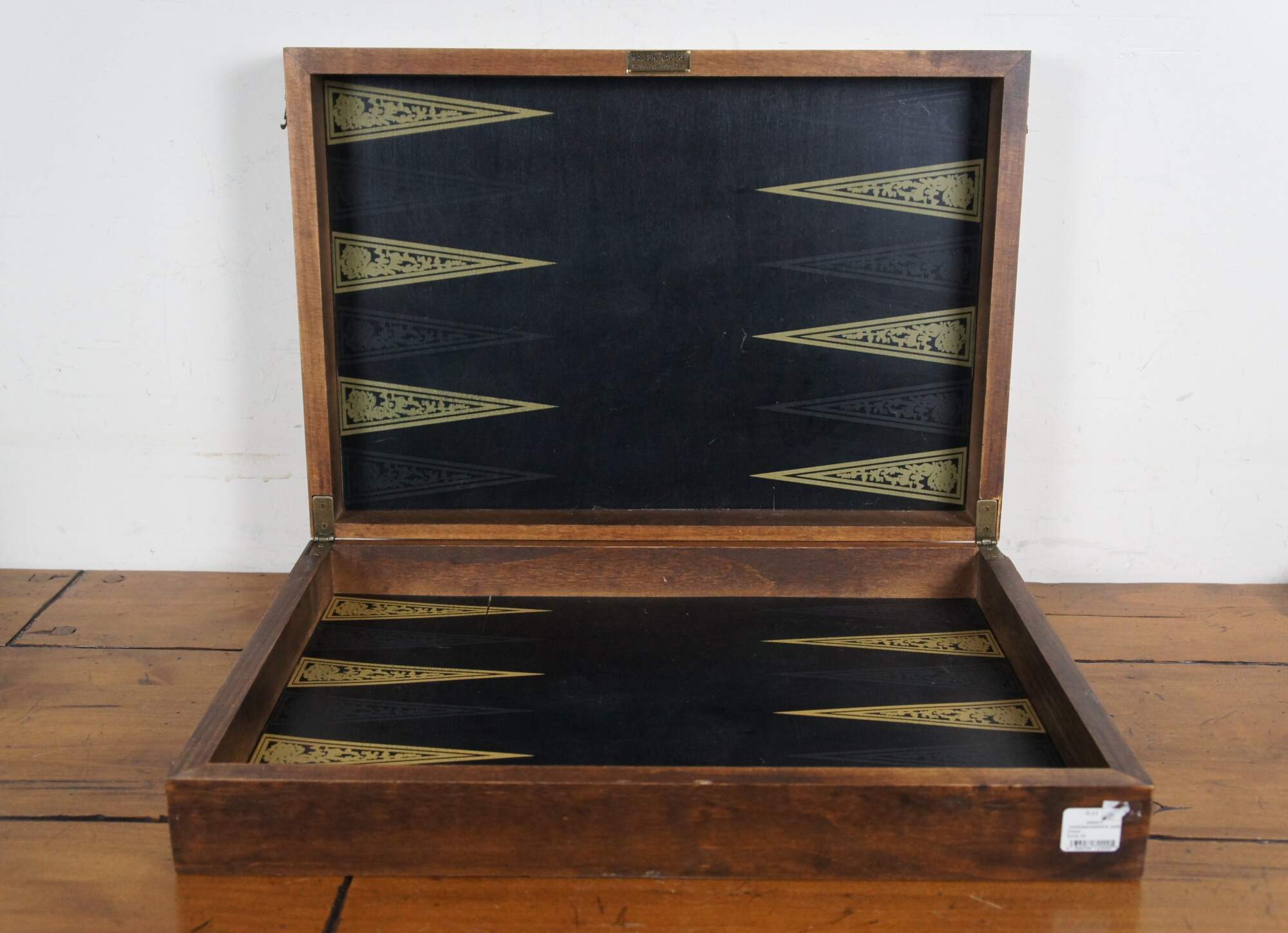Late 20th century chess / backgammon game set by Restoration Hardware. Reversible, folding, hardwood gameboard case. Wooden game pieces and dice. Leather backgammon cups. Labeled burlap storage bags for pieces and instructions for playing both games. Brass plaque reads "Maison, Nautre / 26. Bd. de Strasbourg, Paris." Made in China.