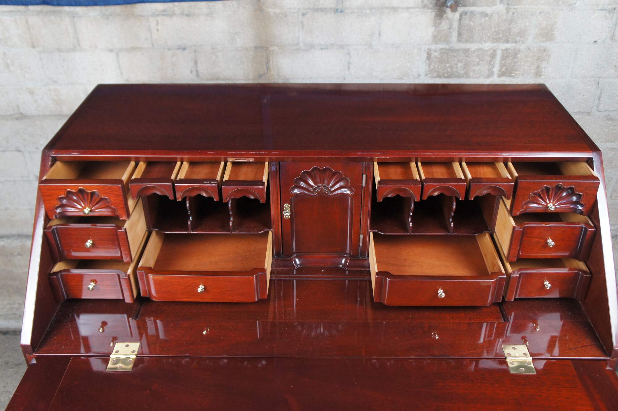 Kindel Winterthur Collection Mahogany Goddard Townsend Blockfront Secretary Writing Desk. Made from mahogany with a high sheen finish. This exception example of a late 18th century piece features an ornately scalloped slant front over three graduated dovetailed drawers with solid brass batwing hardware. The dropfront opens to 17 additional drawers and pigeon holes. The secretary is supported by bracket feet.