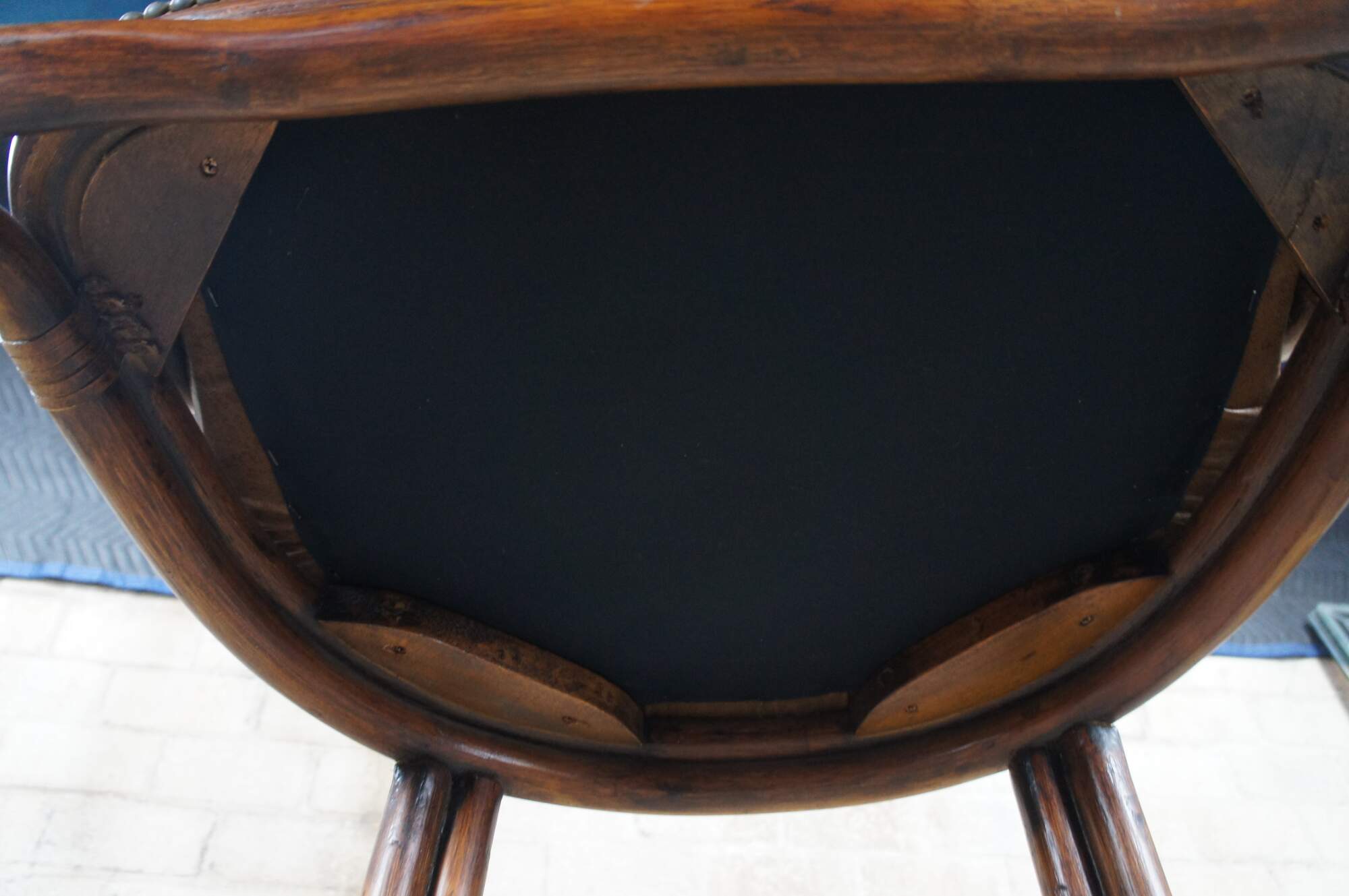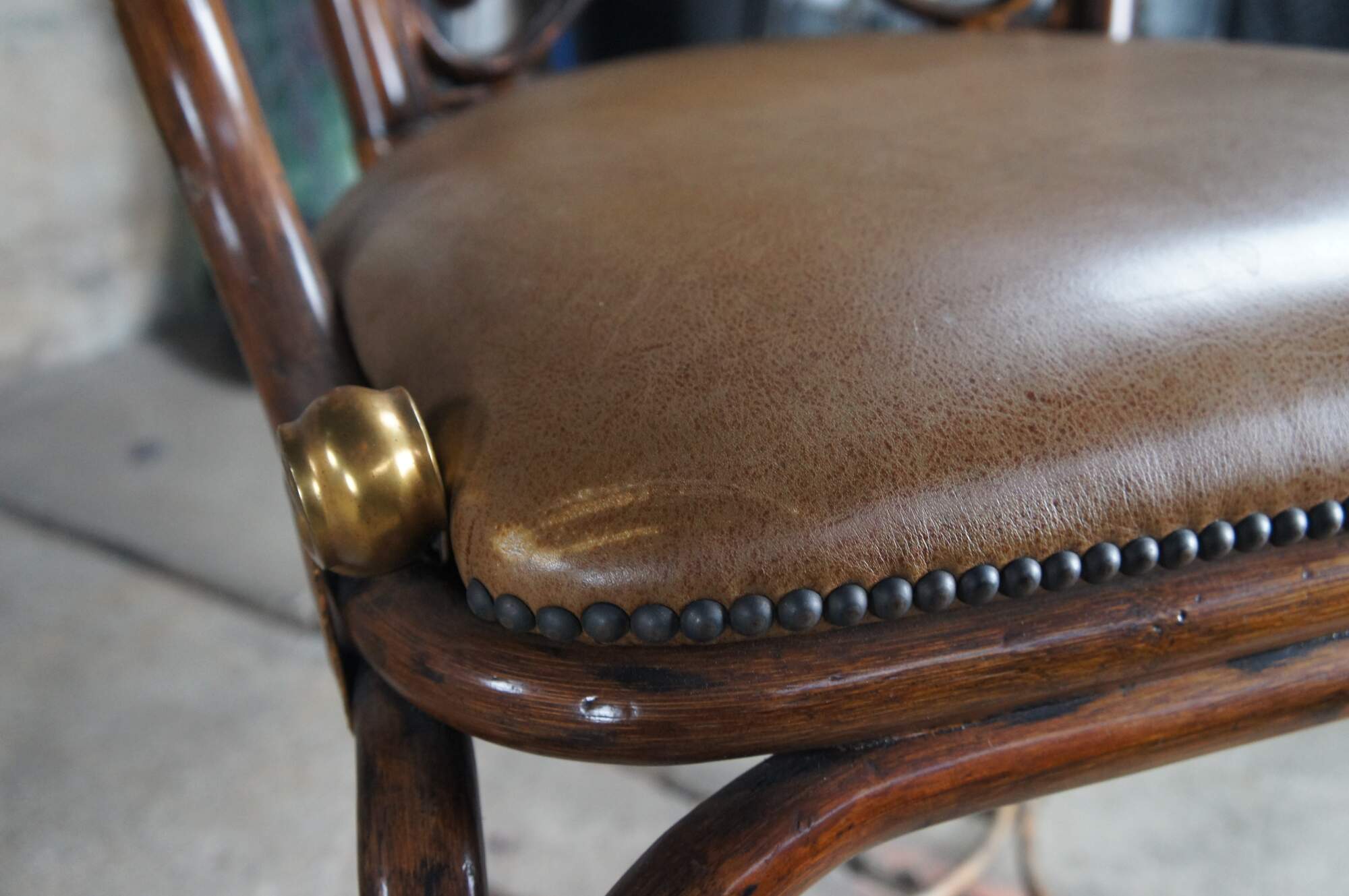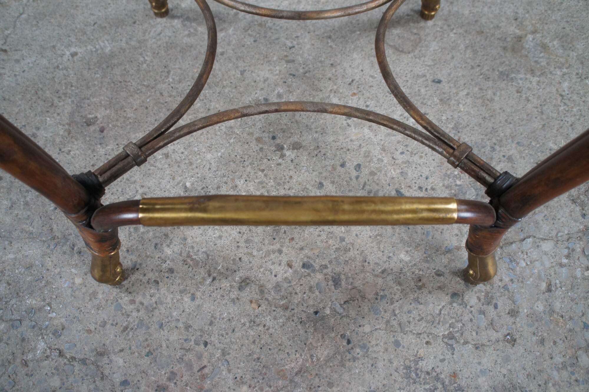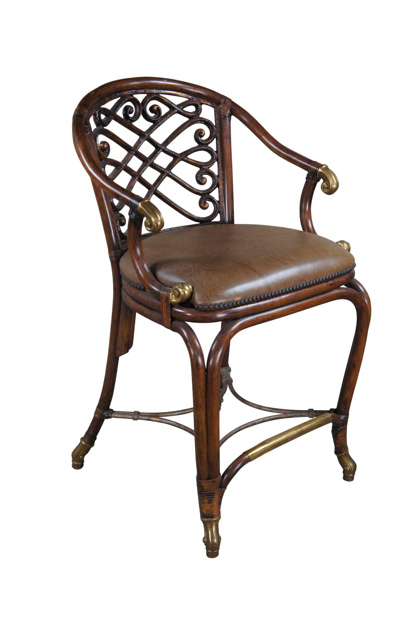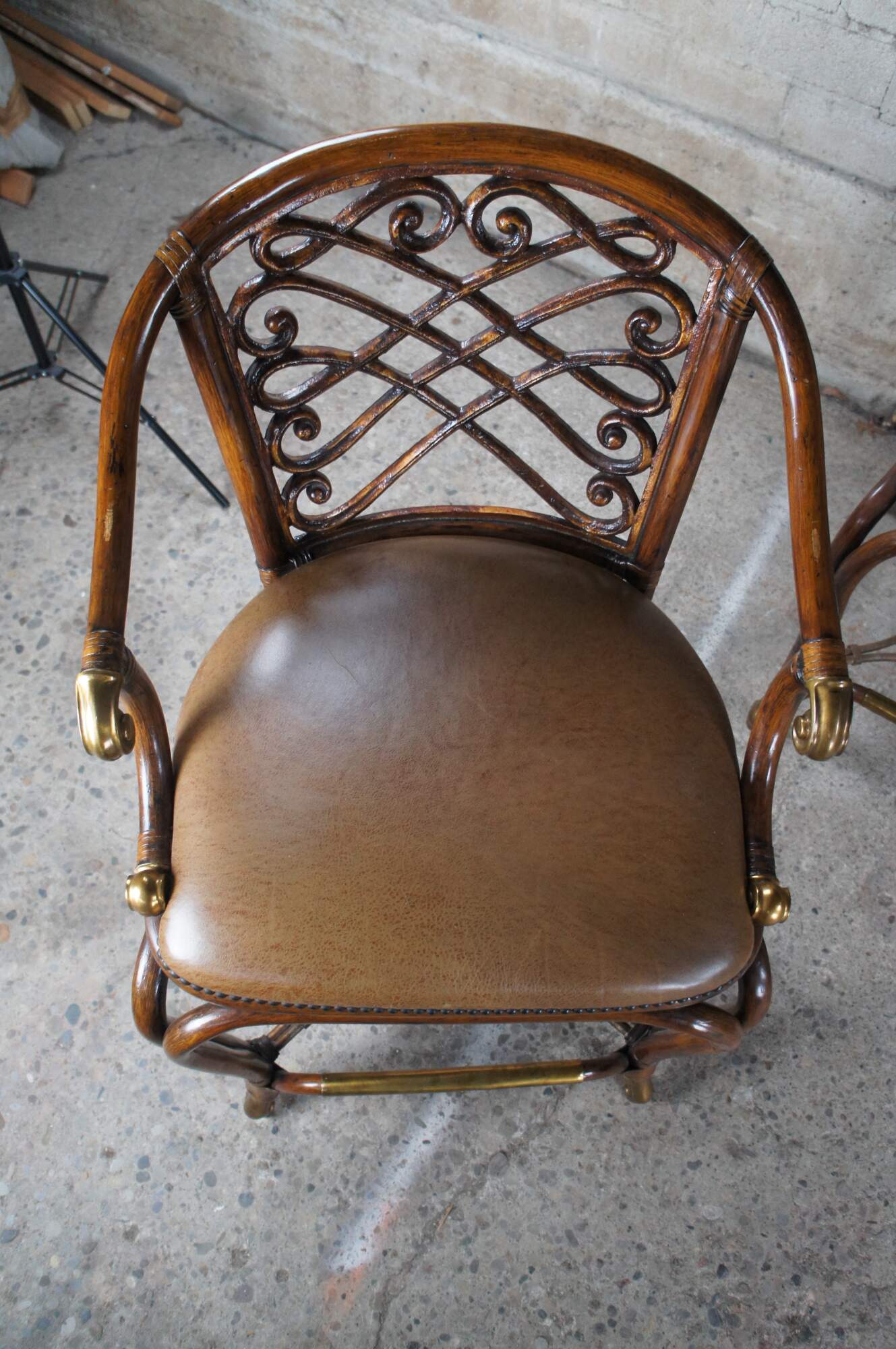 4 vintage Maitland Smith Bohemian Modern counter height bar stools. Features a faux famboo frame with leather seat, brass and rattan accents. Each chair has a contoured crest rail and scrolled back. A warm addition to any space.