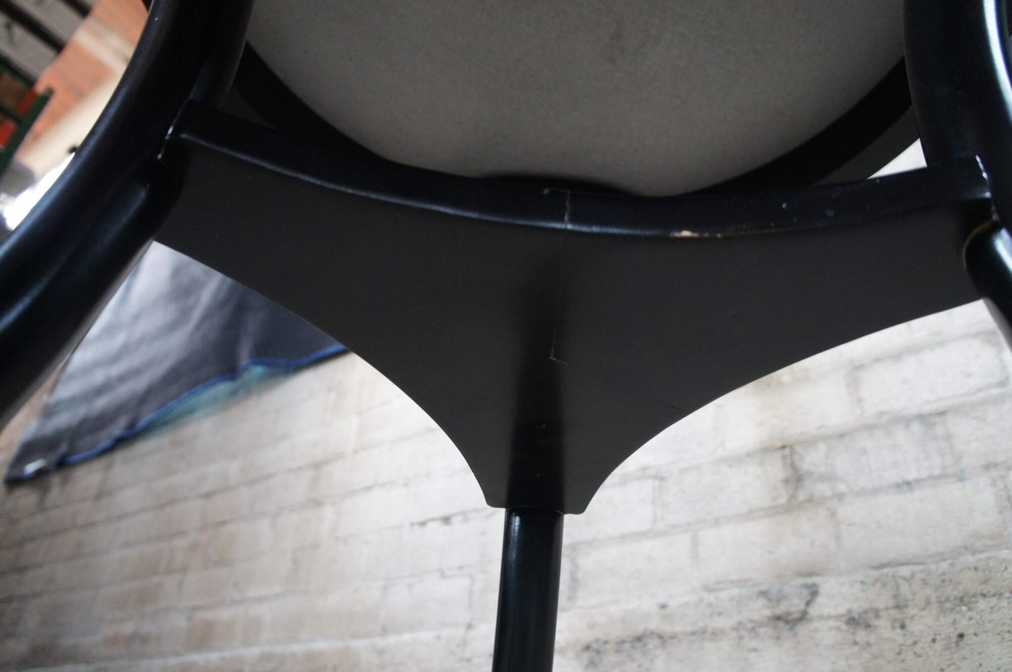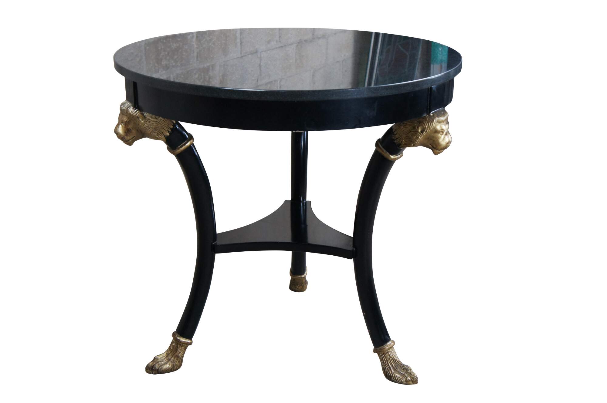 Late 20th Century Baker Furniture Empire / Regency / Neoclassical inspired Gueridon side table. Features a hardwood ebonized frame with dark granite top. The round form is supported by three contoured legs with gold finished lion heads beneath the frieze leading to a triangular trestle or shelf and ornate gold paw feet. The granite top is great touch for this kind of table as it much more stain resistant than marble. Great for use as a lamp / corner table, center (centre) table or bedside nightstand or accent piece.