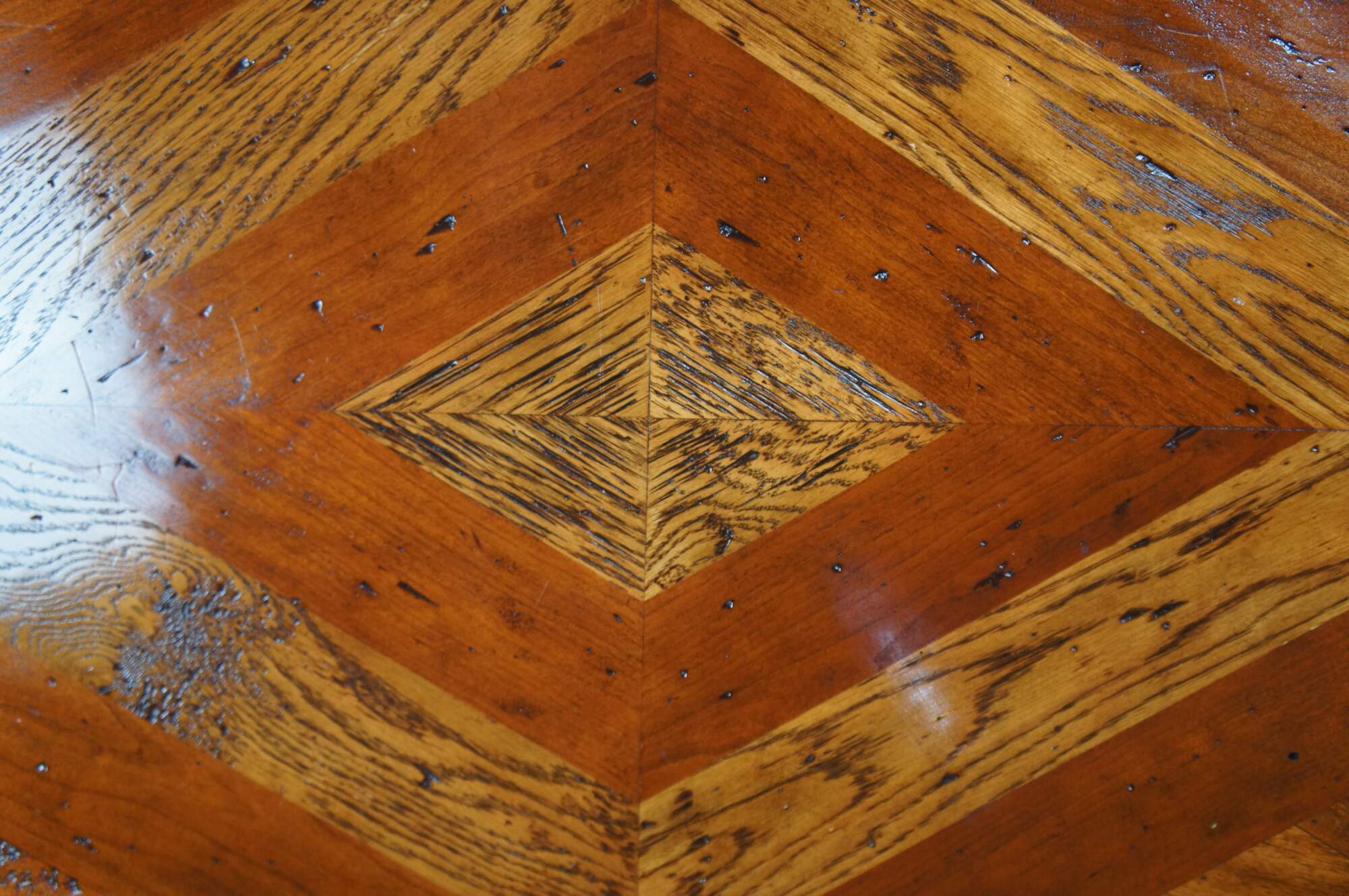 Vintage Theodore Alexander Brunello Sera Cocktail Table; 5100-182. Features a geometric lozenge parquetry fashioned out of hand selected acacia, oak and parawood. Concealed drawers provide storage space without detracting from the look of the piece, which includes decorative wood grain paneling along the frieze and base. Inset brass bands separate the wo levels of wood on each side. The tables low modern form blends well in any mid century modern, contemporary or traditional space. A unique find as this table is sold out quickly and rarely comes to market.